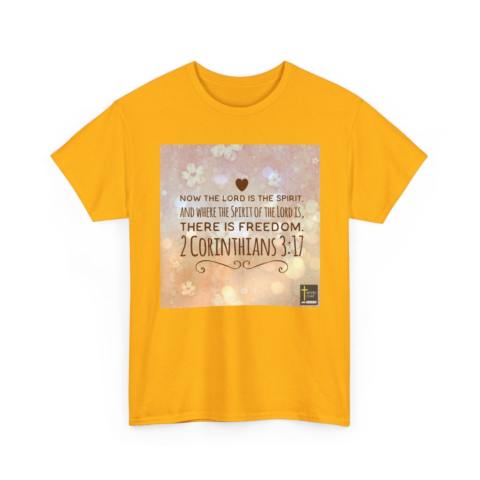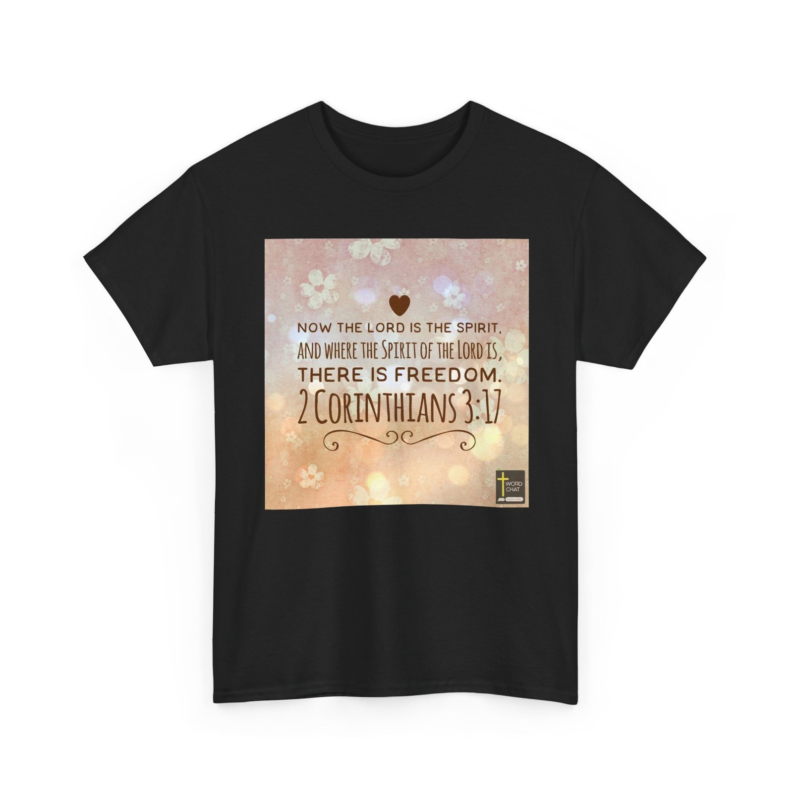 The image features a soft, pastel-colored background with delicate white floral elements and bokeh light effects, creating a gentle, ethereal atmosphere. Centered on this dreamy backdrop is a biblical quote from 2 Corinthians 3:17, which reads: “Now the Lord is the Spirit, and where the Spirit of the Lord is, there is freedom.” The text is displayed in a warm brown color, using a handwritten-style font that adds a personal and intimate feel to the scripture. A small brown heart sits above the text, symbolizing love and spiritual connection. The image is branded with a “WordChat” logo in the bottom right corner.