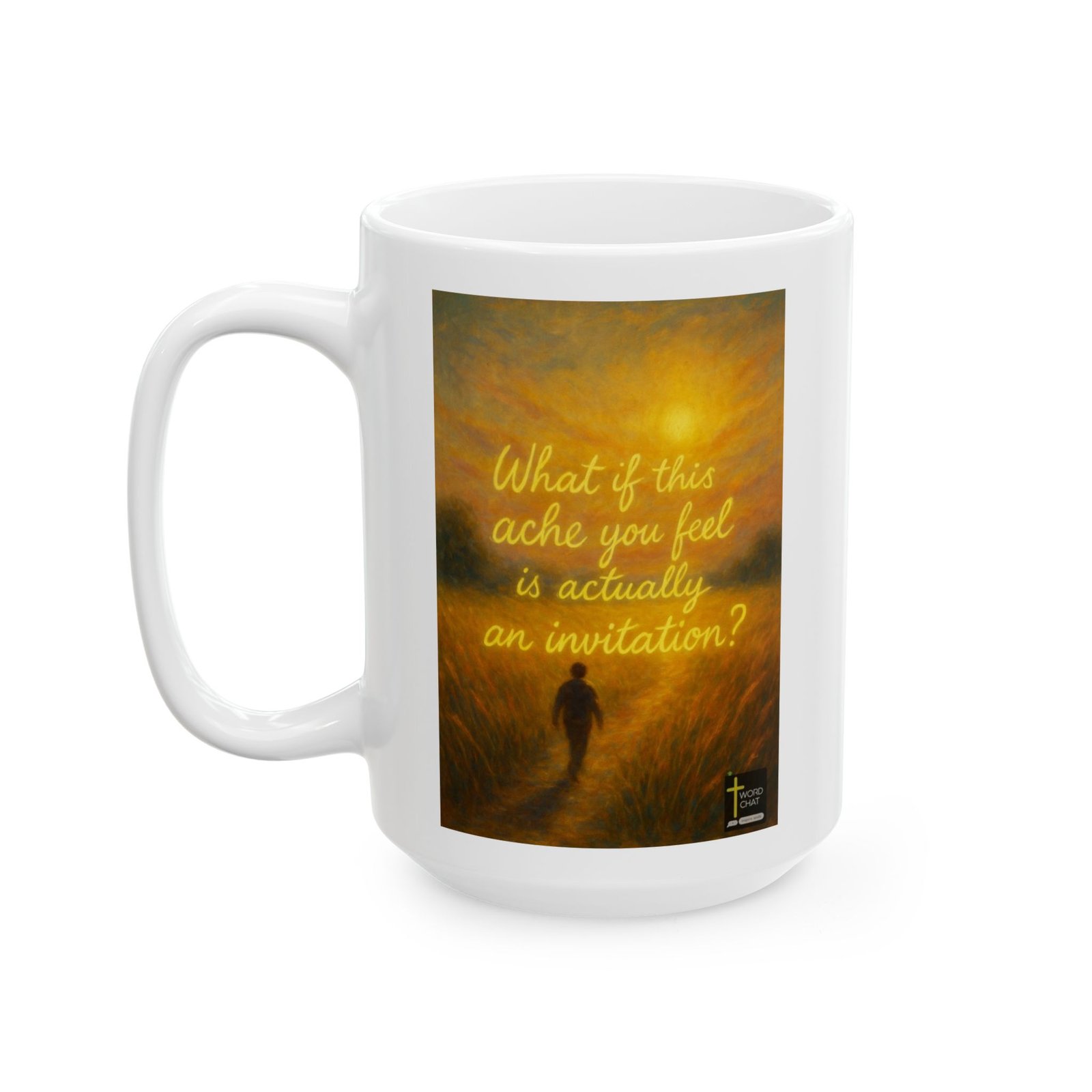 This evocative digital artwork features a solitary silhouetted figure walking through a golden wheat field toward a luminous light source in a warm, glowing sky. The image employs a painterly style with rich amber, orange, and yellow tones that create an ethereal, spiritual atmosphere. Overlaid in elegant golden script text is the thought-provoking quote: “What if this ache you feel is actually an invitation?” The composition symbolizes spiritual journey, inner growth, and the transformative power of emotional and physical pain. The WordChat logo with a cross symbol and “inspire souls” tagline appears in the bottom right corner, identifying this as inspirational religious content designed for motivational sharing.