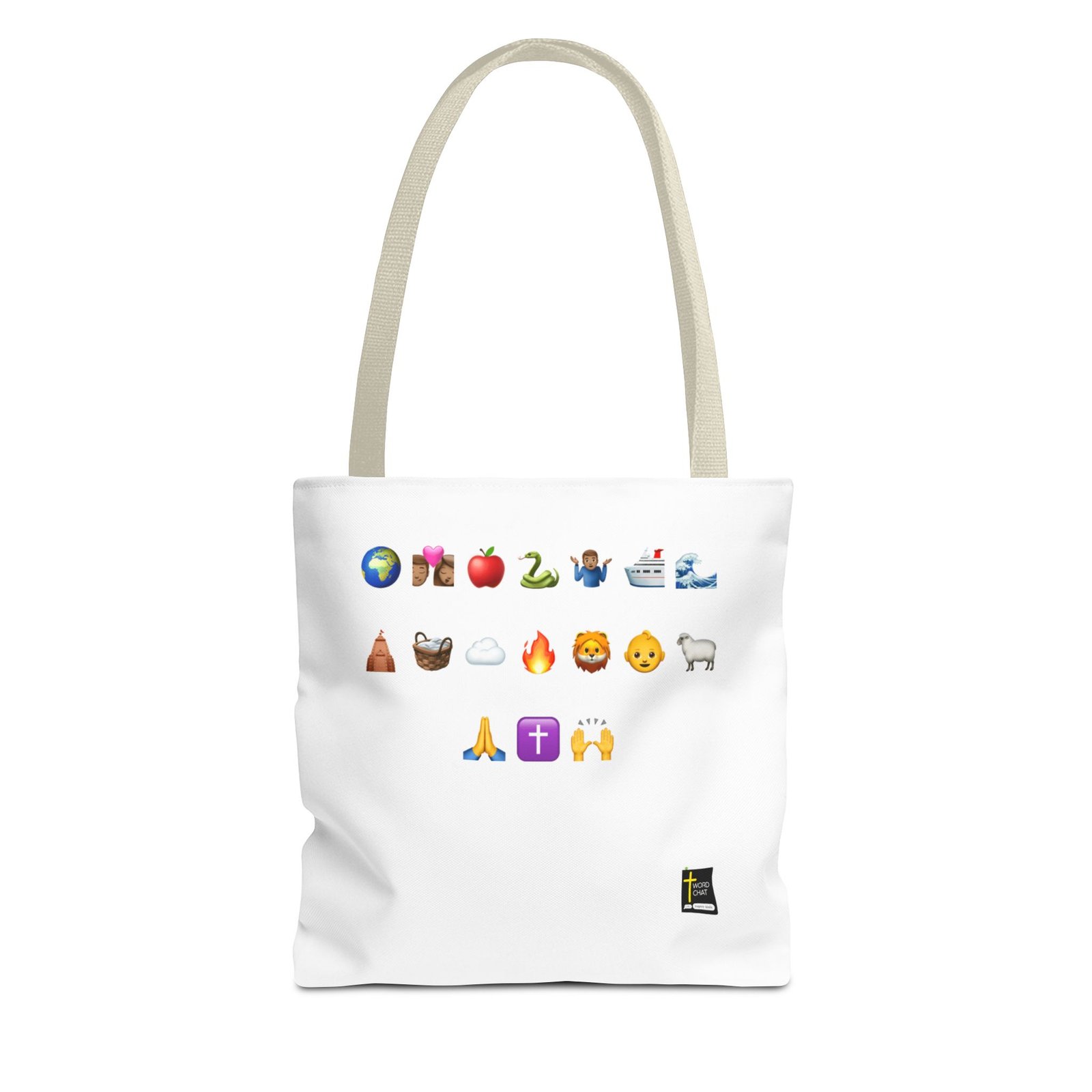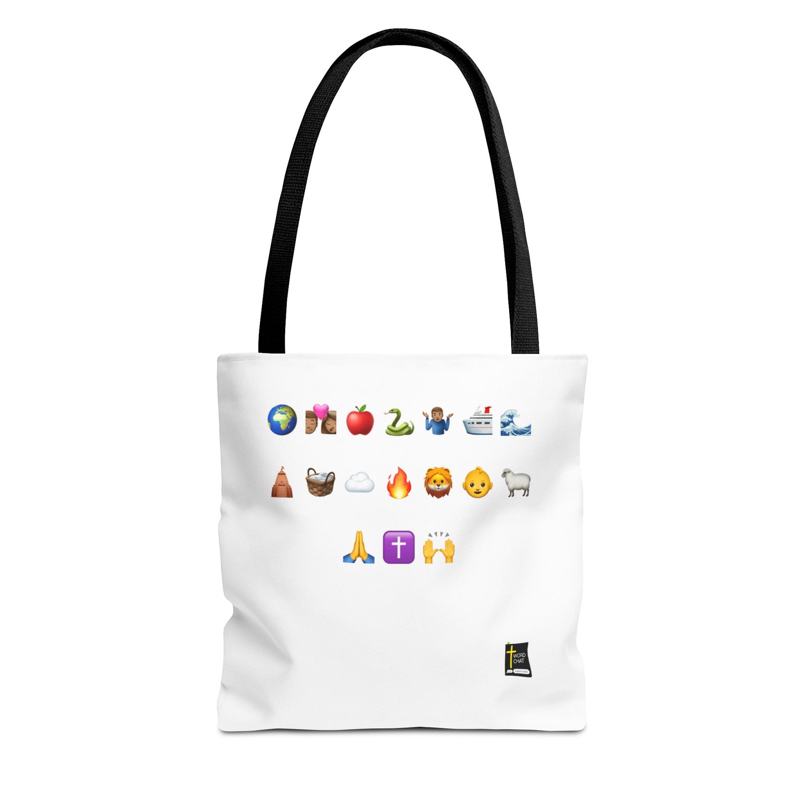 This image displays the story of the Bible as a collection of 17 emojis arranged in a grid format, representing various themes and concepts. The emojis include the world, Adam and Eve, the apple, the serpent, Noah, the ark (cruise style), the flood, the tower of Babel, Moses in a basket, a cloud, fire, the lion, baby Jesus face, the lamb, praying hands, a cross symbol, and praise hands. The style is characteristic of modern emoji design with rounded shapes and expressive features. These icons appear to be organized to convey messages related to nature, spirituality, emotions, travel, and human connection. There is a small WordChat logo in the bottom right corner.