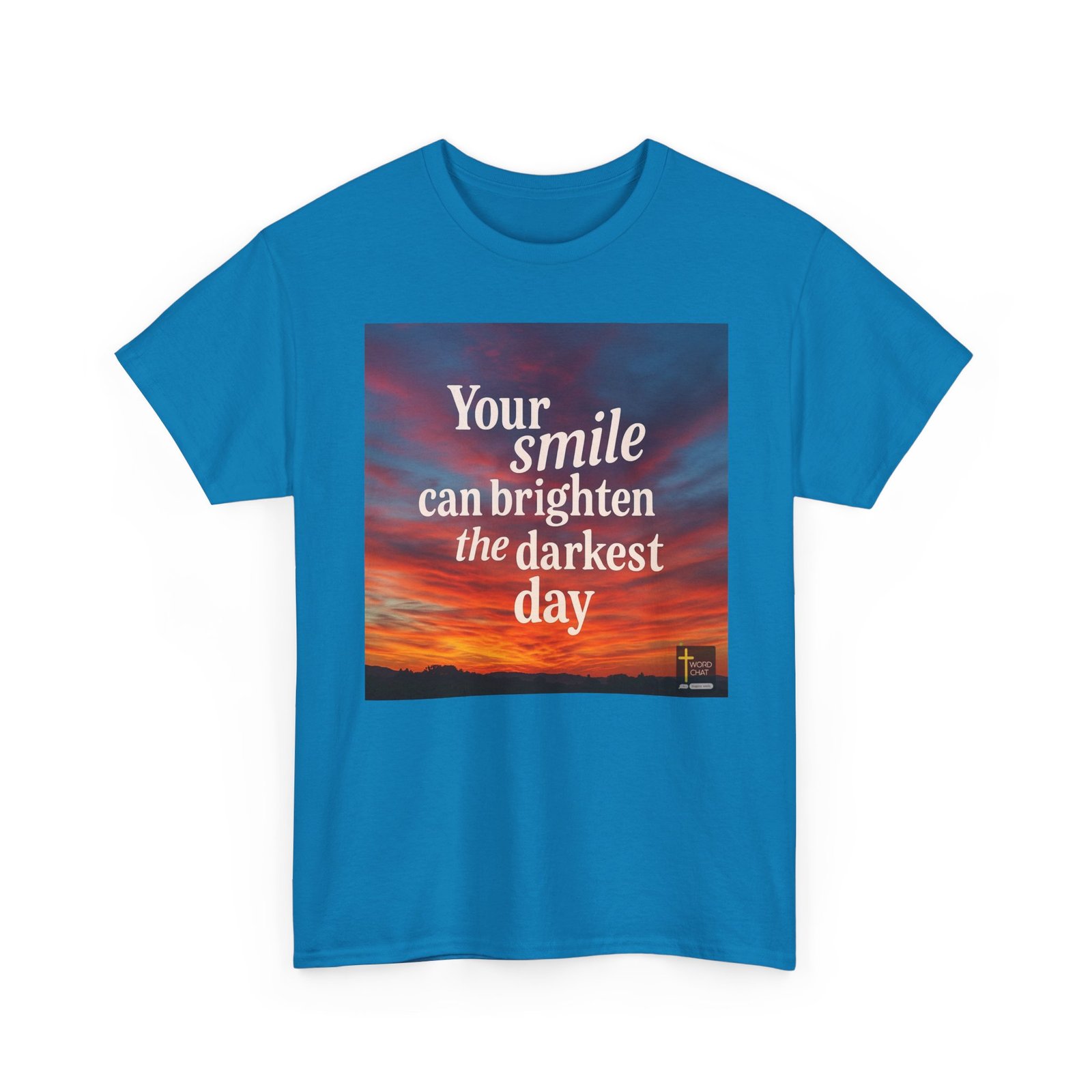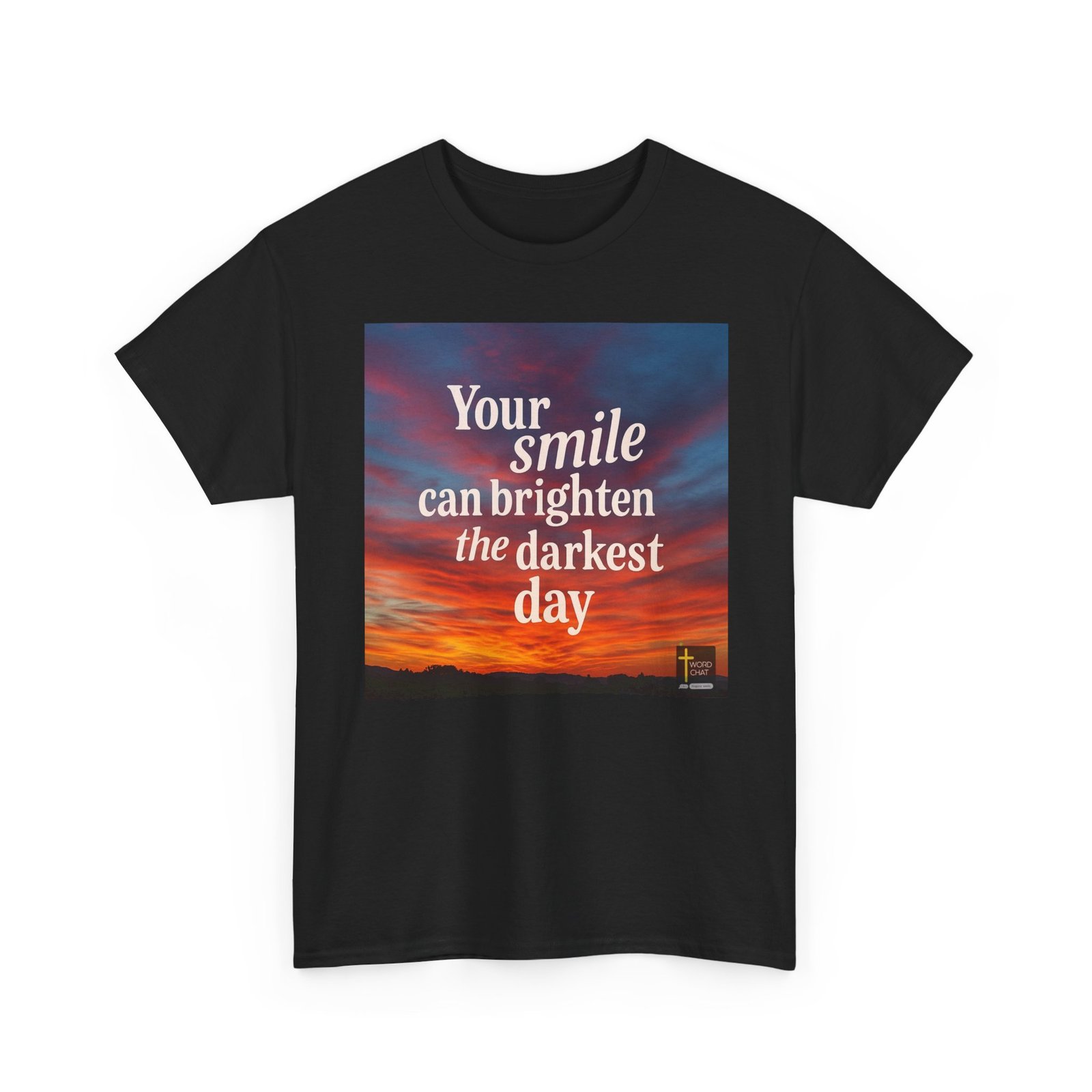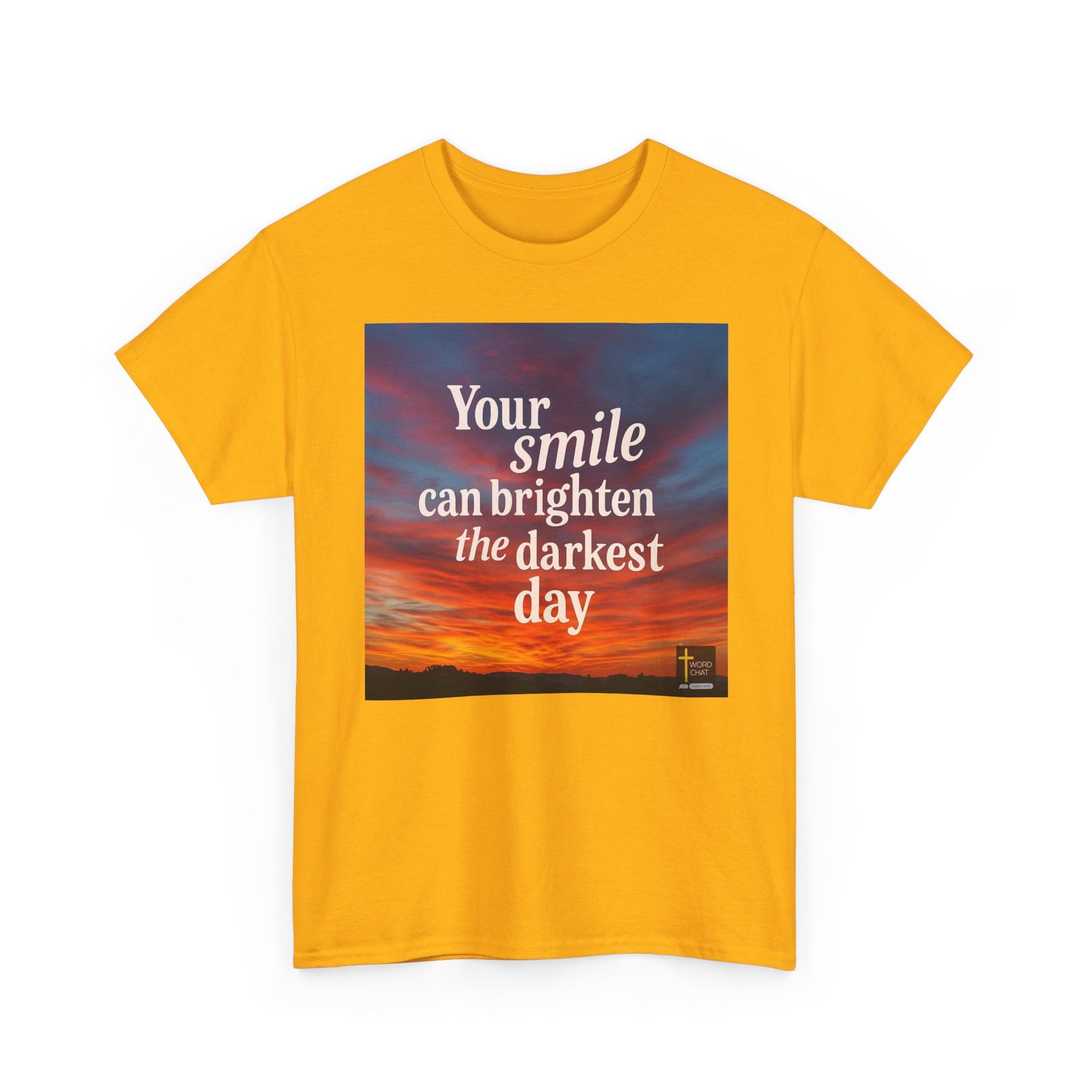 This image features an uplifting motivational quote displayed over a stunning golden-orange sunset sky. The text reads “Your smile can brighten the darkest day” in large, elegant serif typography centered across the composition. The background showcases a dramatic sunset landscape with vibrant warm tones transitioning from deep orange and gold at the horizon to cooler purples and blues in the upper sky. A silhouetted treeline is visible along the bottom of the image, creating depth and contrast against the glowing sky. The WordChat logo with a cross symbol appears in the bottom right corner.