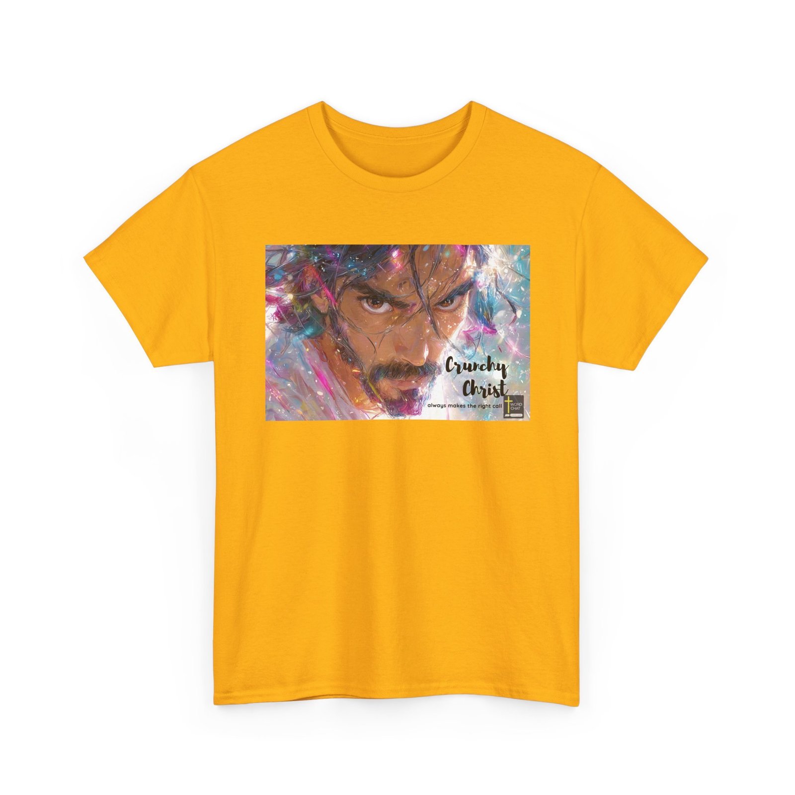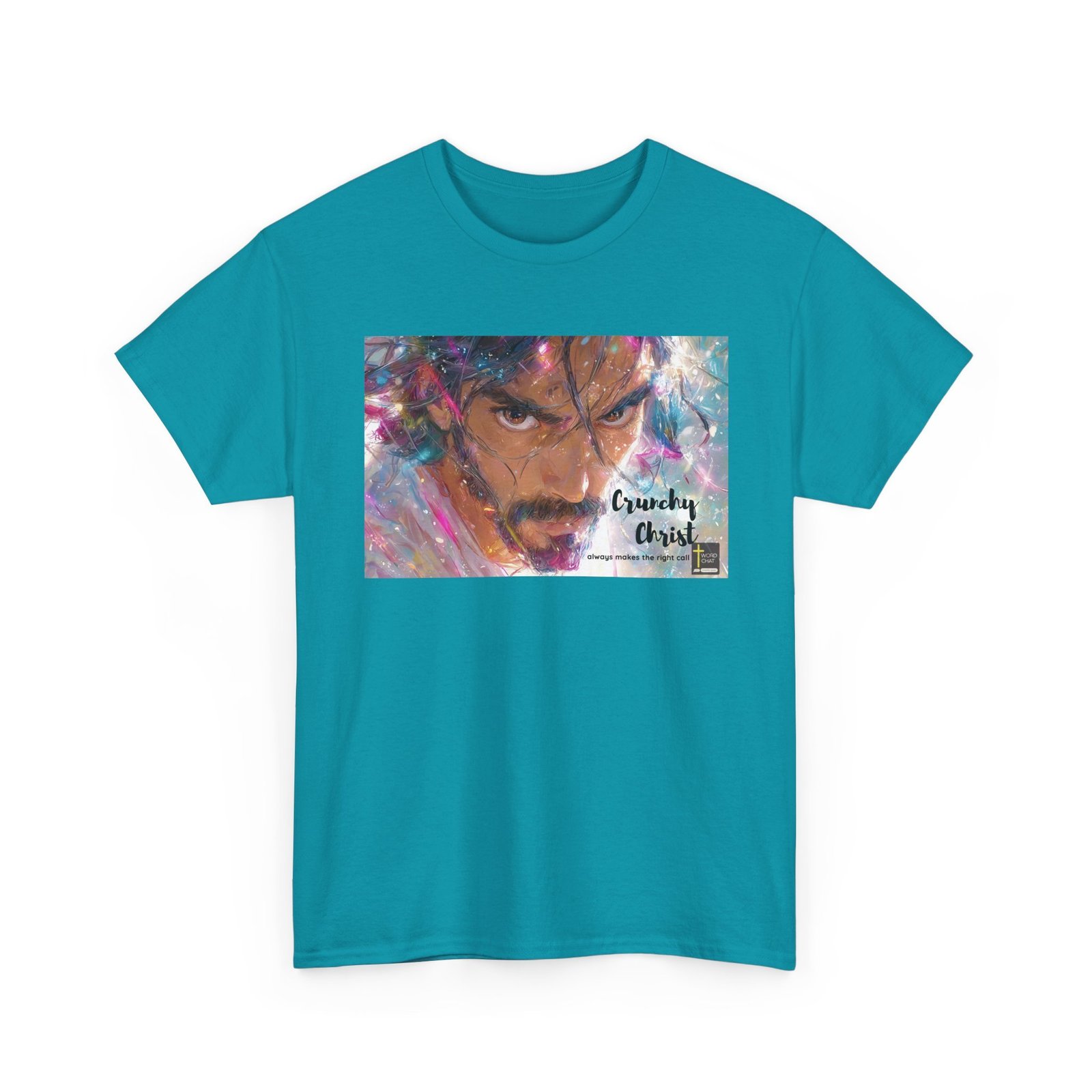 This vibrant digital artwork features a close-up portrait rendered in a dynamic, abstract style with swirling colors of pink, blue, and orange. The image depicts an intense facial expression with piercing eyes and a focused gaze, surrounded by energetic brush strokes and splashes of light. The artistic rendering creates a sense of movement and emotion, with colorful fragments seemingly exploding around the central figure. Text in the bottom right corner reads “Crunchy Christ” with a subtitle “always makes the right call”, adding an enigmatic element to the composition. The overall style blends hyperrealistic details with impressionistic, fluid color techniques, creating a powerful and visually striking portrait.
