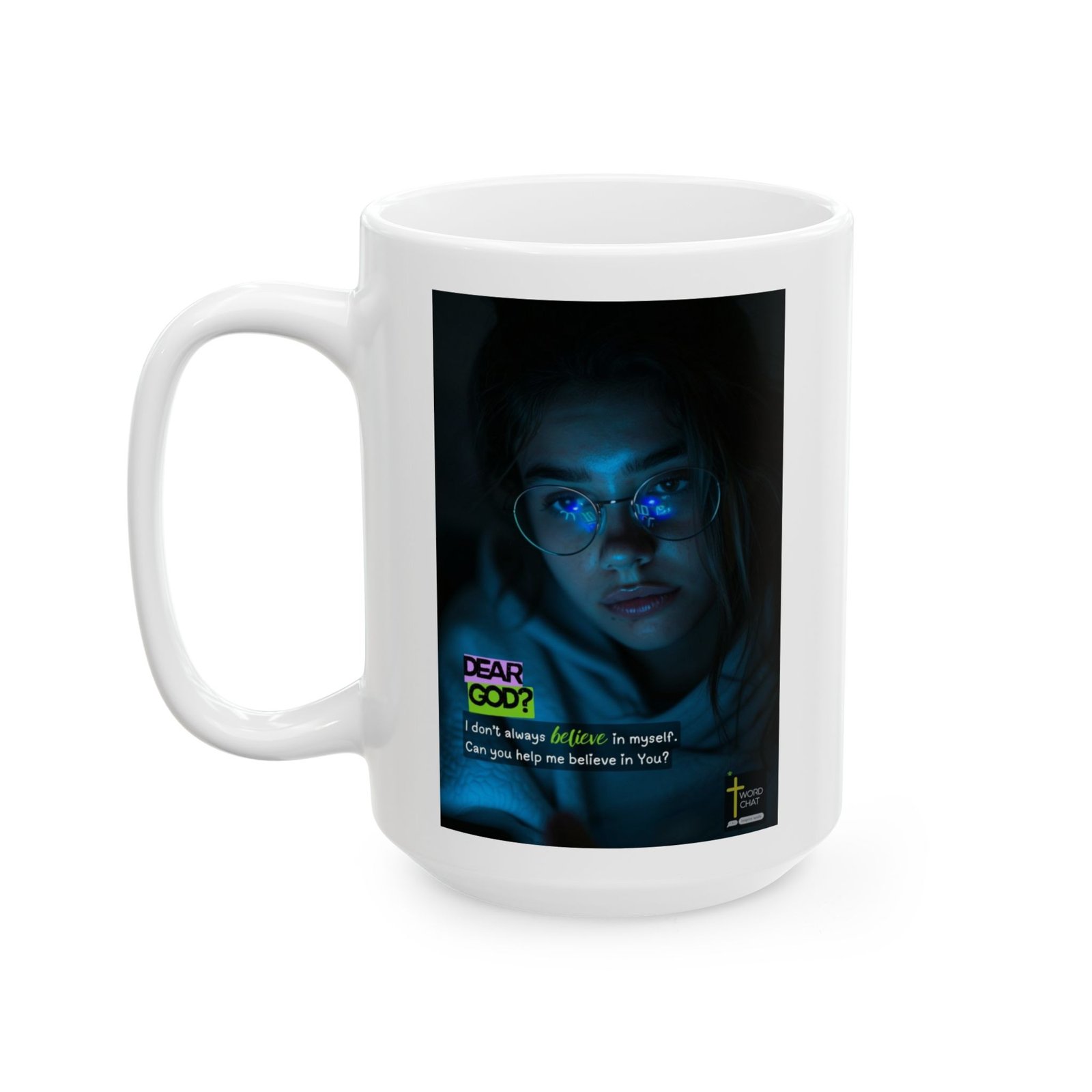 This digital religious artwork features a young person wearing round glasses with glowing blue light reflections, set against a dark teal-blue atmospheric background. The image displays the text “DEAR GOD?” in bold neon pink and lime green lettering, followed by a heartfelt message: “I don’t always believe in myself. Can you help me believe in You?” The composition uses modern digital design with moody lighting and cyberpunk-inspired aesthetics to appeal to younger audiences. The WordChat logo appears at the bottom with an inspirational cross symbol, identifying this as faith-based motivational content. The overall style combines contemporary youth culture imagery with spiritual messaging to promote belief, faith, and connection with God.