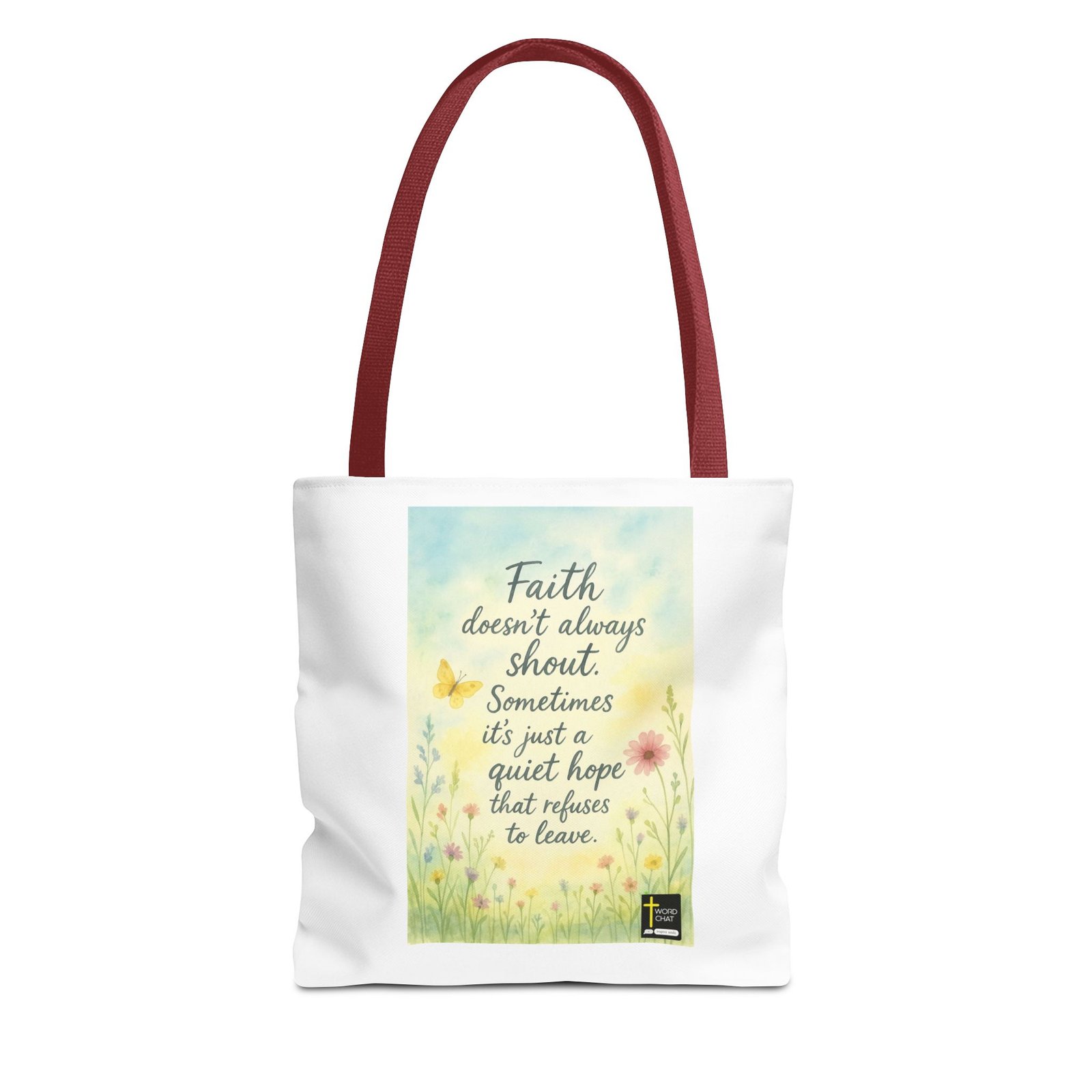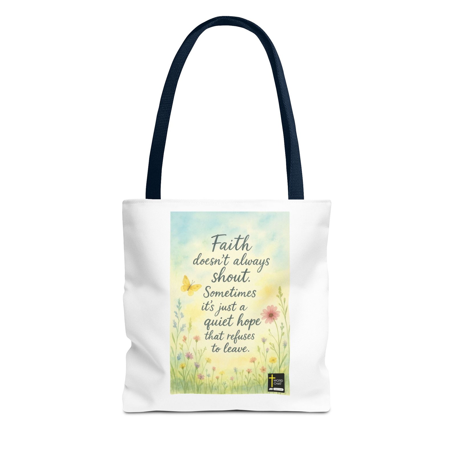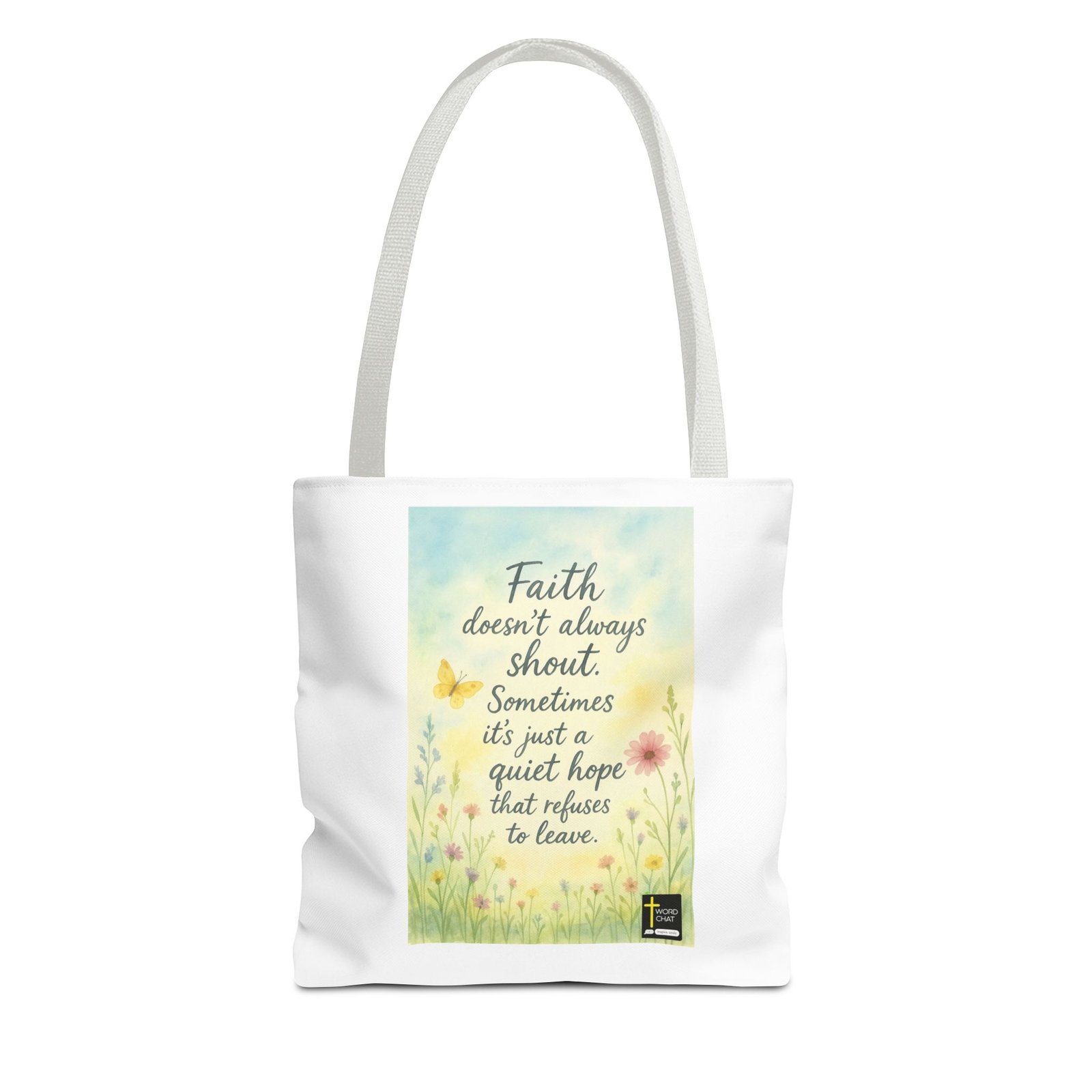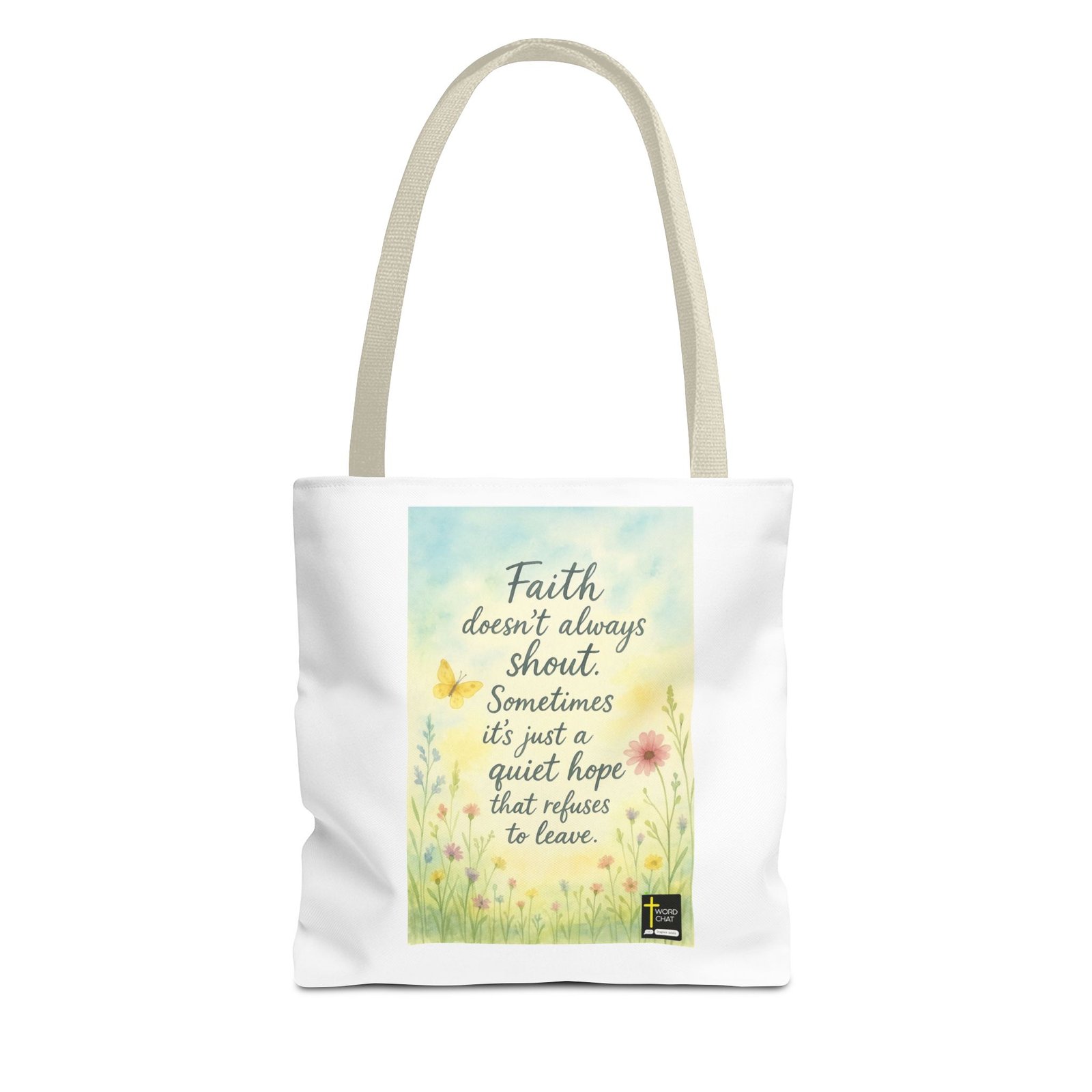 This uplifting image features a spiritual message that reads “Faith doesn’t always shout. Sometimes it’s just a quiet hope that refuses to leave,” displayed in elegant handwritten-style typography. The design is set against a soft, watercolor background in gentle pastel tones of blue, yellow, and cream, creating a serene and peaceful atmosphere. Delicate wildflowers and botanical elements frame the text, including pink daisies, yellow flowers, a butterfly, and green stems that add natural beauty to the composition. The WordChat logo with a cross symbol appears in the bottom right corner, identifying it as an inspirational content piece designed to inspire souls. The overall aesthetic combines religious messaging with botanical illustration in a calming, modern design suitable for spiritual reflection and social media sharing.