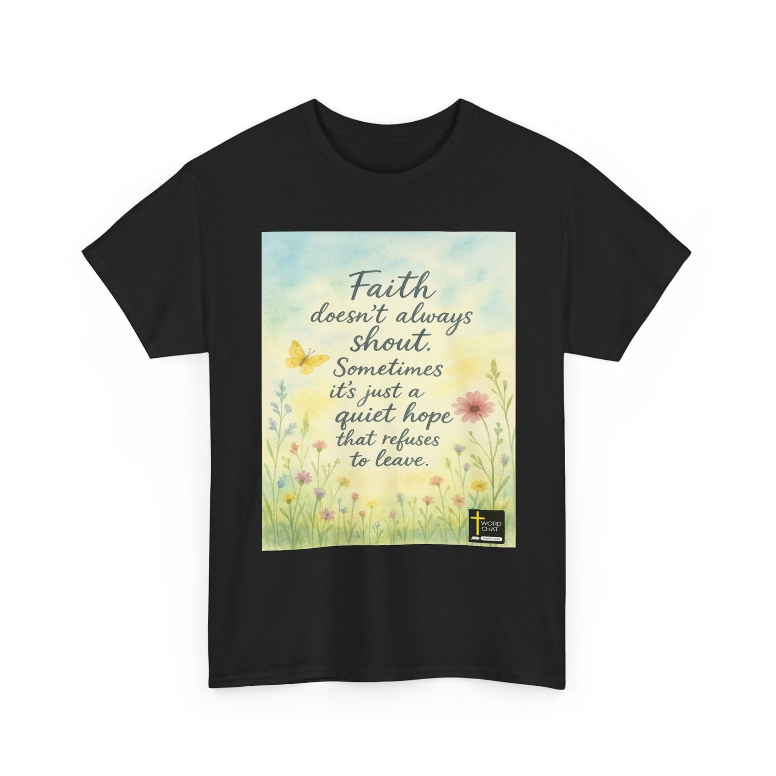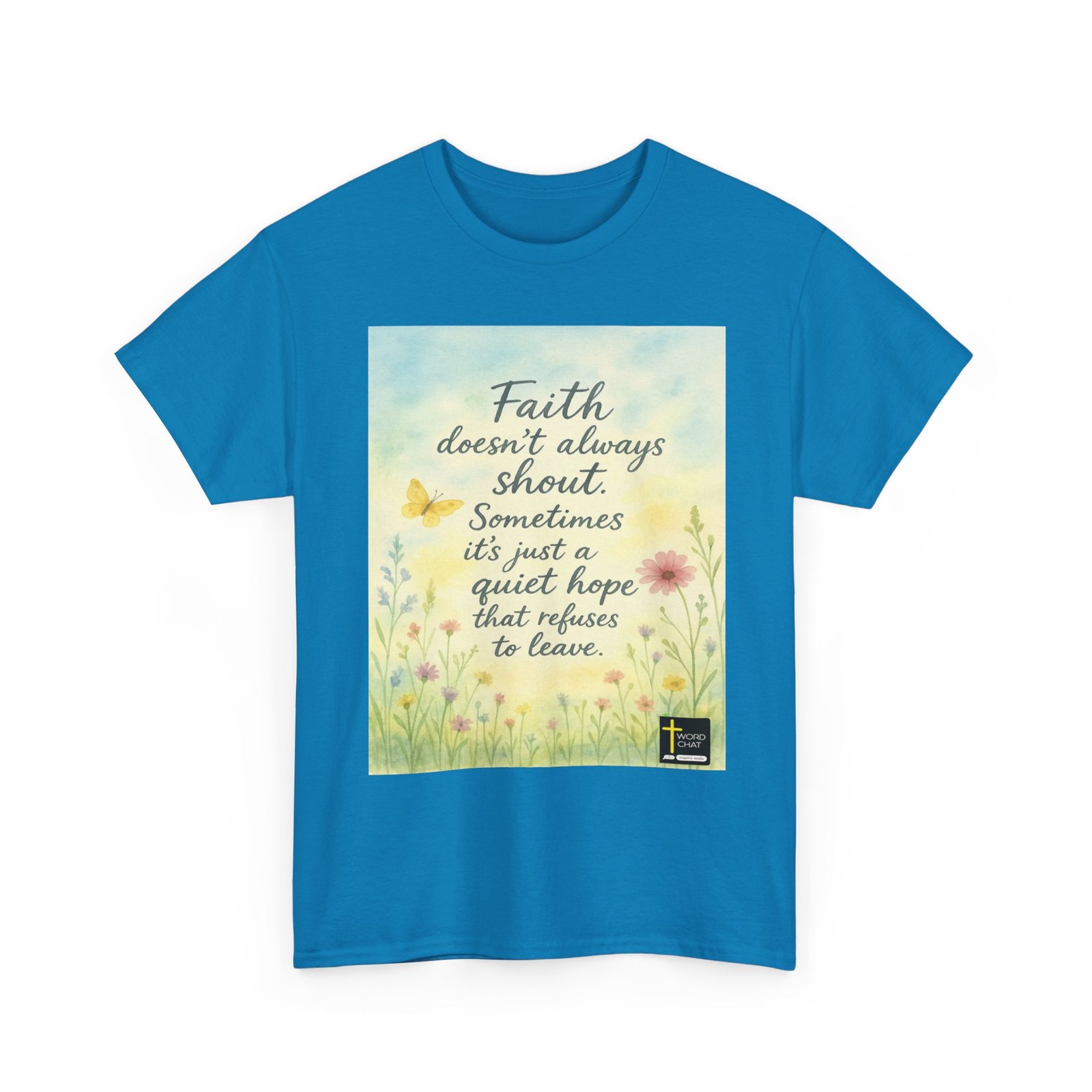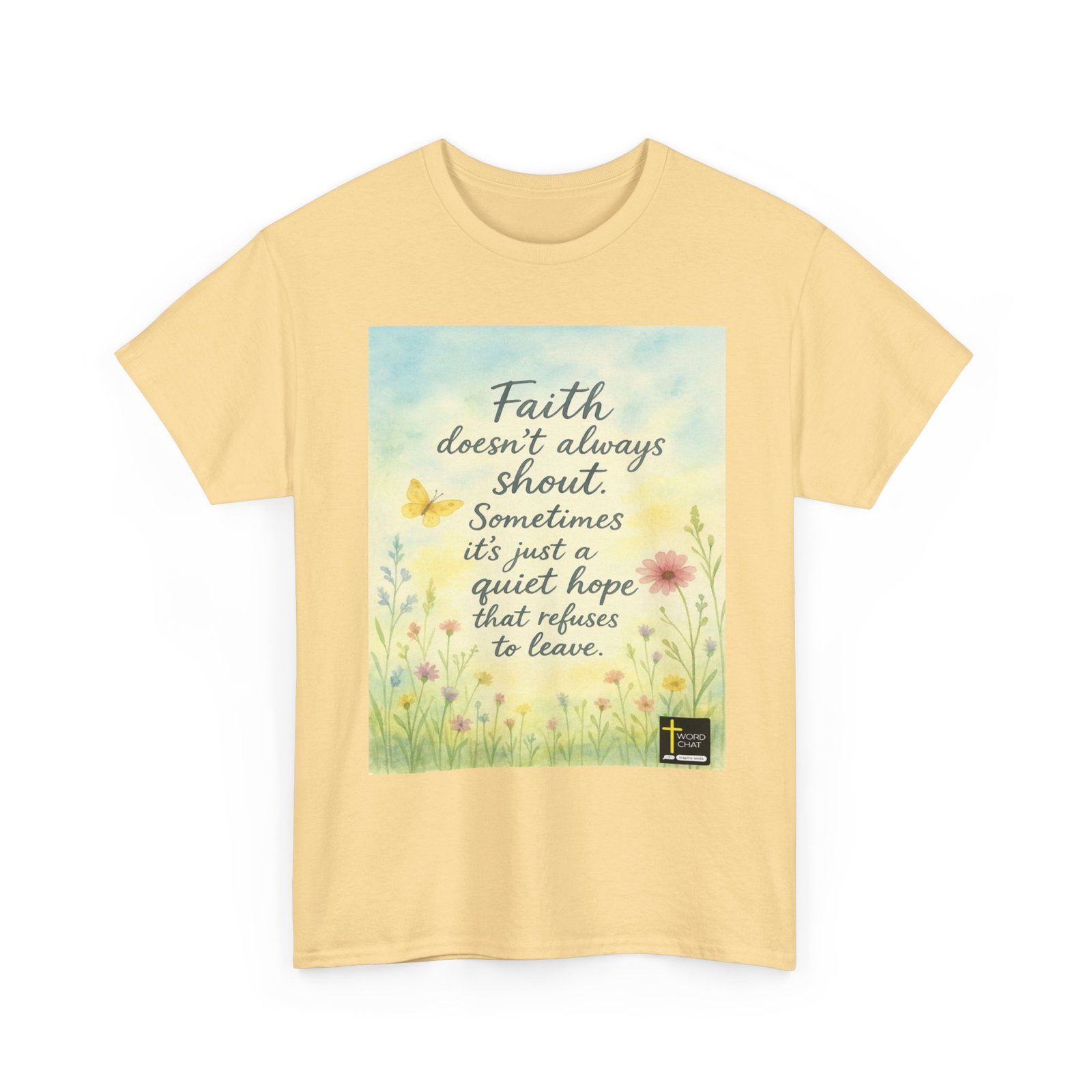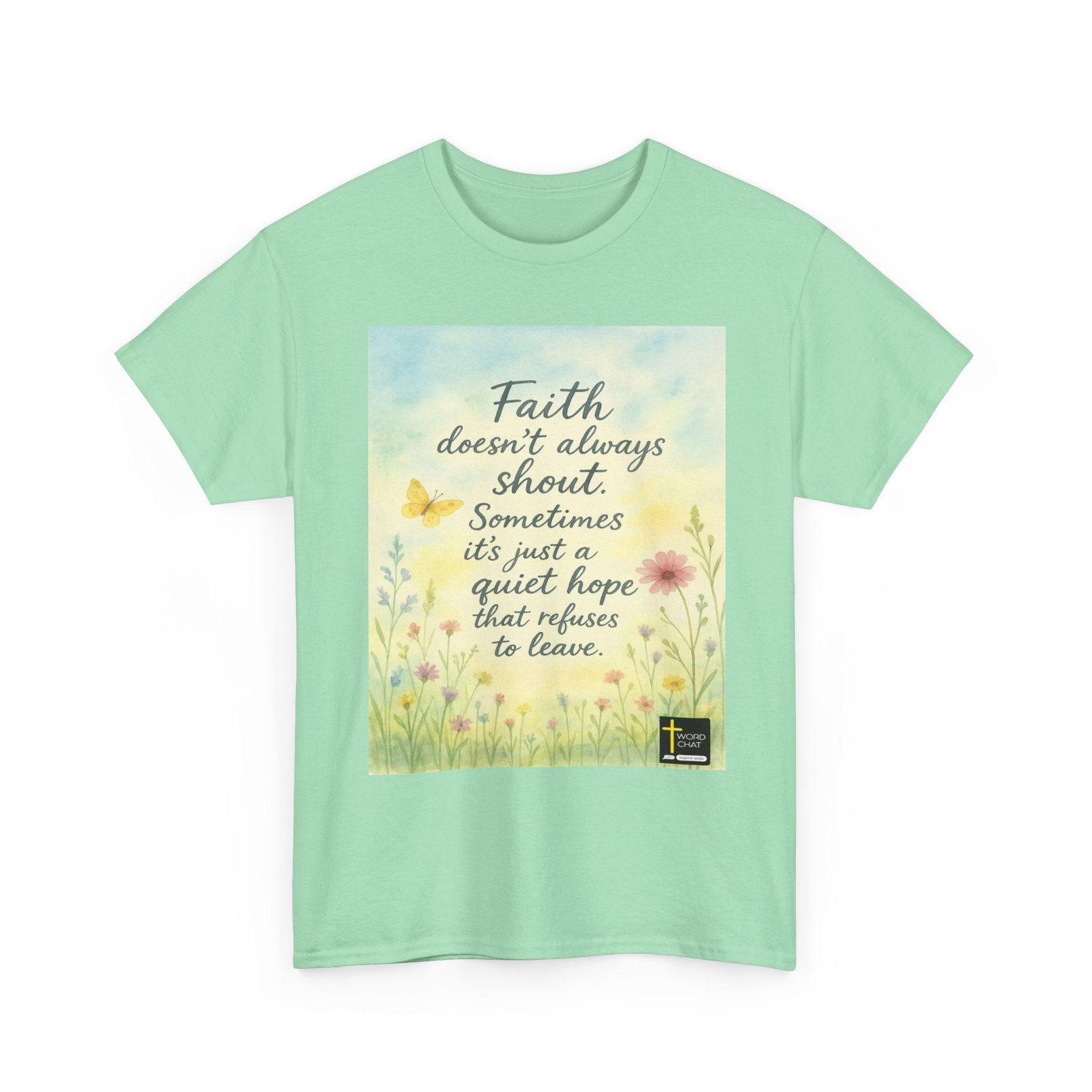 This serene watercolor-style image features an uplifting spiritual message that reads “Faith doesn’t always shout. Sometimes it’s just a quiet hope that refuses to leave.” The quote is rendered in elegant gray script typography centered on a soft, pastel background. The composition is decorated with delicate hand-painted flowers in pink, yellow, and purple tones, along with green foliage stems, creating a peaceful garden aesthetic enhanced by a yellow butterfly in the upper left. A small black logo for “WordChat” with a golden cross appears in the bottom right corner, indicating this is an inspirational graphic designed to inspire souls with messages of hope and faith.
