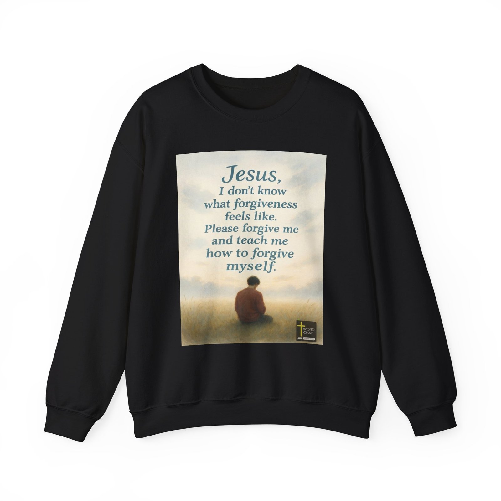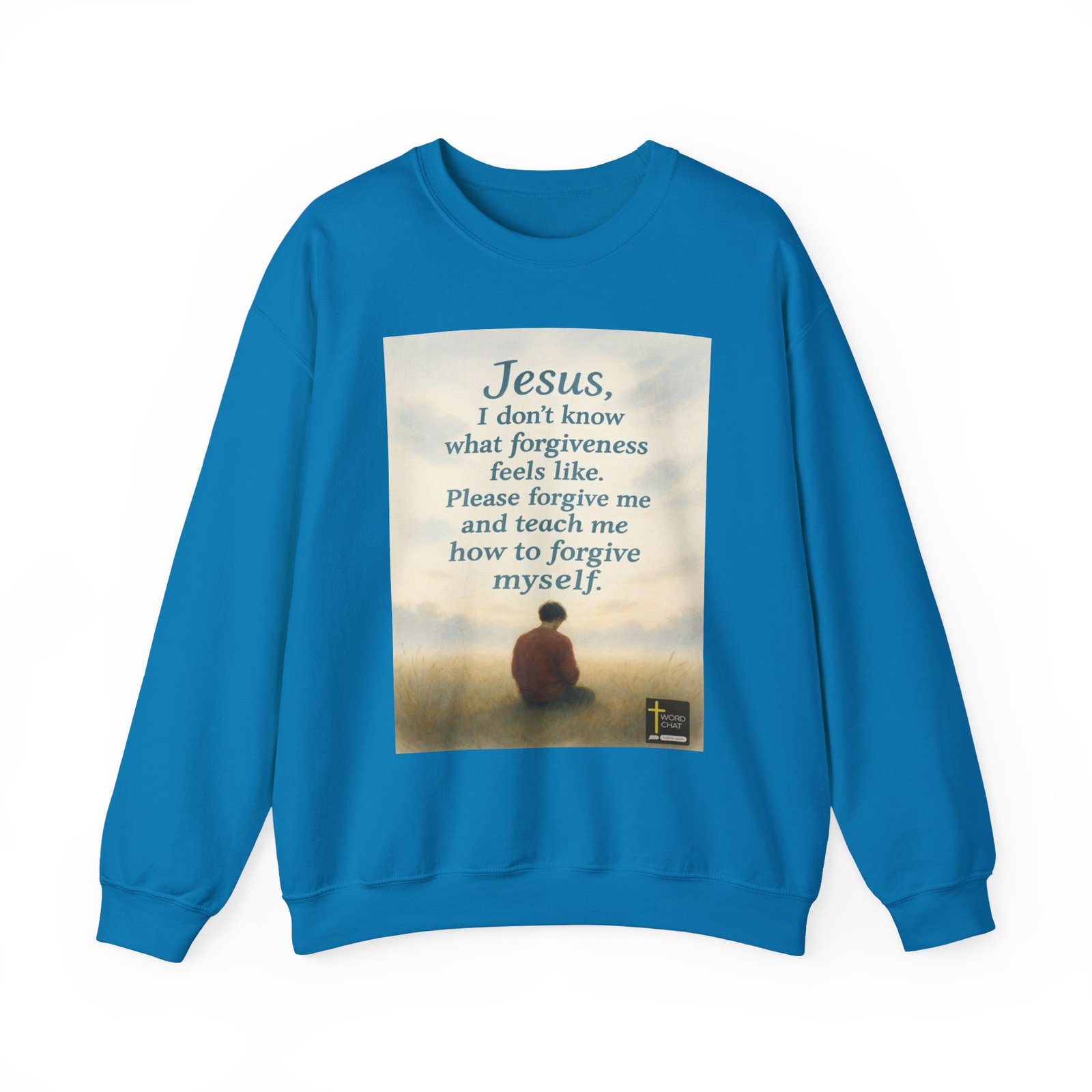 This spiritual image features a heartfelt prayer directed to Jesus, expressing vulnerability about understanding forgiveness and requesting divine guidance toward self-forgiveness. The composition shows a solitary figure seated in a misty field wearing a brown garment, gazing toward a cloudy sky that conveys contemplation and spiritual introspection. The text is rendered in elegant blue italic typography centered above the figure, creating a meditative and peaceful aesthetic that complements the soft, impressionistic painting style. The WordChat logo and ‘inspire souls’ tagline sit in the bottom right corner, showing the brand of this platform for finding and sharing soul stirring messages.