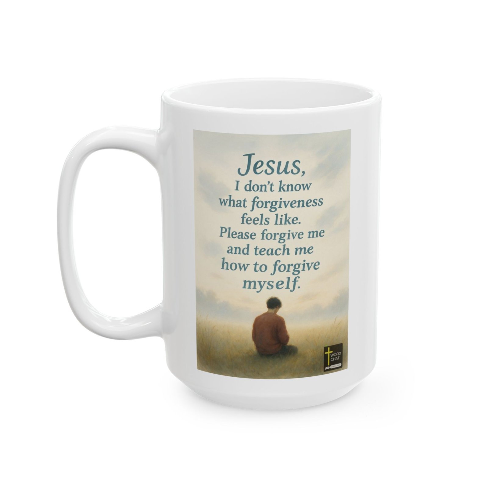 This inspirational image features a heartfelt prayer about forgiveness and self-acceptance, displayed in elegant blue serif typography against a serene, misty landscape background. A solitary figure dressed in a brown garment sits in a vast field of golden wheat, gazing upward toward a cloudy sky, conveying themes of contemplation and spiritual reflection. The composition includes a prayer that reads “Jesus, I don’t know what forgiveness feels like. Please forgive me and teach me how to forgive myself,” addressing themes of personal growth and divine grace. The image has a painterly, watercolor-like artistic style with soft, muted tones of beige, cream, and gray that evoke peace and introspection. The WordChat logo and ‘inspire souls’ tagline sit in the bottom right corner, showing the brand of this platform for finding and sharing soul stirring messages.