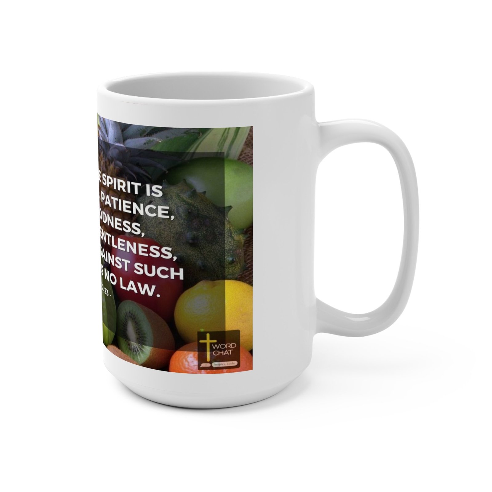 This vibrant image features a colorful assortment of fresh fruits including grapes, oranges, apples, kiwi, and a pineapple, creating a lush backdrop for a powerful biblical quote. The text, overlaid in white bold letters, presents the “Fruit of the Spirit” from Galatians 5:22-23, listing nine spiritual qualities: love, joy, peace, patience, kindness, goodness, faithfulness, gentleness, and self-control. The fruits are arranged densely, filling the entire frame with rich, varied colors ranging from deep purple grapes to bright oranges and green kiwis. The image has a high-resolution, crisp quality that makes the fruits look fresh and appetizing, while the text stands out clearly against the colorful background. The design includes a small “Word Chat” logo in the bottom right corner and is sourced from heartlight.org.