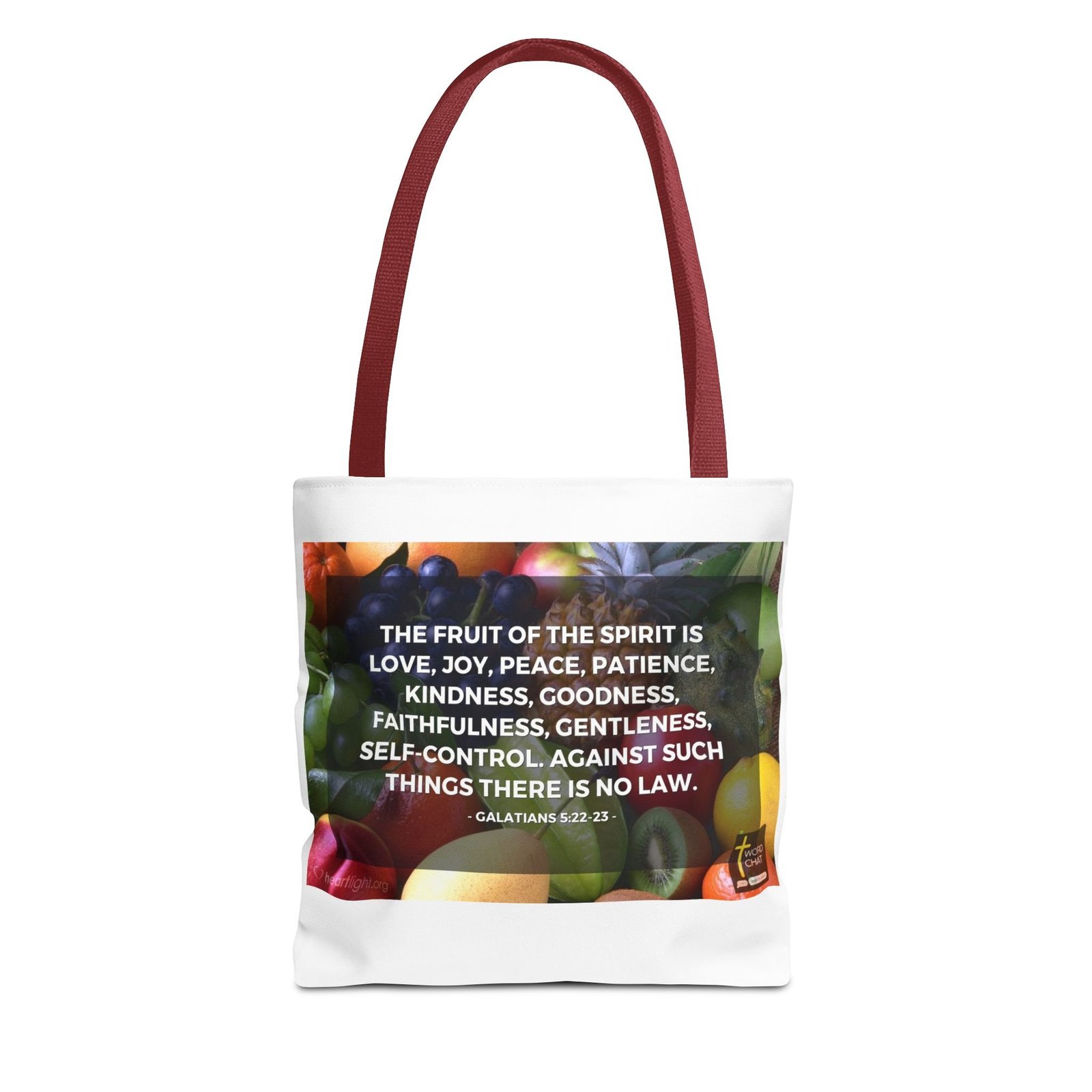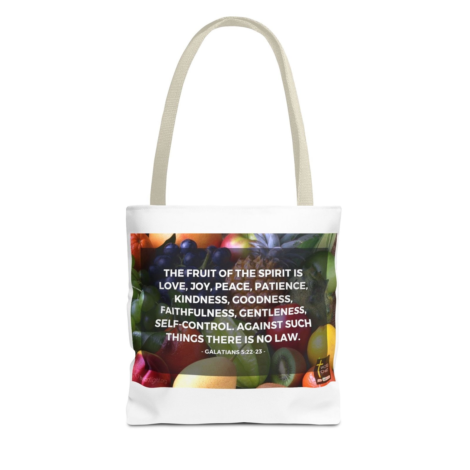 This vibrant image features a colorful array of fresh fruits including grapes, oranges, pineapple, kiwi, and various other produce, serving as a background for a powerful biblical quote from Galatians 5:22-23. The text overlaid on the fruit background lists the “Fruit of the Spirit” – love, joy, peace, patience, kindness, goodness, faithfulness, gentleness, and self-control. The fruits are arranged in a visually appealing, close-up composition that highlights their natural textures and colors, creating a rich and appetizing backdrop. The white text stands out clearly against the colorful fruit background, drawing the viewer’s eye to the scriptural message. The image is designed in a motivational poster style, combining inspirational text with a visually striking natural element.