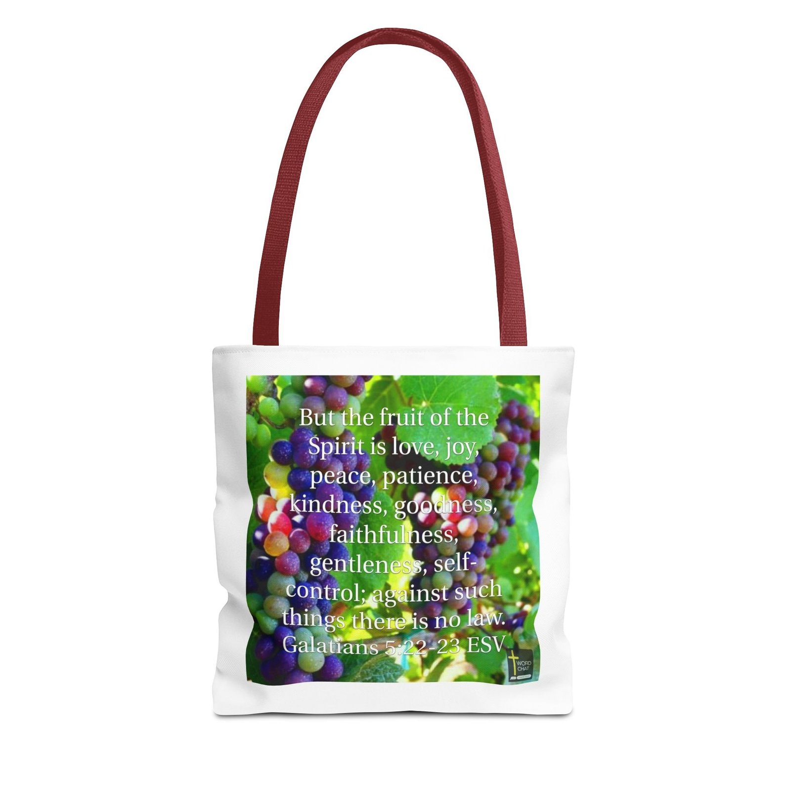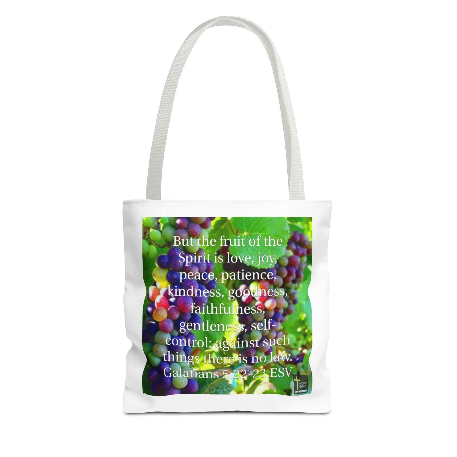 This image features a vibrant cluster of ripening grapes in various shades of purple, green, and red, serving as a background for a biblical scripture quote from Galatians 5:22-23. The text overlays the grape image, listing the “fruit of the Spirit” which includes love, joy, peace, patience, kindness, goodness, faithfulness, gentleness, and self-control. The grapes appear lush and detailed, with a soft focus that creates a sense of depth and texture among the green vine leaves. The scripture is displayed in white text, creating a clear contrast against the colorful grape backdrop. The image is watermarked with a “Word Chat” logo, indicating it is likely a religious or inspirational social media graphic.