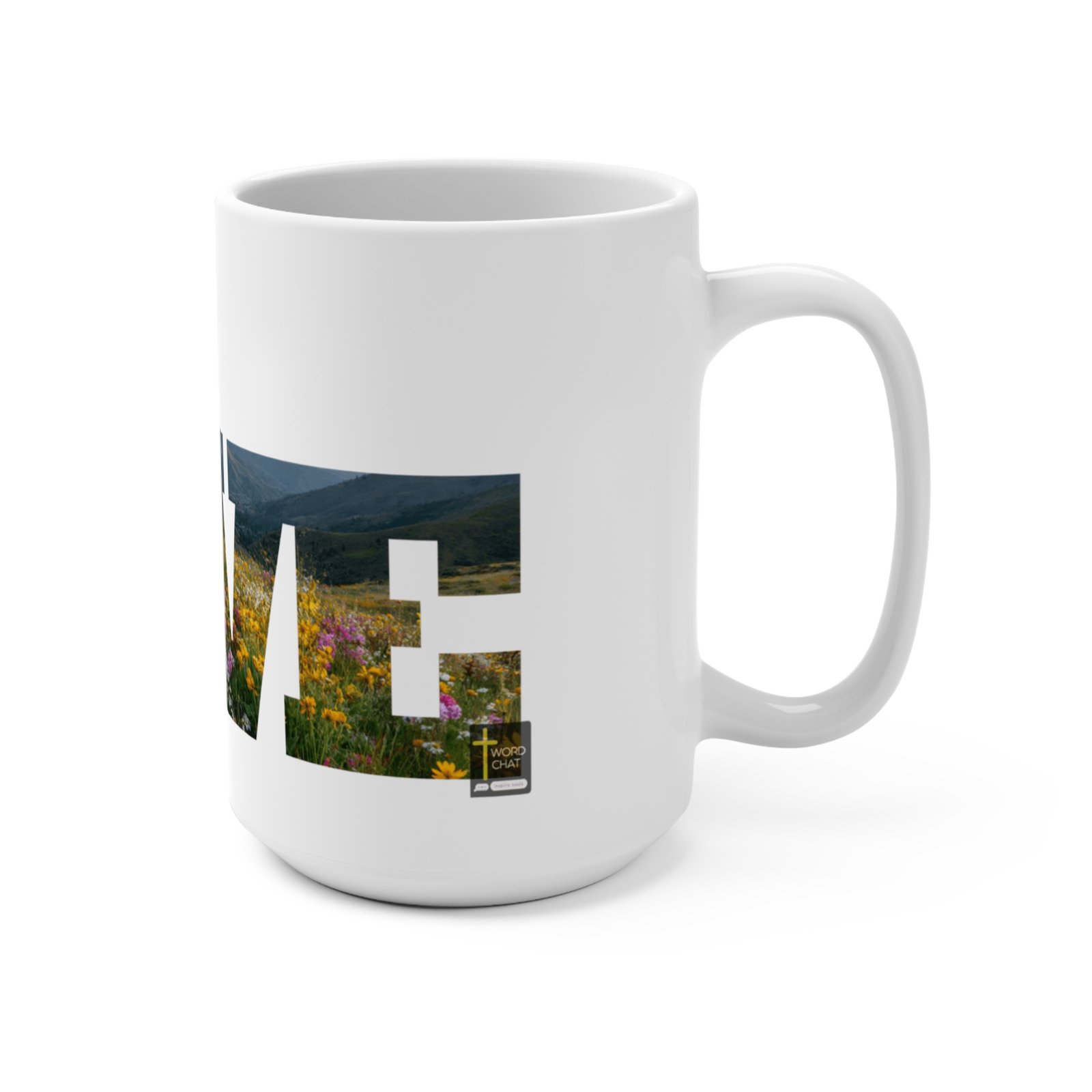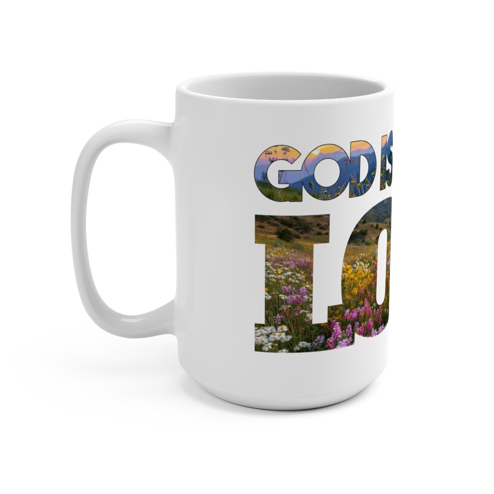 This inspirational image features large overlay text spelling “GOD IS LOVE” composed of scenic landscape and wildflower meadow photography. The composition combines multiple nature scenes including rolling hills, mountain valleys, and expansive fields filled with blooming wildflowers throughout the seasons. The letters are transparently filled with detailed photographs showing natural terrain, vegetation, and pastoral vistas, creating a visually striking typographic design. A small WordChat logo appears in the lower right corner. The overall aesthetic merges spiritual messaging with natural imagery to create an uplifting devotional or religious graphic suitable for faith-based content and Christian communications.