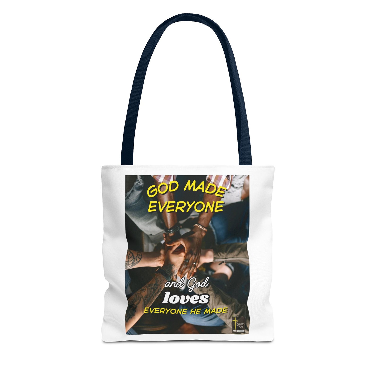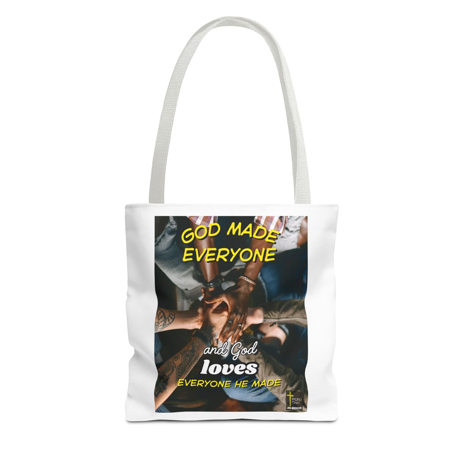 This uplifting image showcases a group of diverse individuals joining hands in unity and camaraderie. The vibrant graphic overlay features the inspiring text, “God made everyone and God loves everyone He made,” written in bold, contrasting fonts. The top text is highlighted in a striking yellow, while the bottom text combines white and yellow for emphasis. The photograph is taken from an overhead perspective, adding a sense of togetherness and inclusivity. The image style is warm and inviting, making it ideal for spiritual and motivational content.