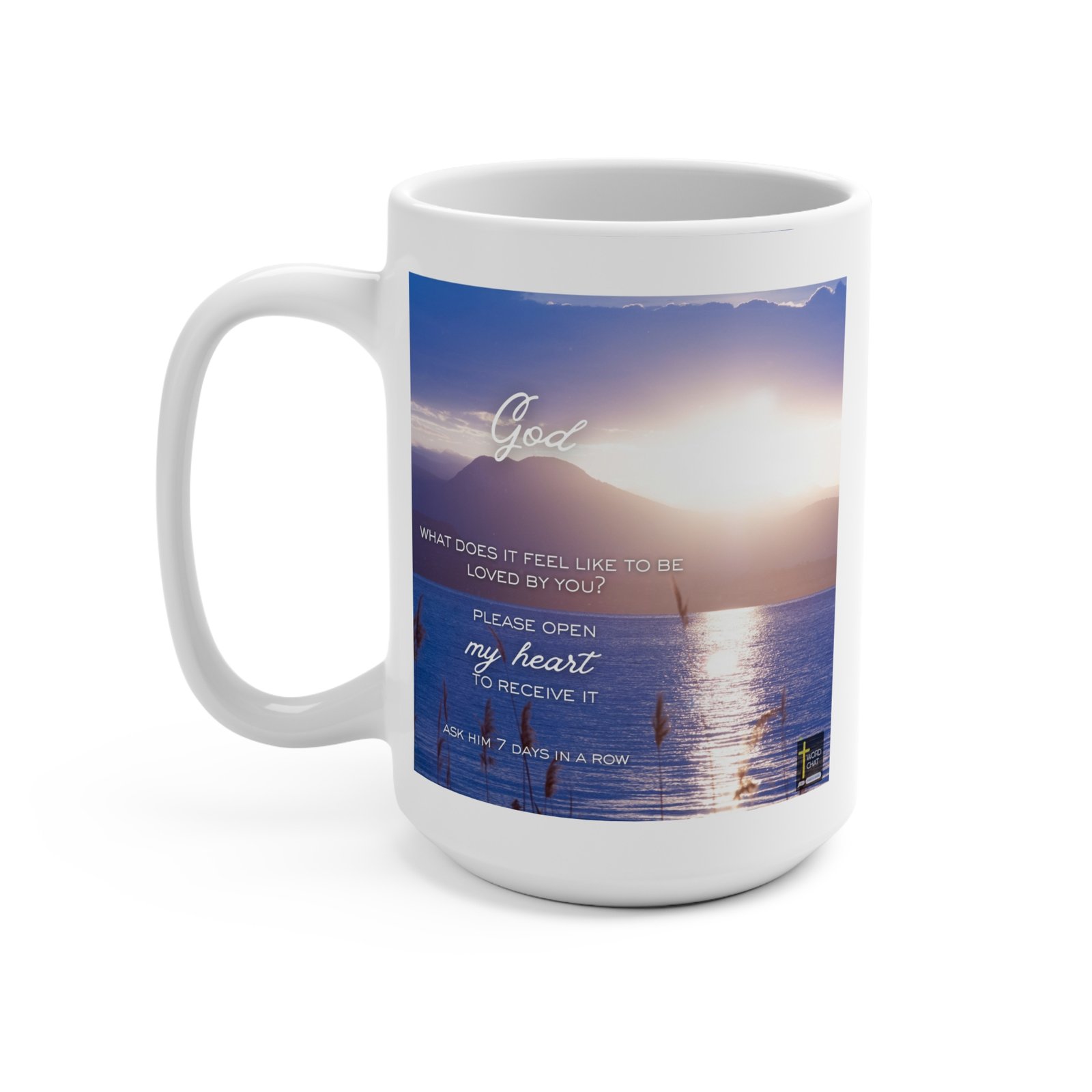 This inspirational religious image features a serene sunrise landscape with a majestic mountain reflected in calm blue waters, conveying peace and spiritual awakening. The composition includes white script and sans-serif text overlaid on the scenic background, asking “What does it feel like to be loved by you?” and inviting viewers to “Please open my heart to receive it.” The image incorporates a motivational call-to-action encouraging users to “Ask him 7 days in a row,” promoting a week-long prayer or devotional challenge. A Word Chat logo with a cross symbol appears in the bottom right corner, identifying the content source. The overall aesthetic combines nature photography with typography in a modern faith-based design style, suitable for social media sharing and Christian inspirational messaging.