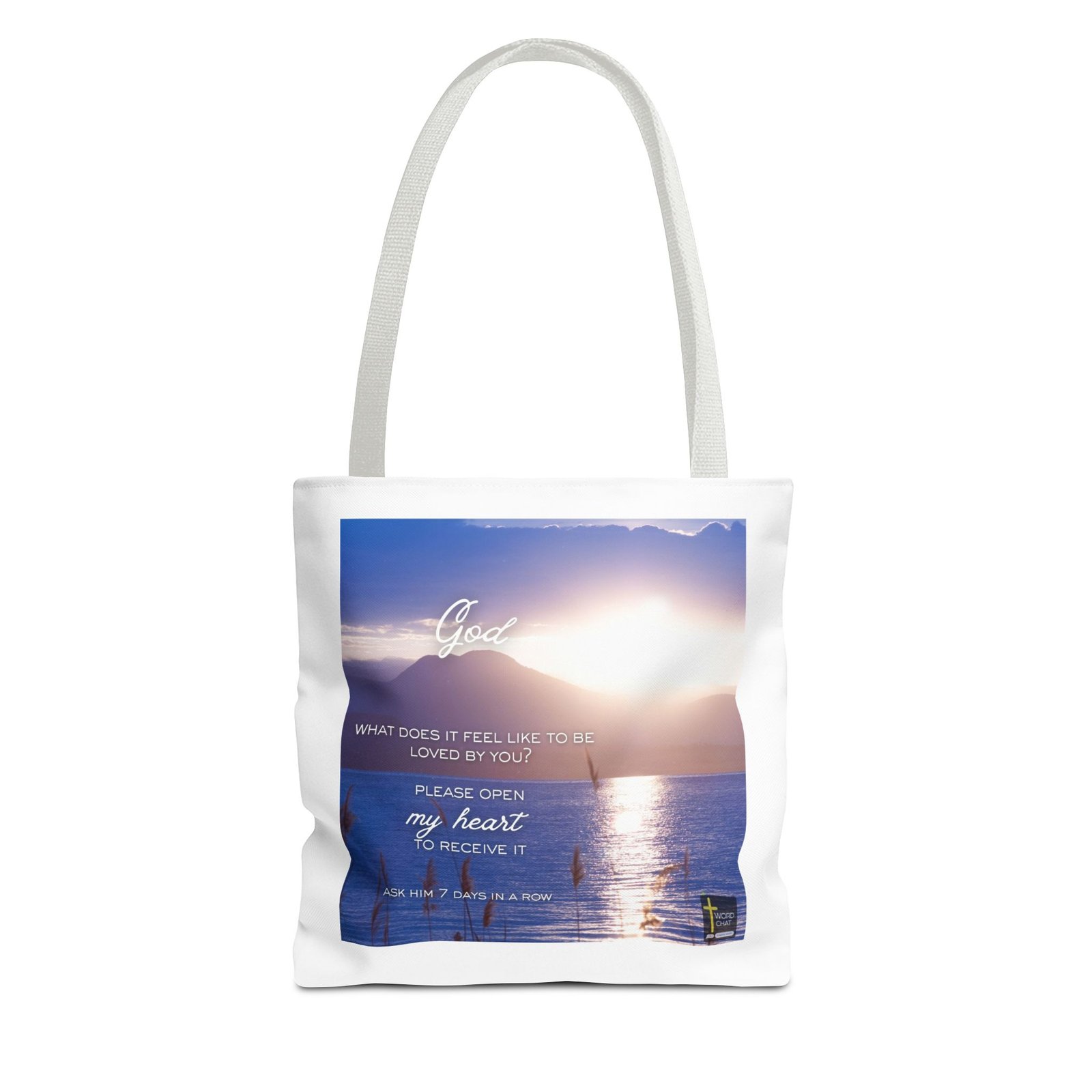 This serene landscape image features a peaceful sunset or sunrise scene over a lake with mountains in the background, creating a tranquil atmosphere for spiritual reflection. The composition includes motivational text overlaid on the scenic water and mountain backdrop, with “God” displayed in elegant script at the top, followed by the question “What does it feel like to be loved by you?” in clean, modern typography. Additional text reads “Please open my heart to receive it” in a combination of cursive and sans-serif fonts, with a call-to-action stating “Ask Him 7 days in a row” at the bottom. The image incorporates soft lighting and gentle colors of blue, purple, and gold tones that evoke a peaceful, meditative mood. The WordChat logo and ‘inspire souls’ tagline sit in the bottom right corner, showing a place find soul stirring messages to share, as well as join a Christian social media platform.