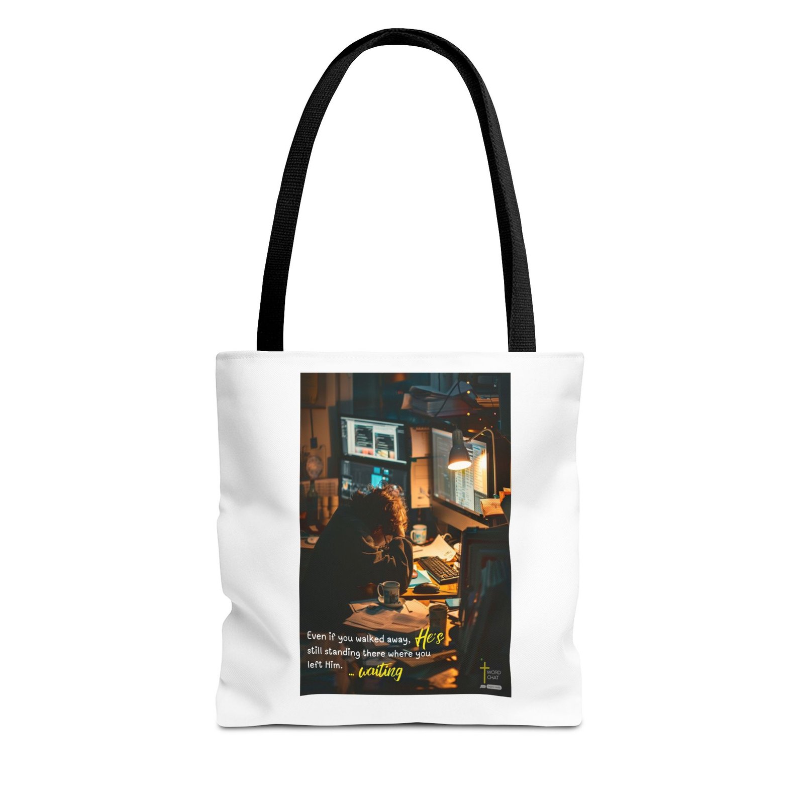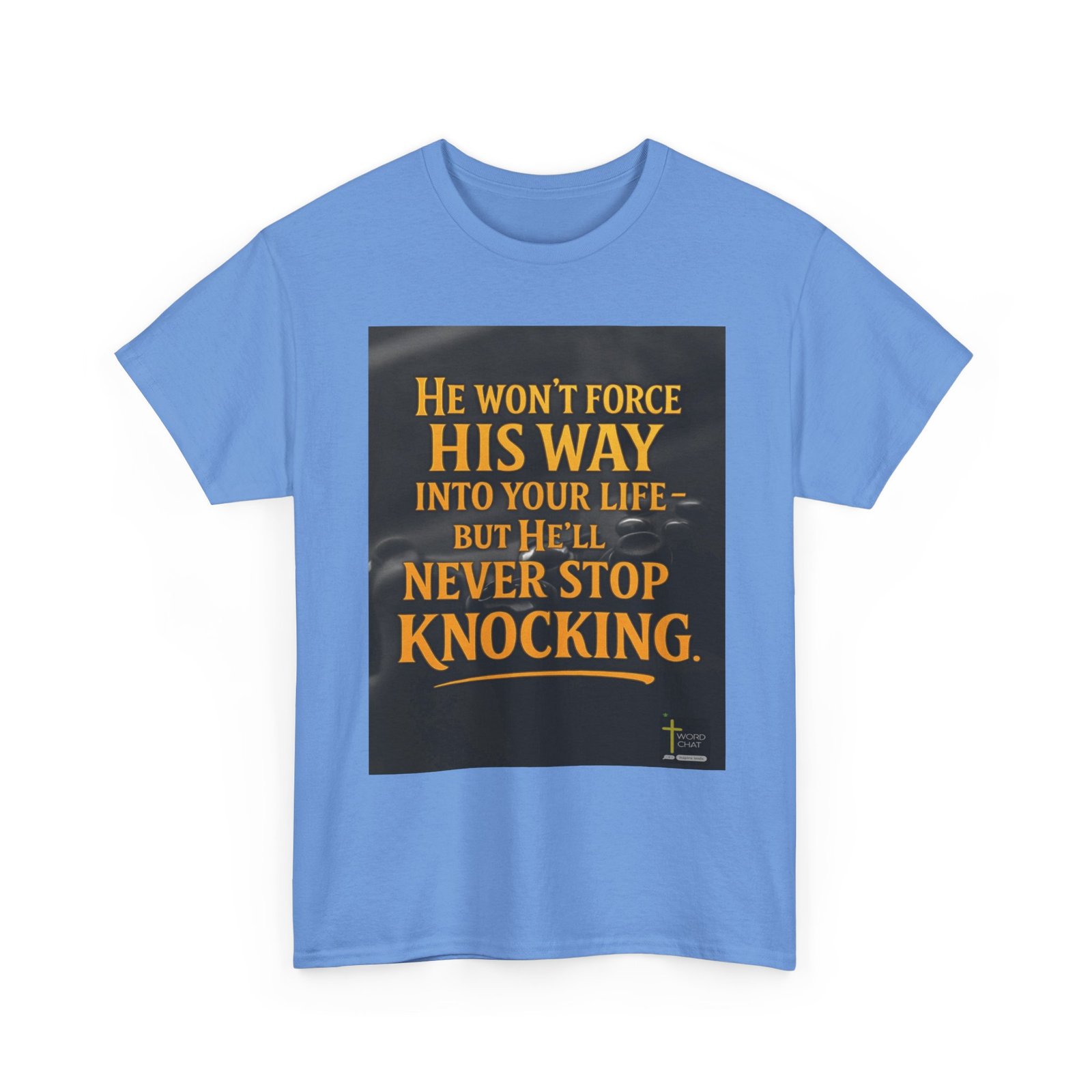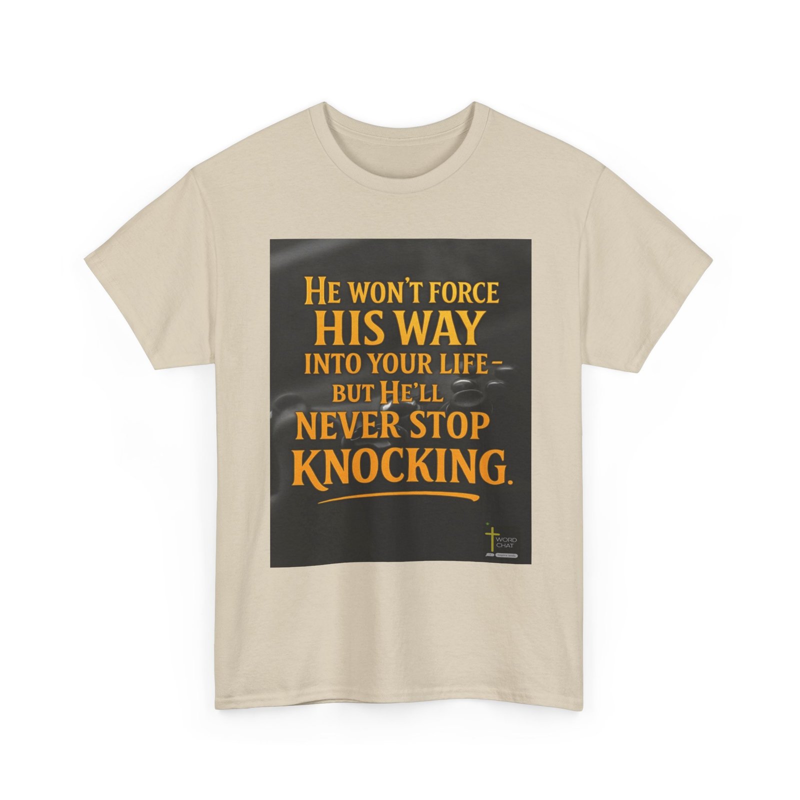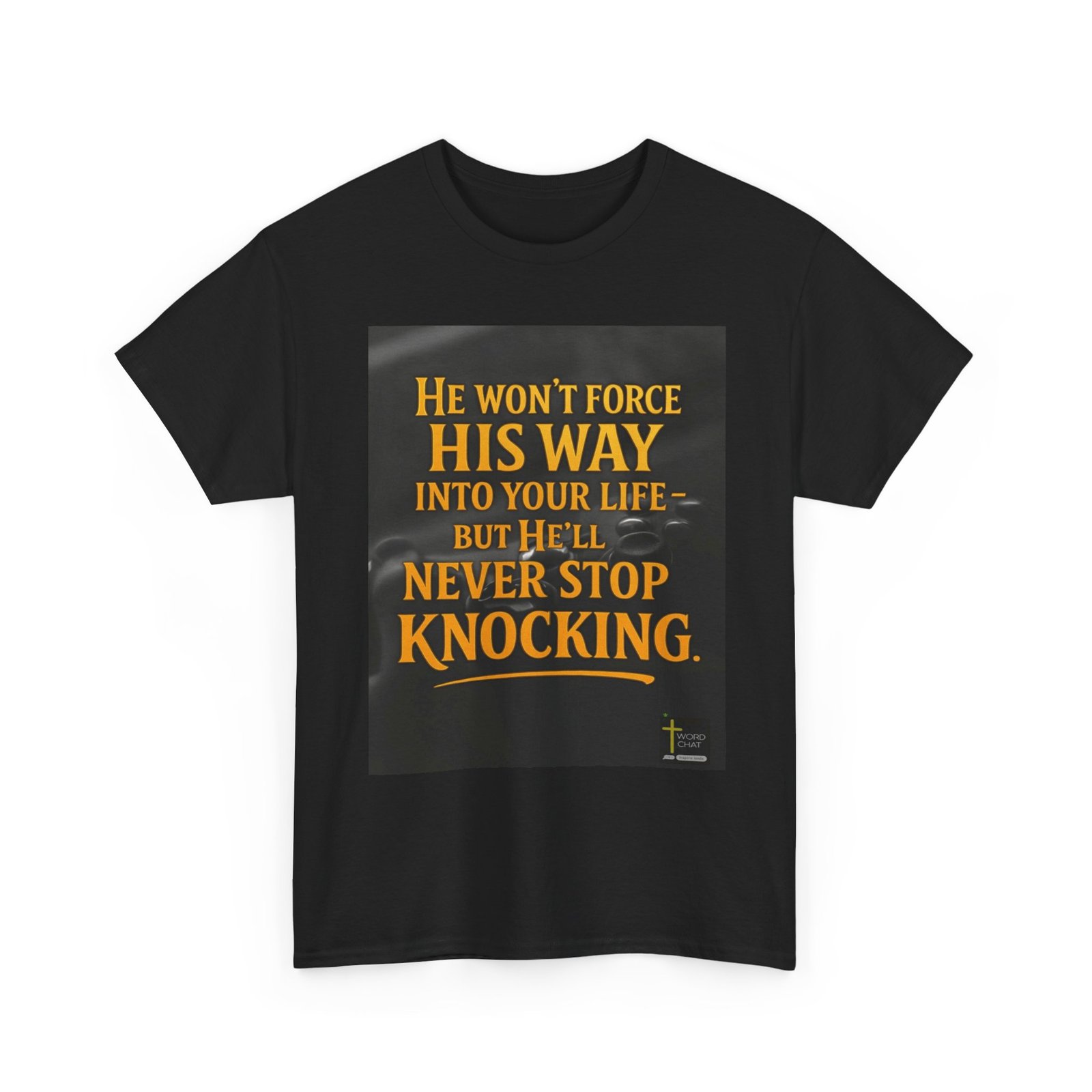 This inspirational graphic features bold, golden yellow text set against a dark, blurred background that displays silhouettes of people with raised hands in prayer or worship. The powerful message reads “He won’t force his way into your life – but he’ll never stop knocking,” conveying a spiritual message about divine persistence and free will. The text uses an elegant serif font with professional styling and includes a decorative underline beneath the main quote. At the bottom right corner, the image displays the “WordChat” logo with the tagline “inspire souls,” indicating this is faith-based motivational content. The overall design combines religious messaging with modern graphic design aesthetics, creating a compelling visual suitable for sharing on social media or spiritual platforms.
