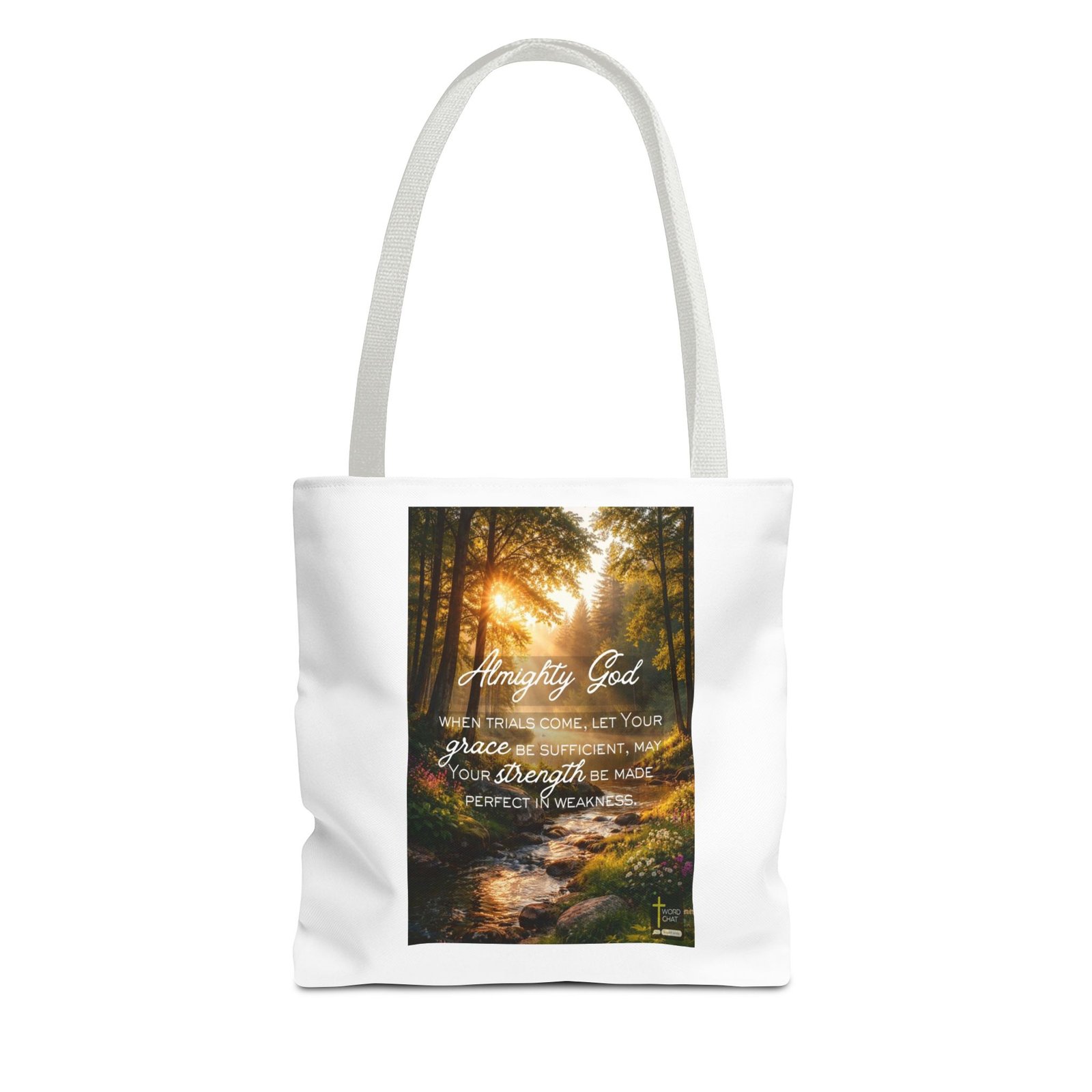 This serene spiritual image features an inspirational prayer quote set against a breathtaking natural landscape of a sunlit forest stream. The text reads “Almighty God, when trials come, let Your grace be sufficient, may Your strength be made perfect in weakness,” displayed in elegant white script font that conveys comfort and hope. The background showcases a peaceful woodland scene with tall trees bathed in golden sunlight, a flowing creek with smooth rocks, wildflowers in shades of purple and white, creating a tranquil and uplifting atmosphere. The WordChat logo and ‘inspire souls’ tagline sit in the bottom right corner, showing the brand of this platform for finding and sharing soul stirring messages. This motivational graphic combines nature photography with faith-based messaging, designed to inspire reflection on divine grace and resilience during difficult times.