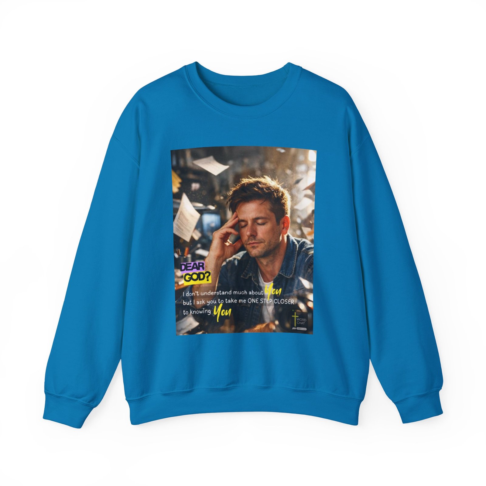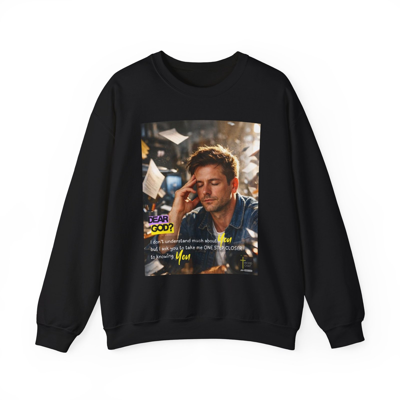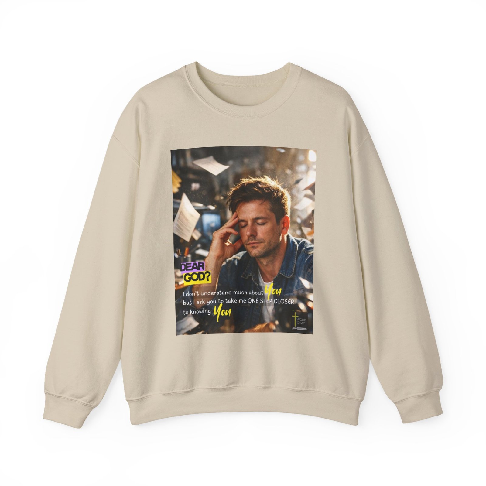 This motivational religious image features a man in a denim shirt with his hand to his head, displaying a contemplative and prayerful expression in a bright, sunlit workspace. The photo combines spiritual messaging with modern design, prominently displaying “DEAR GOD?” in purple and yellow text alongside the prayer: “I don’t understand much about You but I ask you to take me ONE STEP CLOSER to knowing You.” The background shows a blurred office or creative workspace environment with papers and materials, emphasizing the everyday spirituality theme. The WordChat logo and ‘inspire souls’ tagline sit in the bottom right corner, showing a place find soul stirring messages to share, as well as join a Christian social media platform.