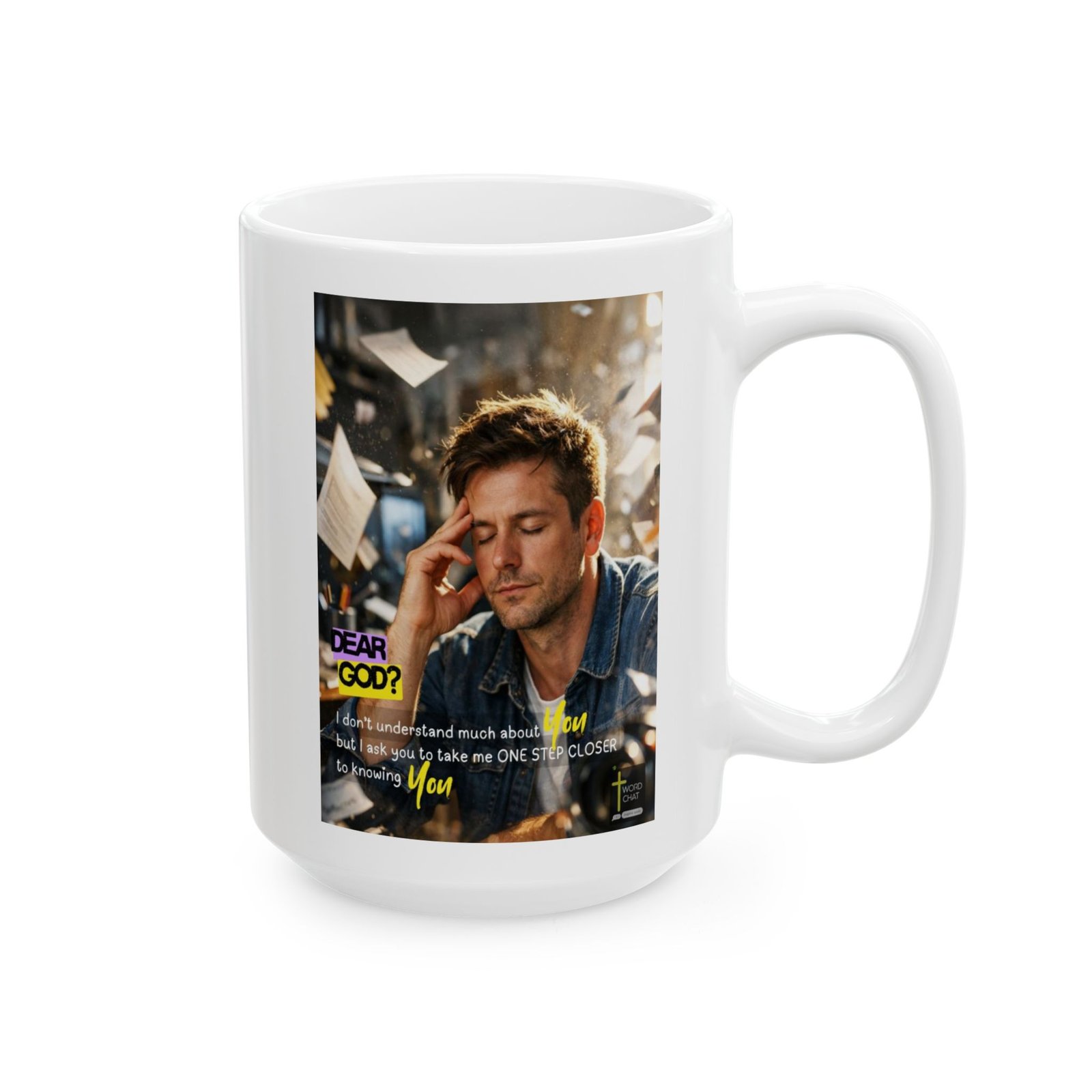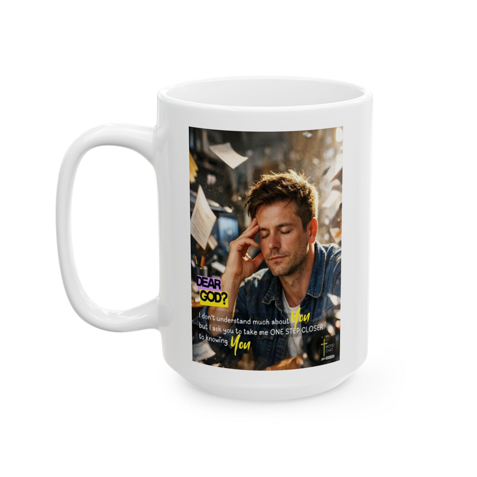 This inspirational meme features a contemplative man in a denim shirt with his hand to his head in a thoughtful pose, set against a blurred office or workspace background with scattered papers and warm lighting. The image displays motivational text in bold yellow and purple typography that reads “DEAR GOD? I don’t understand much about You but I ask you to take me ONE STEP CLOSER to knowing You,” promoting spiritual growth and faith. The photography style captures a candid, introspective moment with professional lighting and depth of field that emphasizes the subject’s emotional expression. The WordChat logo and ‘inspire souls’ tagline sit in the bottom right corner, showing the brand of this platform for finding and sharing soul stirring messages. The overall aesthetic combines contemporary design elements with heartfelt messaging intended to inspire spiritual reflection and personal growth.