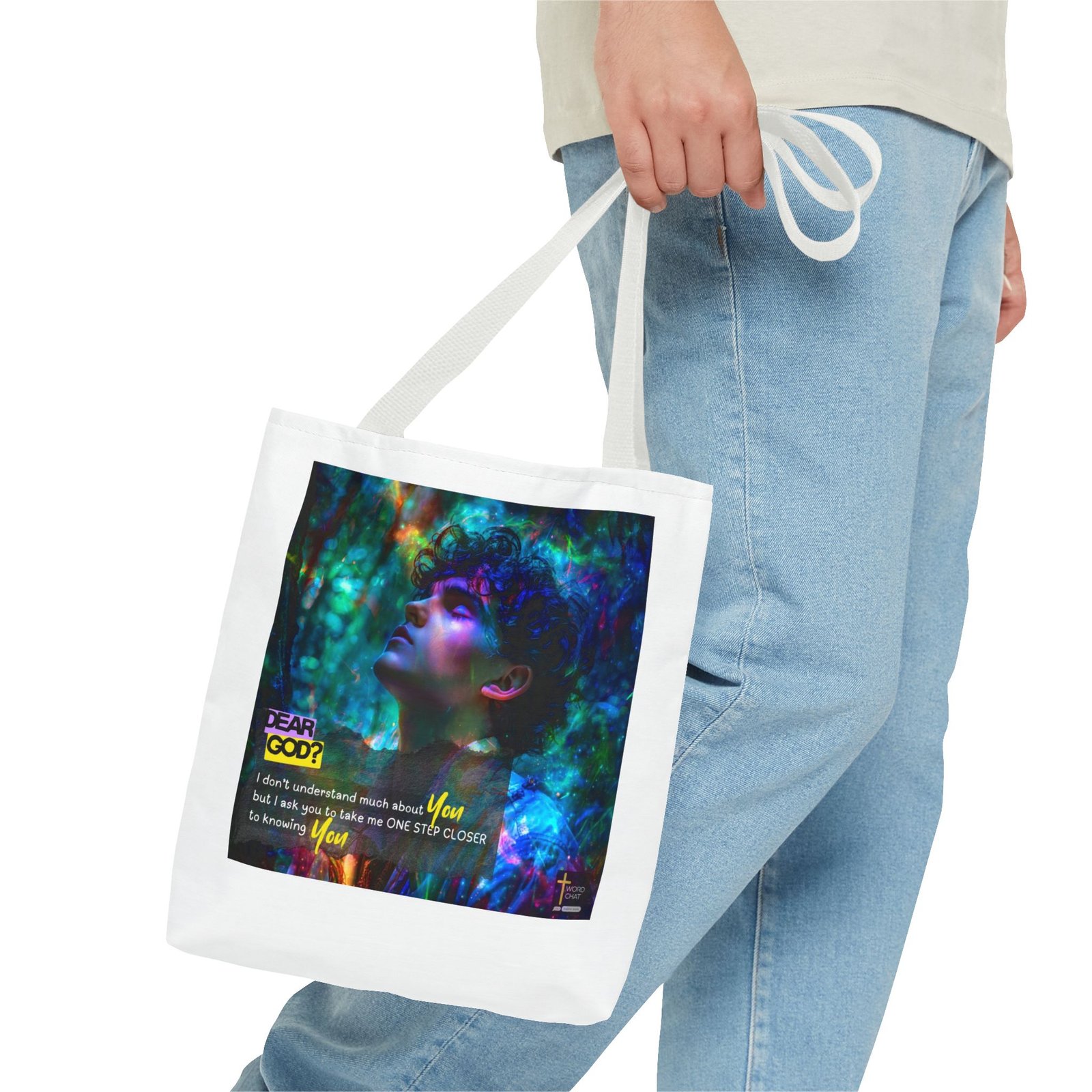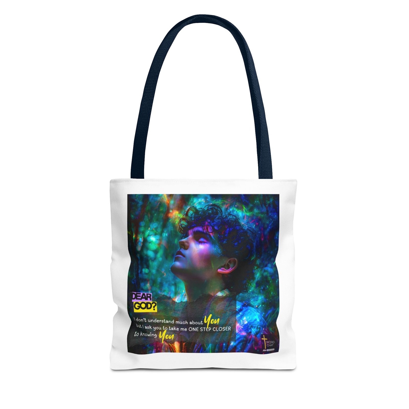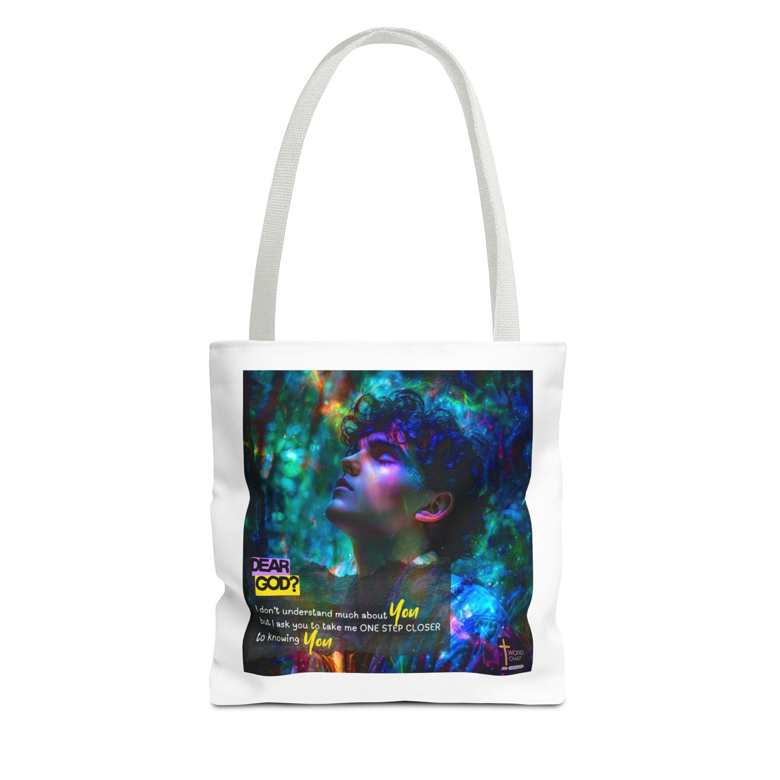 This stunning digital artwork features a contemplative portrait of a person with curly dark hair, bathed in luminous neon lighting in shades of cyan, magenta, and emerald green. The image combines realistic portraiture with abstract psychedelic elements, including swirling light particles and bokeh effects that create a dreamlike, spiritual atmosphere. Overlaid text reading “DEAR GOD?” in bold yellow lettering introduces an inspirational prayer message about seeking closer connection with the divine. The composition blends modern digital art techniques with religious messaging, featuring the phrase “I don’t understand much about You but I ask you to take me ONE STEP CLOSER to knowing You” in white and yellow text. The WordChat logo and ‘inspire souls’ tagline sit in the bottom right corner, showing a place find soul stirring messages to share, as well as join a Christian social media platform.