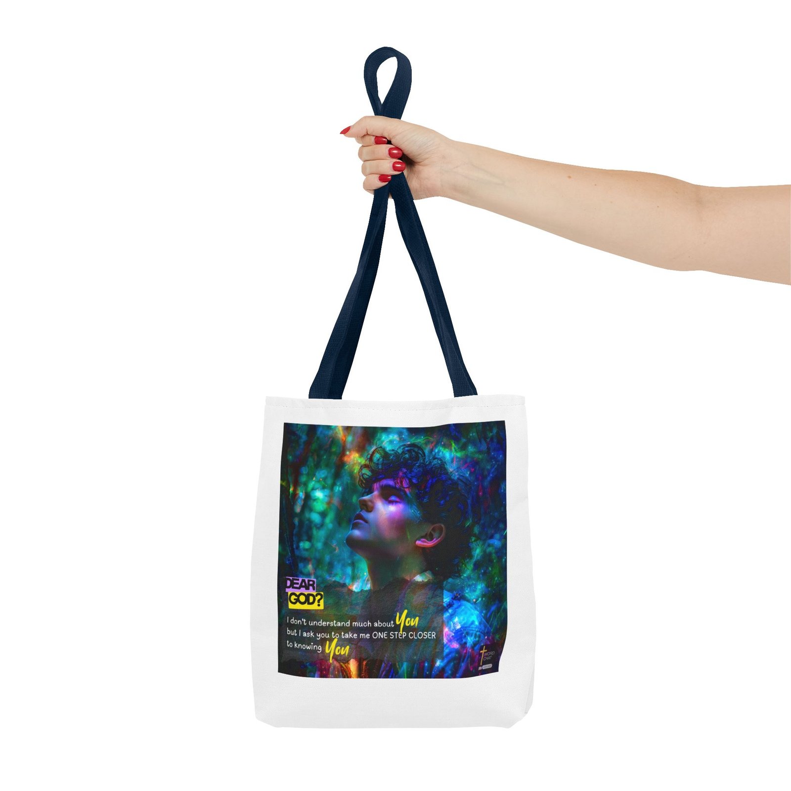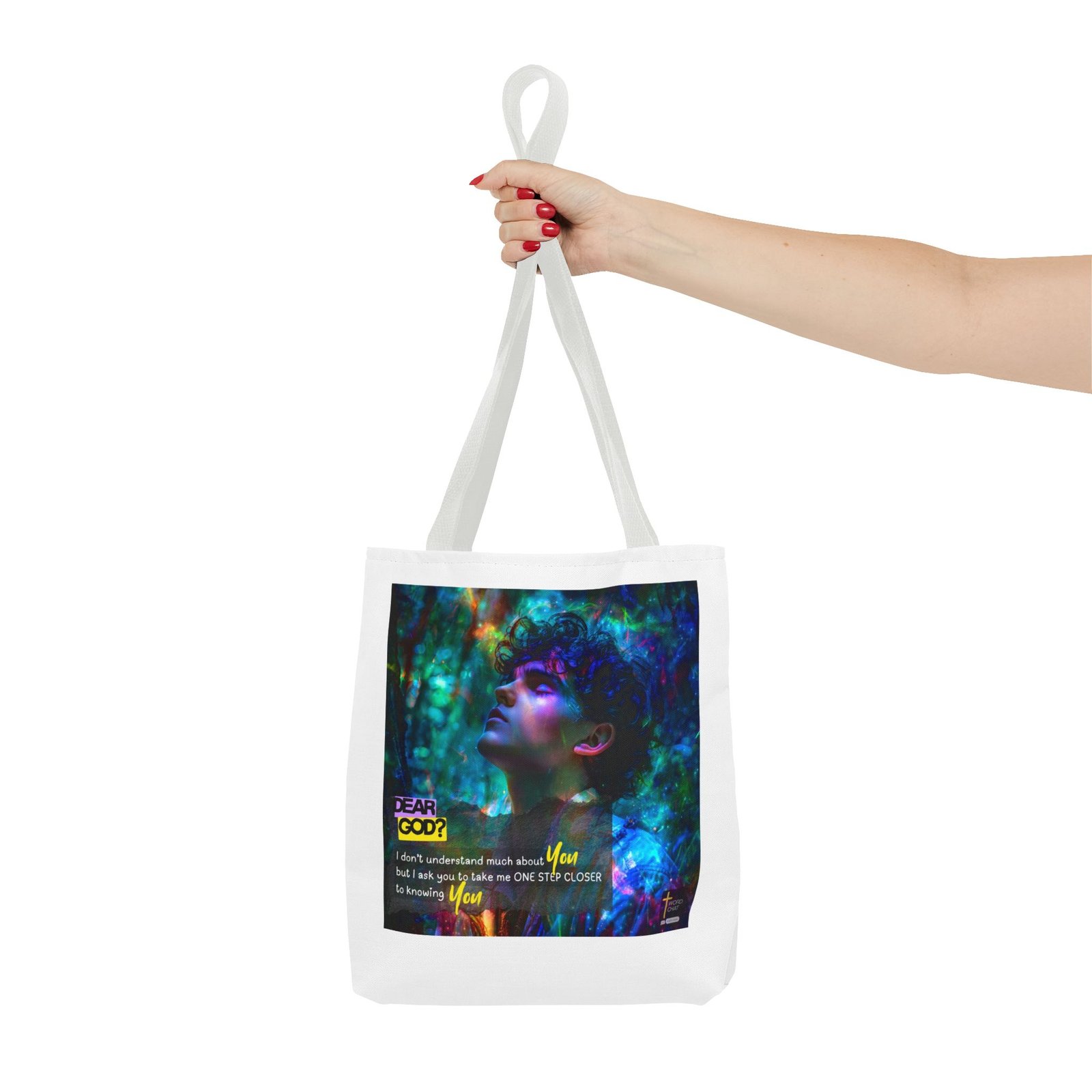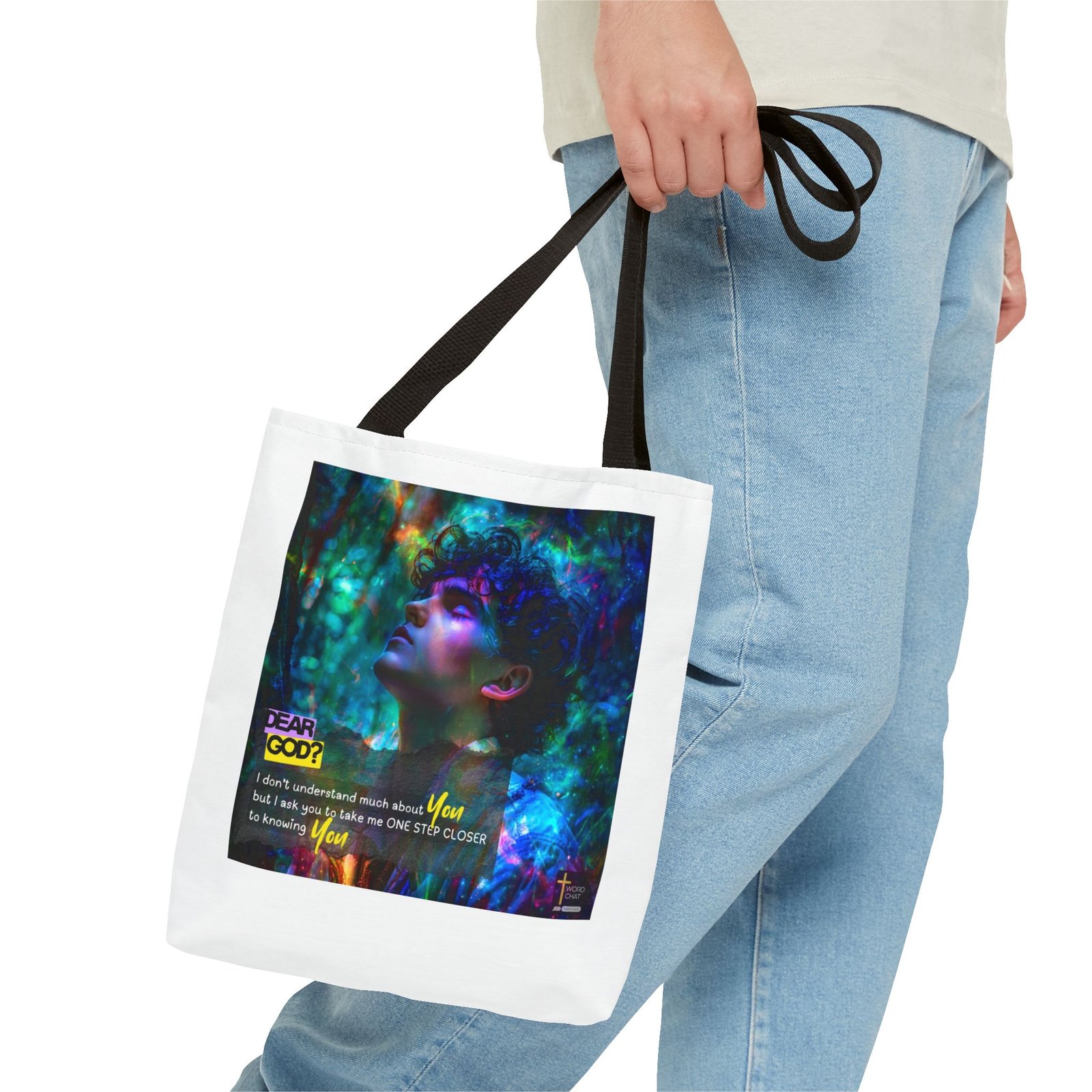 This stunning digital artwork features a contemplative portrait of a person with curly dark hair, bathed in luminous neon lighting in shades of cyan, magenta, and emerald green. The image combines realistic portraiture with abstract psychedelic elements, including swirling light particles and bokeh effects that create a dreamlike, spiritual atmosphere. Overlaid text reading “DEAR GOD?” in bold yellow lettering introduces an inspirational prayer message about seeking closer connection with the divine. The composition blends modern digital art techniques with religious messaging, featuring the phrase “I don’t understand much about You but I ask you to take me ONE STEP CLOSER to knowing You” in white and yellow text. The WordChat logo and ‘inspire souls’ tagline sit in the bottom right corner, showing a place find soul stirring messages to share, as well as join a Christian social media platform.