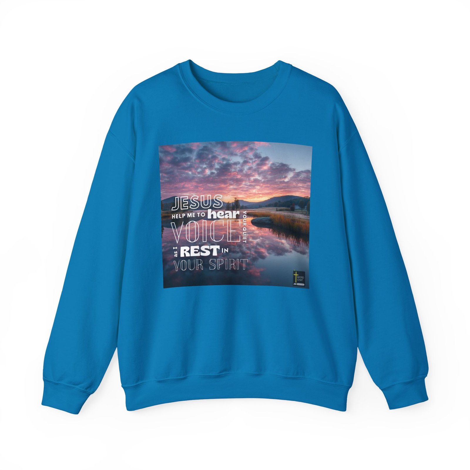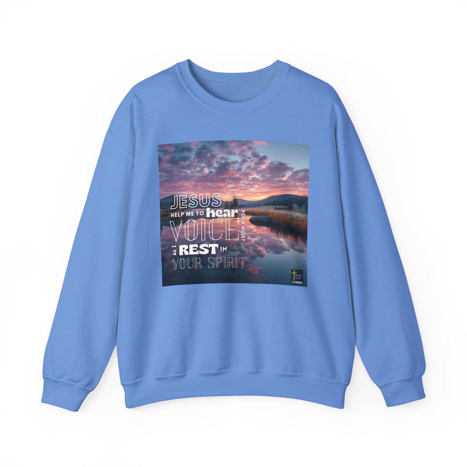 This inspirational graphic features a breathtaking sunrise or sunset over a tranquil mountain lake, with vibrant pink and orange clouds reflecting perfectly on the calm water below. Bold, outlined text overlays the scenic landscape with the spiritual message “Jesus help me to hear your voice as I quiet my soul and rest in your spirit,” emphasizing themes of faith and inner peace. The composition uses a natural valley setting with evergreen trees, grassy marshland, and distant mountains to create a serene backdrop that enhances the devotional message. The image employs a modern design style with clean typography in white lettering, combining contemporary graphic design with classical spiritual messaging. The WordChat logo and ‘inspire souls’ tagline sit in the bottom right corner, showing the brand of this platform for finding and sharing soul stirring messages.