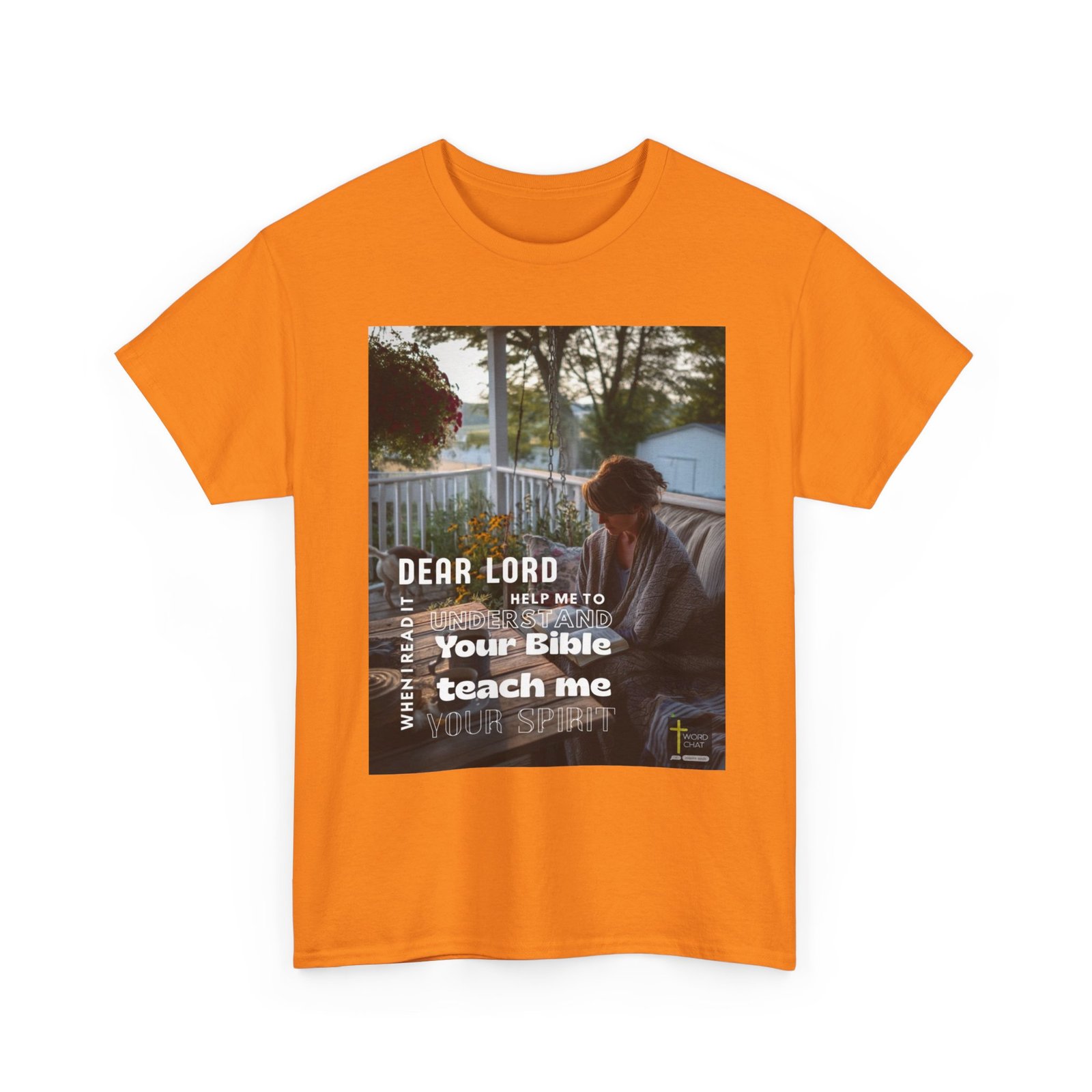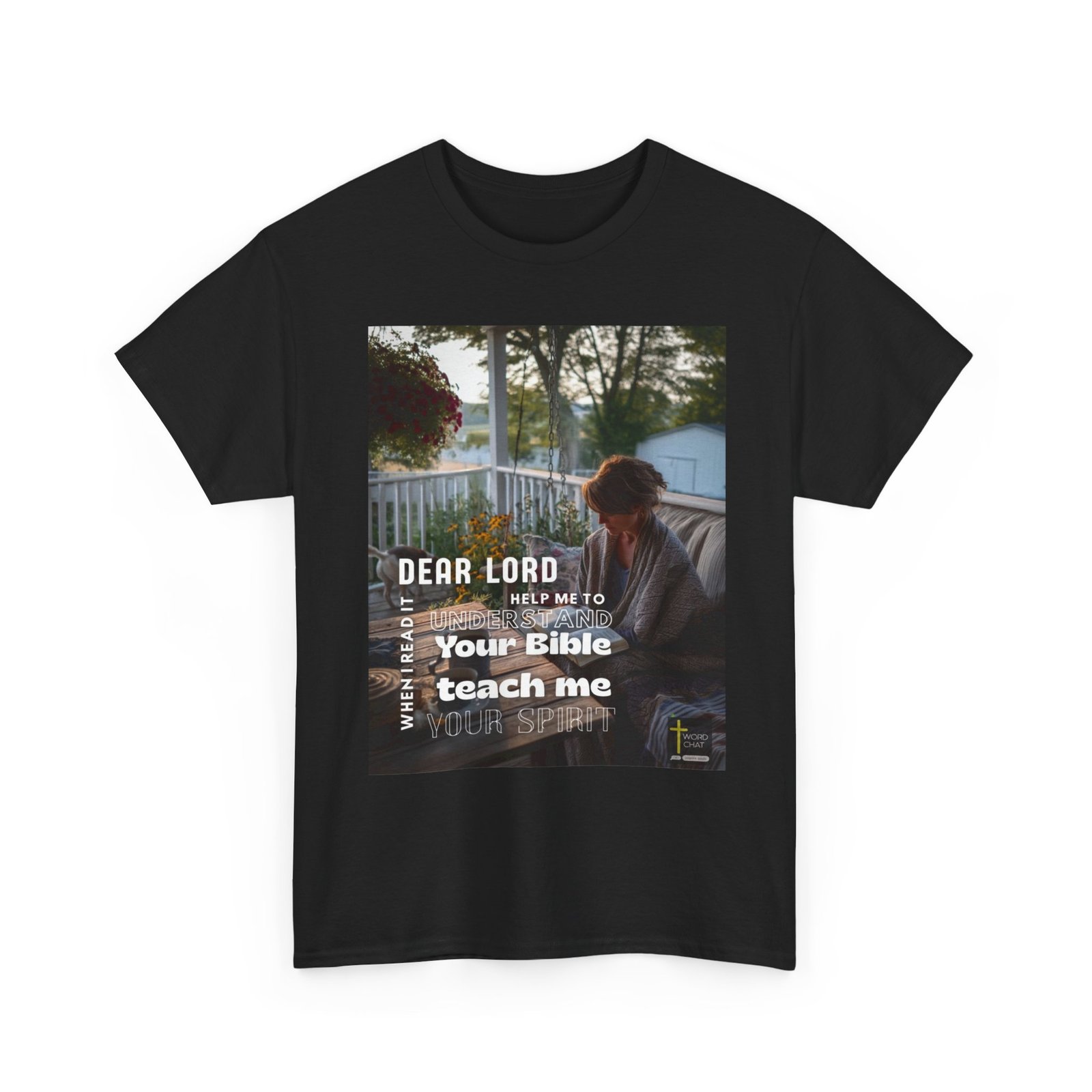 A woman sits peacefully on a porch swing, reading her Bible in a serene outdoor setting with a scenic lake view. The inspirational prayer graphic overlays the image with white text reading “Dear Lord, help me to understand Your Bible, teach me Your Spirit” along with “When I read it” positioned vertically. The scene captures a tranquil moment of faith and spiritual reflection, featuring hanging flowers, wooden furnishings, and natural landscape elements in soft, warm lighting. The WordChat logo and ‘inspire souls’ tagline sit in the bottom right corner, showing the brand of this platform for finding and sharing soul stirring messages.
