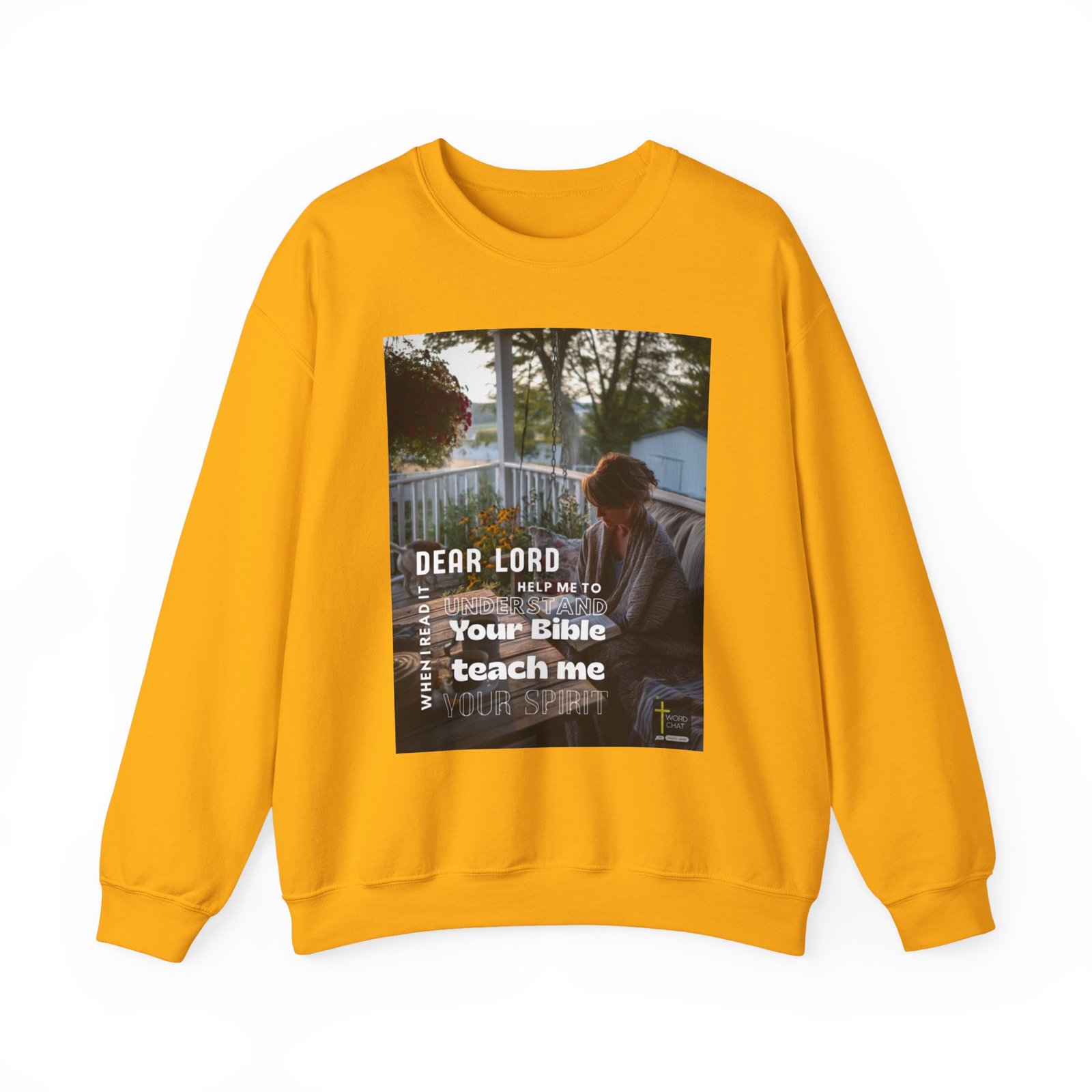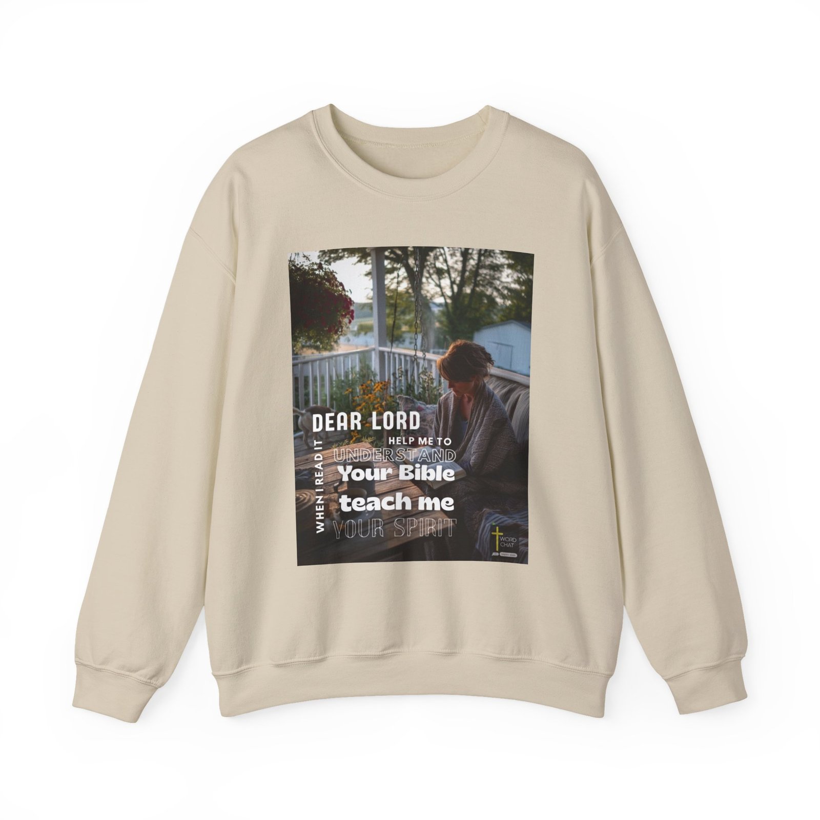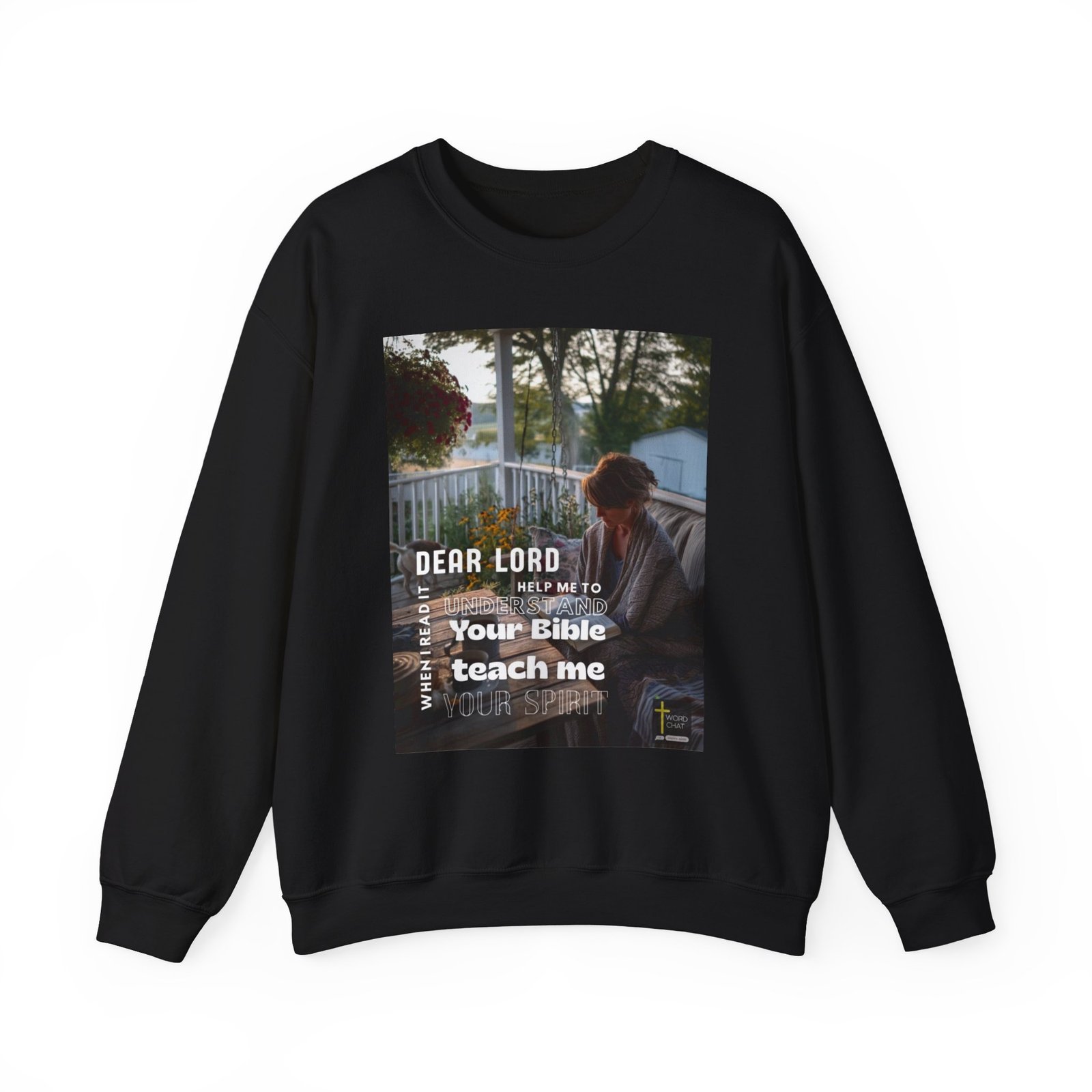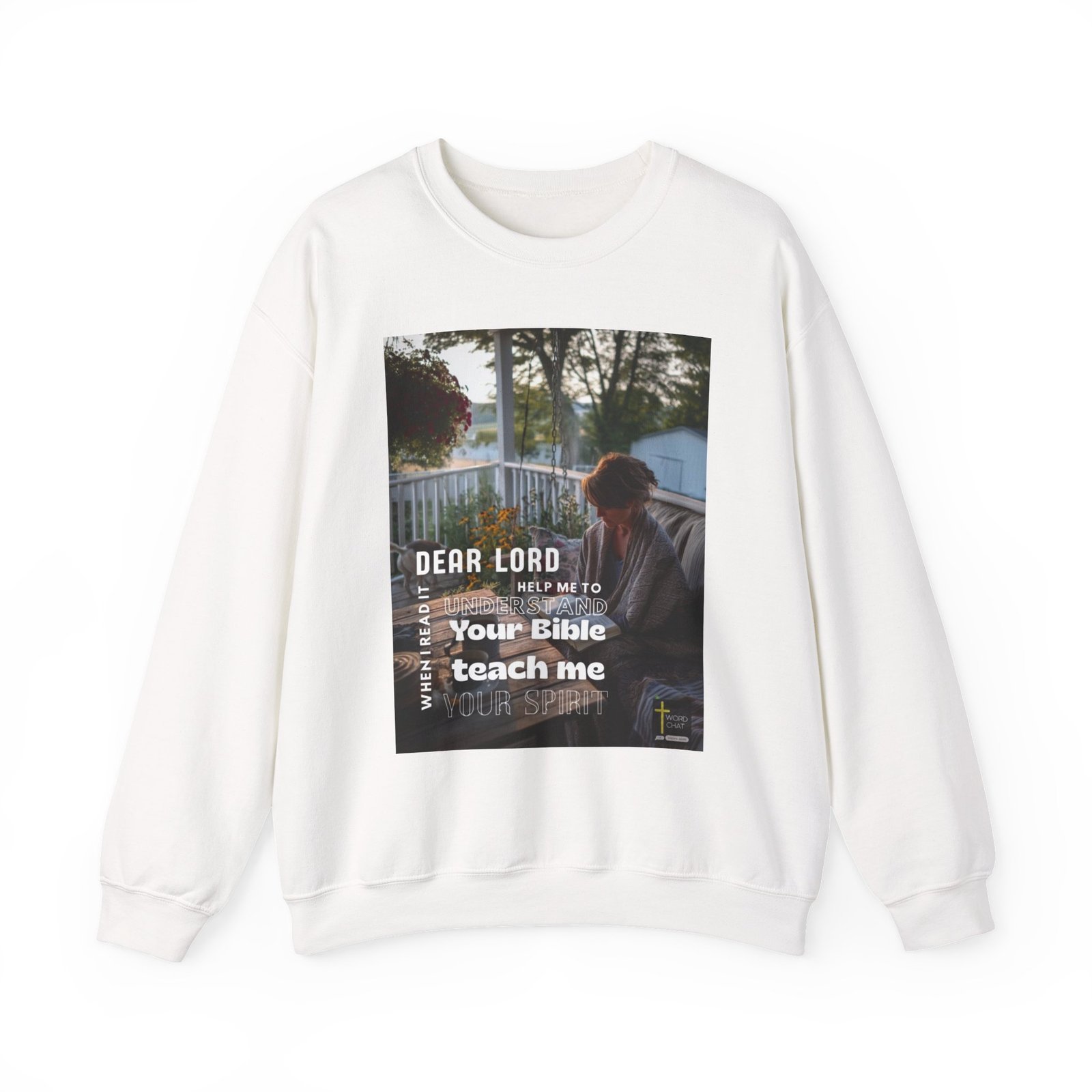 This inspirational religious image features a woman seated on a porch swing, holding an open Bible while engaged in personal prayer and study. The serene outdoor setting includes a white railing, hanging flowers in deep burgundy tones, and a peaceful countryside landscape visible in the background. The photograph captures a contemplative moment of spiritual devotion with warm, natural lighting that emphasizes the tranquil atmosphere. White text overlays the image with the prayer “Dear Lord, when I read it, help me to understand Your Bible, teach me Your Spirit,” along with the Word Chat logo and an inspirational cross symbol.