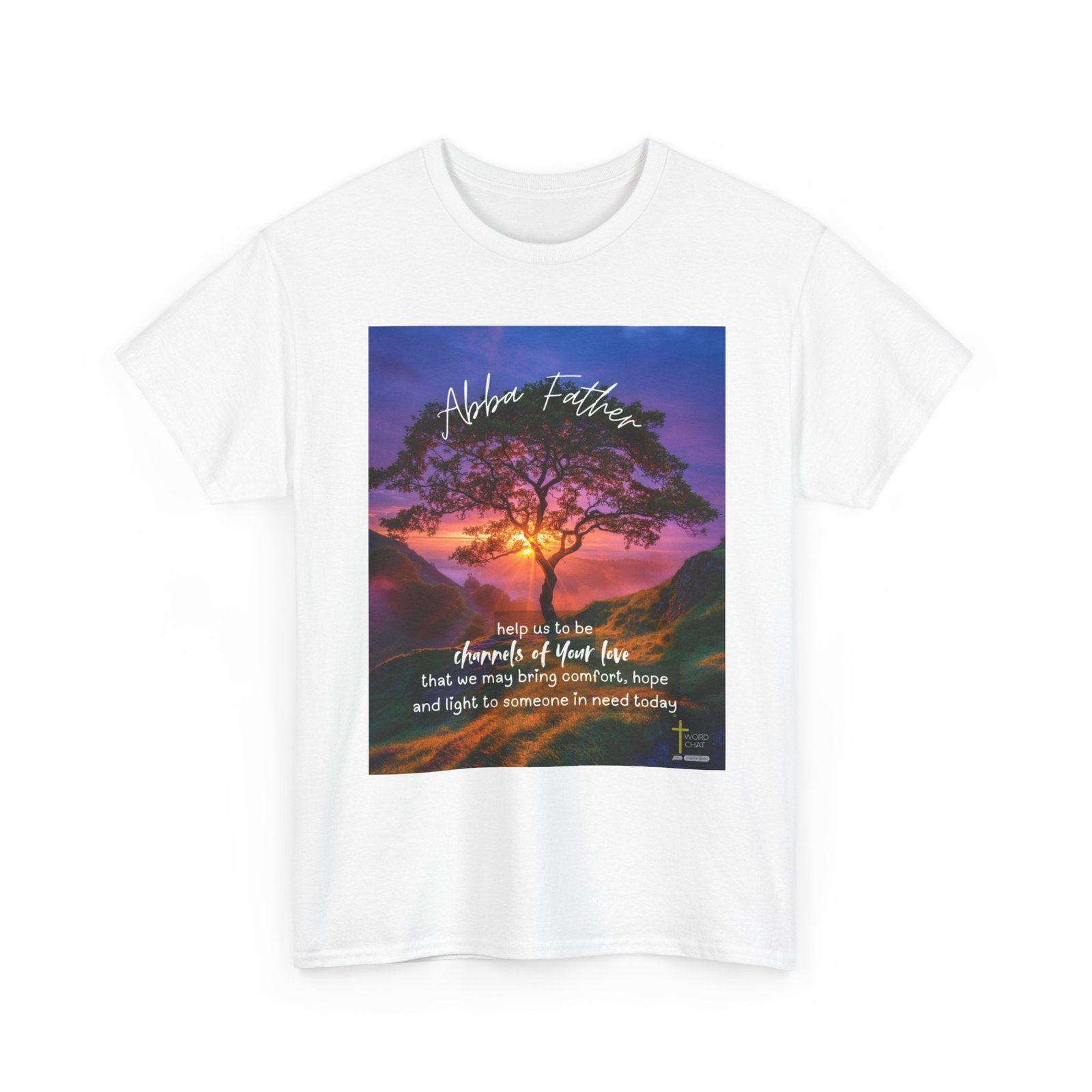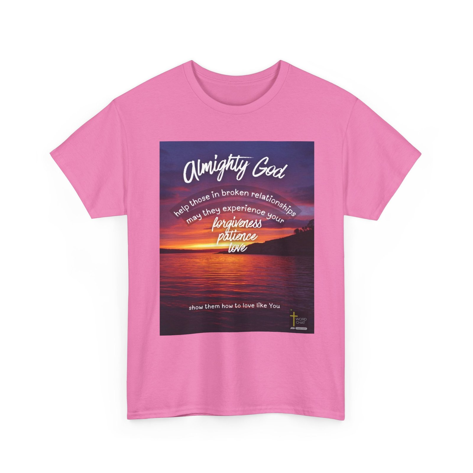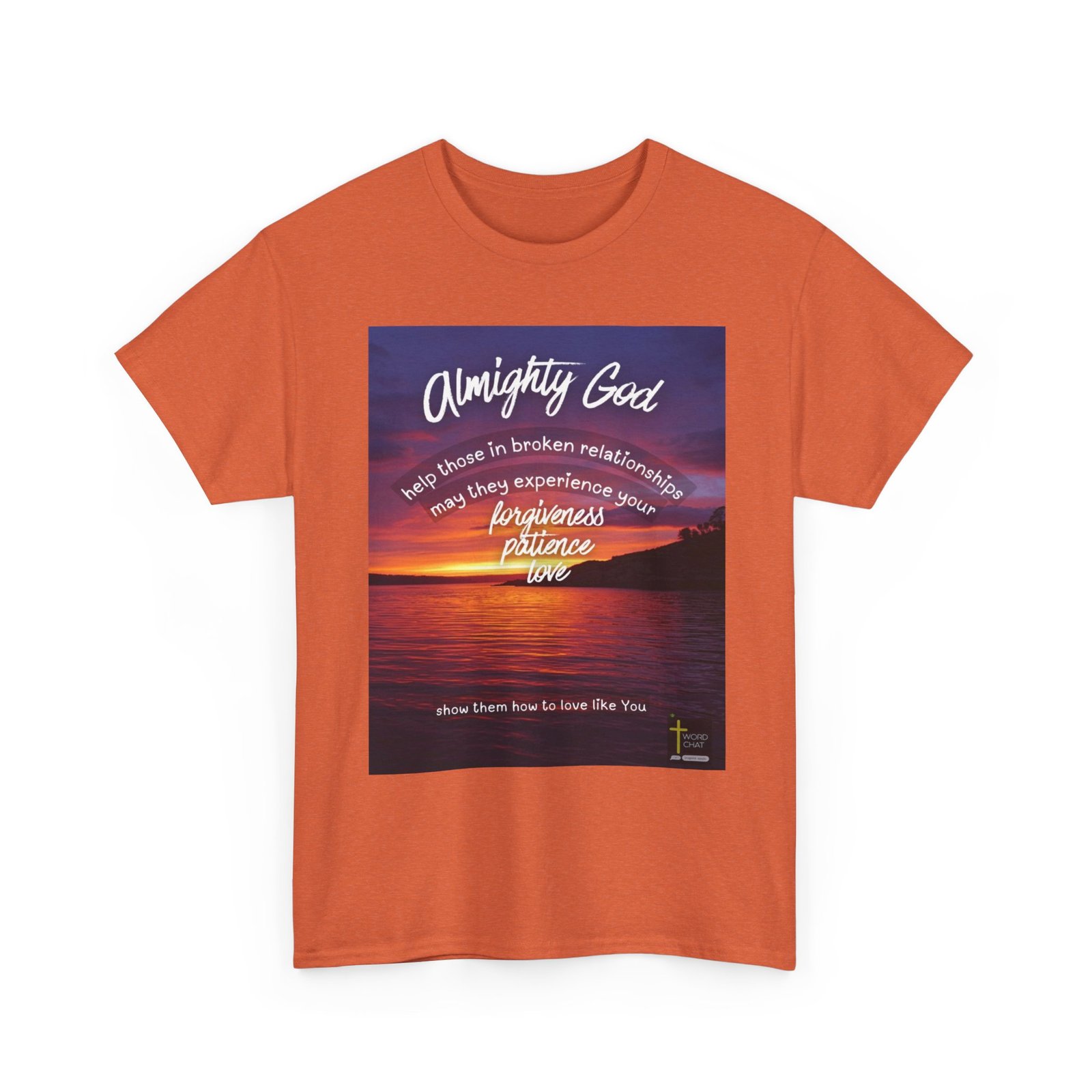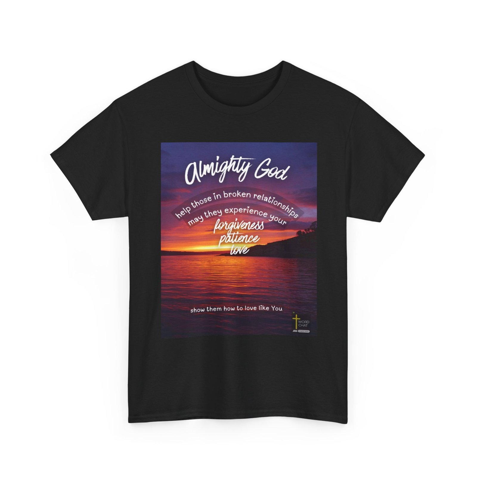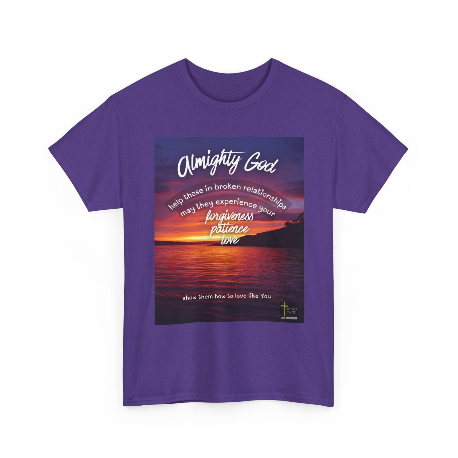 This inspirational religious image features a stunning sunset over a tranquil water landscape, creating a serene and peaceful backdrop for the spiritual message displayed across it. The text begins with “Almighty God” at the top in elegant white script font, followed by a prayer asking for help with broken relationships and requesting forgiveness, patience, and love. The central message emphasizes showing others how to love like God, serving as a daily affirmation for faith-based devotion. The WordChat logo and ‘inspire souls’ tagline sit in the bottom right corner, showing the brand of this platform for finding and sharing soul stirring messages.