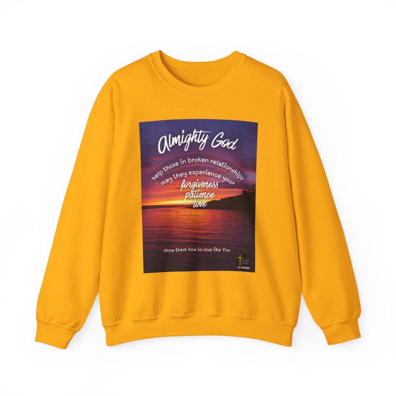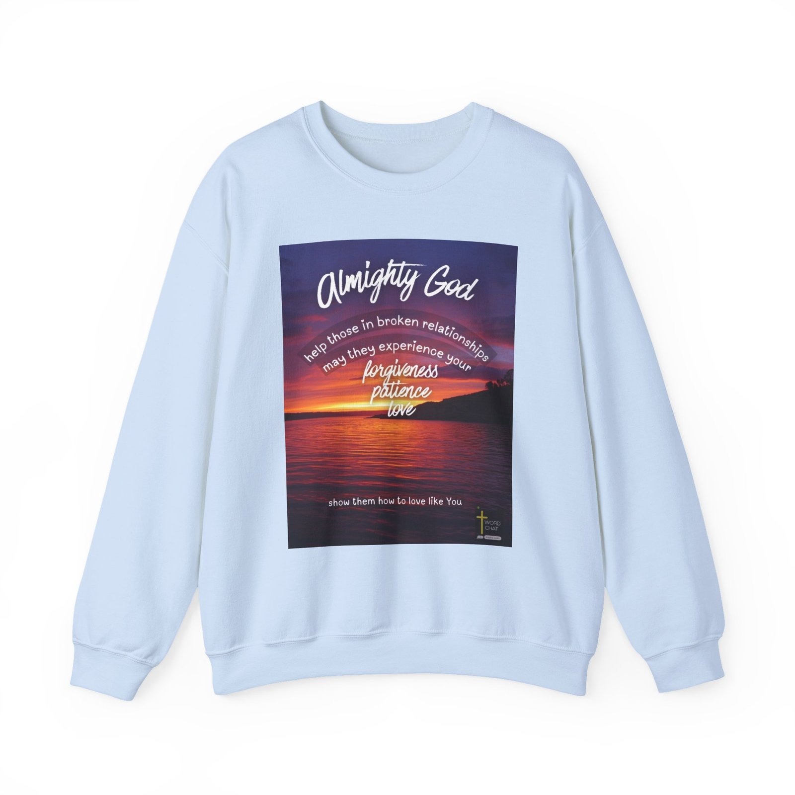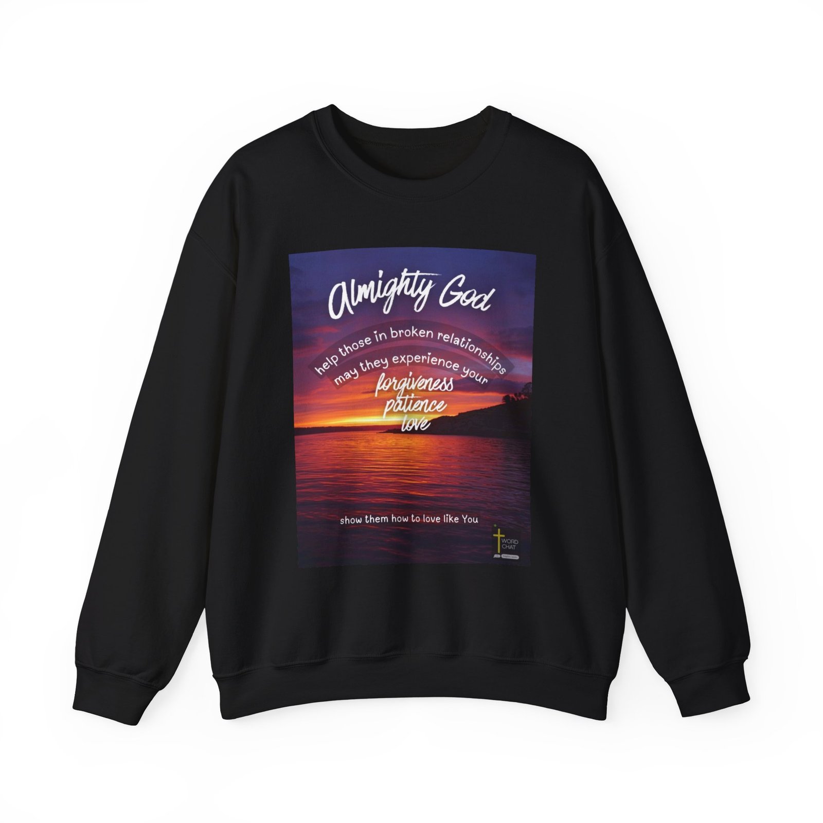This uplifting religious image features a stunning sunset over a calm body of water, with warm orange, pink, and purple hues reflecting across the rippling surface. Overlaid on the scenic landscape is inspirational text beginning with “Almighty God” in large cursive script, followed by a prayer requesting divine help for those in broken relationships. The message emphasizes Christian virtues including forgiveness, patience, and love, culminating in the phrase “show them how to love like You.” The composition uses concentric circular text bands to create visual depth and guide the viewer’s eye toward the spiritual message. The WordChat logo and ‘inspire souls’ tagline sit in the bottom right corner, showing the brand of this platform for finding and sharing soul stirring messages.