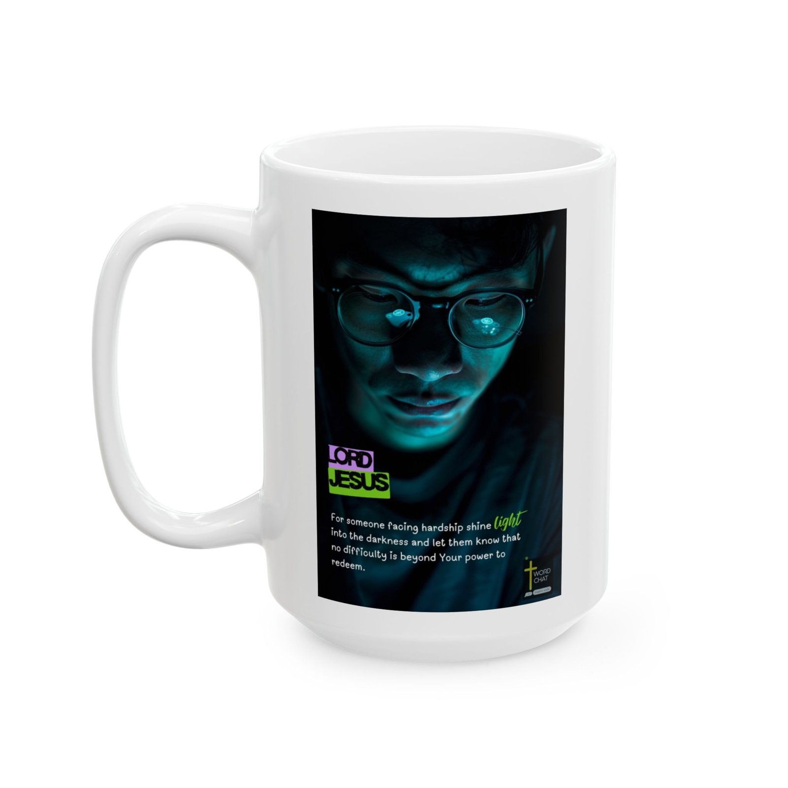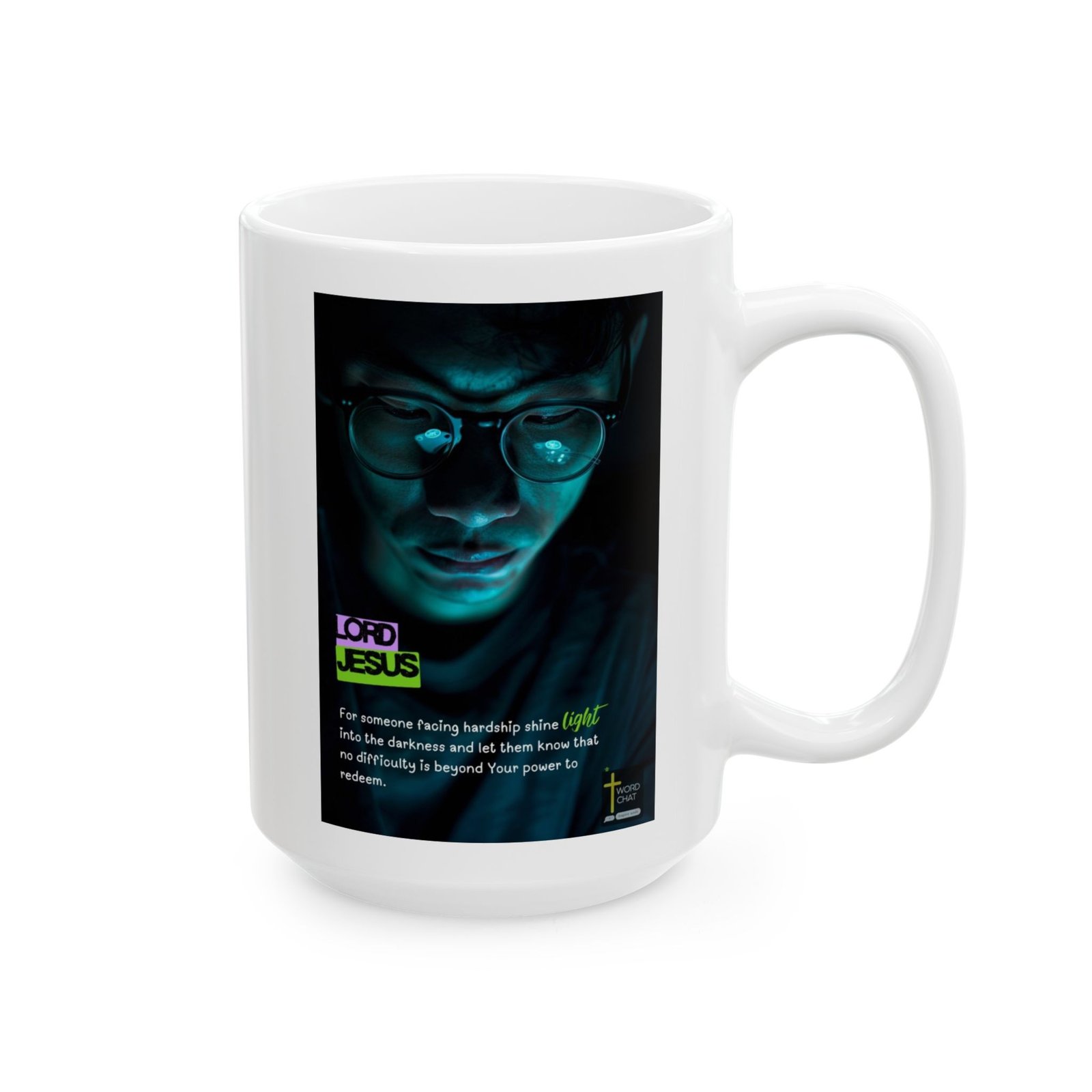 This inspirational religious graphic features a close-up portrait of a person wearing glasses with glowing cyan light reflections in the lenses against a dark, moody background with teal-blue color grading. The image displays bold typography with “LORD JESUS” in purple and neon-green text in the lower left corner, accompanied by a motivational message about finding light during hardship. The composition emphasizes hope and spiritual encouragement through the contrast between darkness and the luminous elements reflecting in the subject’s eyewear. The WordChat logo and ‘inspire souls’ tagline sit in the bottom right corner, showing the brand of this platform for finding and sharing soul stirring messages.. The modern digital art style combines contemporary design aesthetics with faith-based messaging to create an emotionally resonant visual meant for social media sharing and spiritual inspiration.