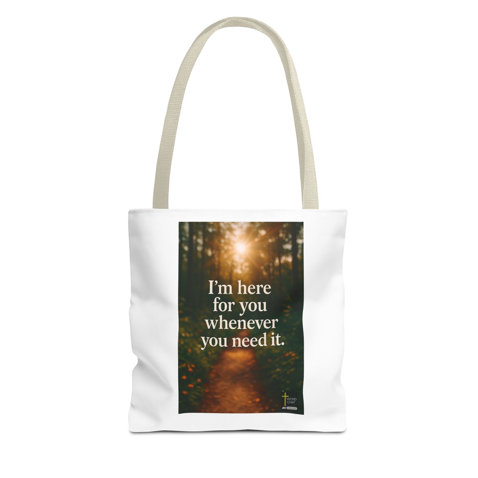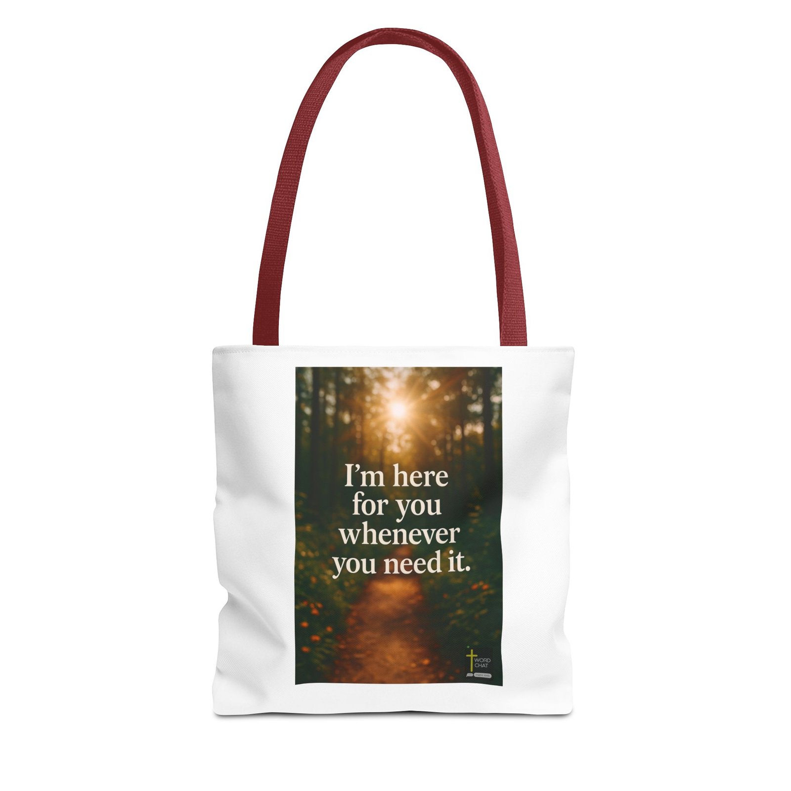 This uplifting image features the motivational text “I’m here for you whenever you need it” displayed in large, elegant white serif typography centered over a serene forest landscape. The background showcases a sun-dappled woodland path with golden sunlight streaming through towering trees, creating a warm, peaceful atmosphere with bokeh effects and autumn-toned foliage. The inspirational quote conveys themes of support, reliability, and emotional connection, making it ideal for sharing messages of encouragement and friendship. The image includes branding from WordChat with an “inspire souls” tagline and a Christian cross logo in the bottom right corner. The overall aesthetic combines nature photography with modern graphic design, creating an emotionally resonant visual perfect for social media posts, greeting cards, or faith-based content.