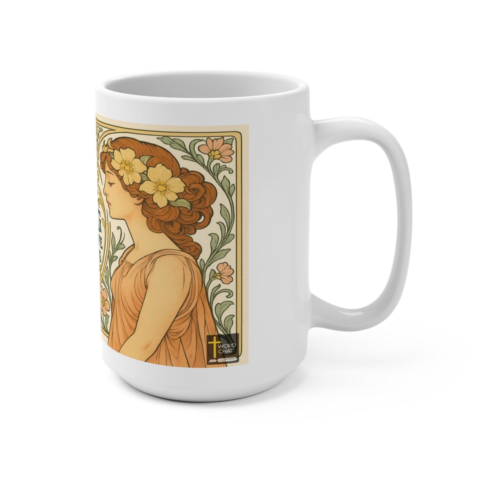 This elegant Art Nouveau-style illustration features a serene woman with flowing auburn hair adorned with delicate flowers, shown in profile against a soft cream background. The image displays the romantic quote “What if the love you’ve been searching for your whole life has been searching for you, too?” rendered in teal serif lettering within an ornate circular frame. The composition is framed by intricate floral borders in peachy and golden tones, with curling decorative scrollwork and botanical elements characteristic of the Art Nouveau movement. The soft color palette of warm peachy hues, sage greens, and golden accents creates a dreamy, vintage aesthetic that evokes early 20th-century design sensibilities. A WordChat logo appears in the lower right corner, indicating the image’s source.