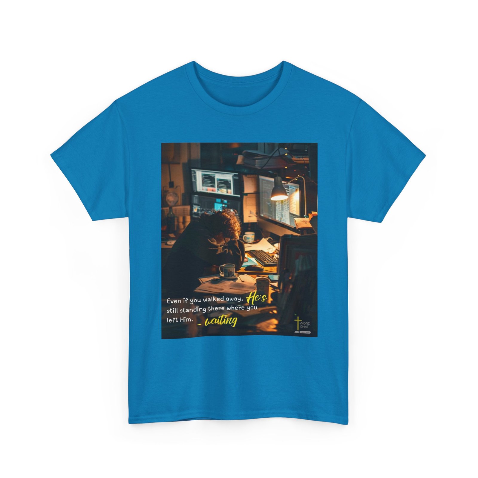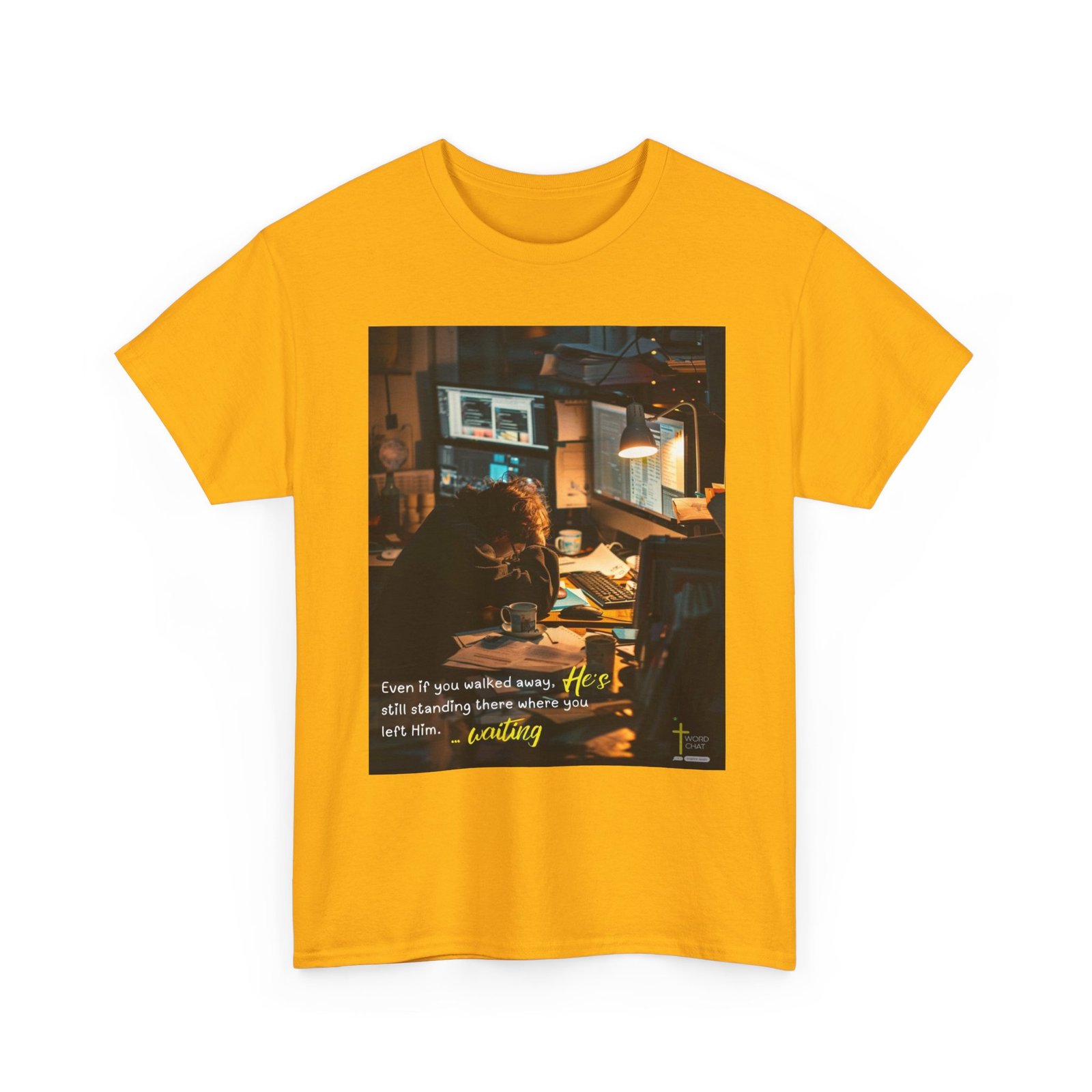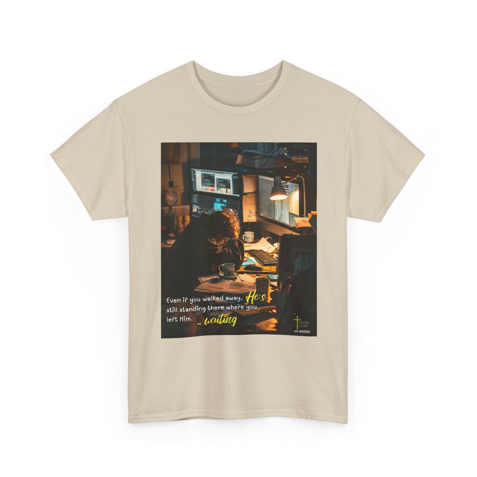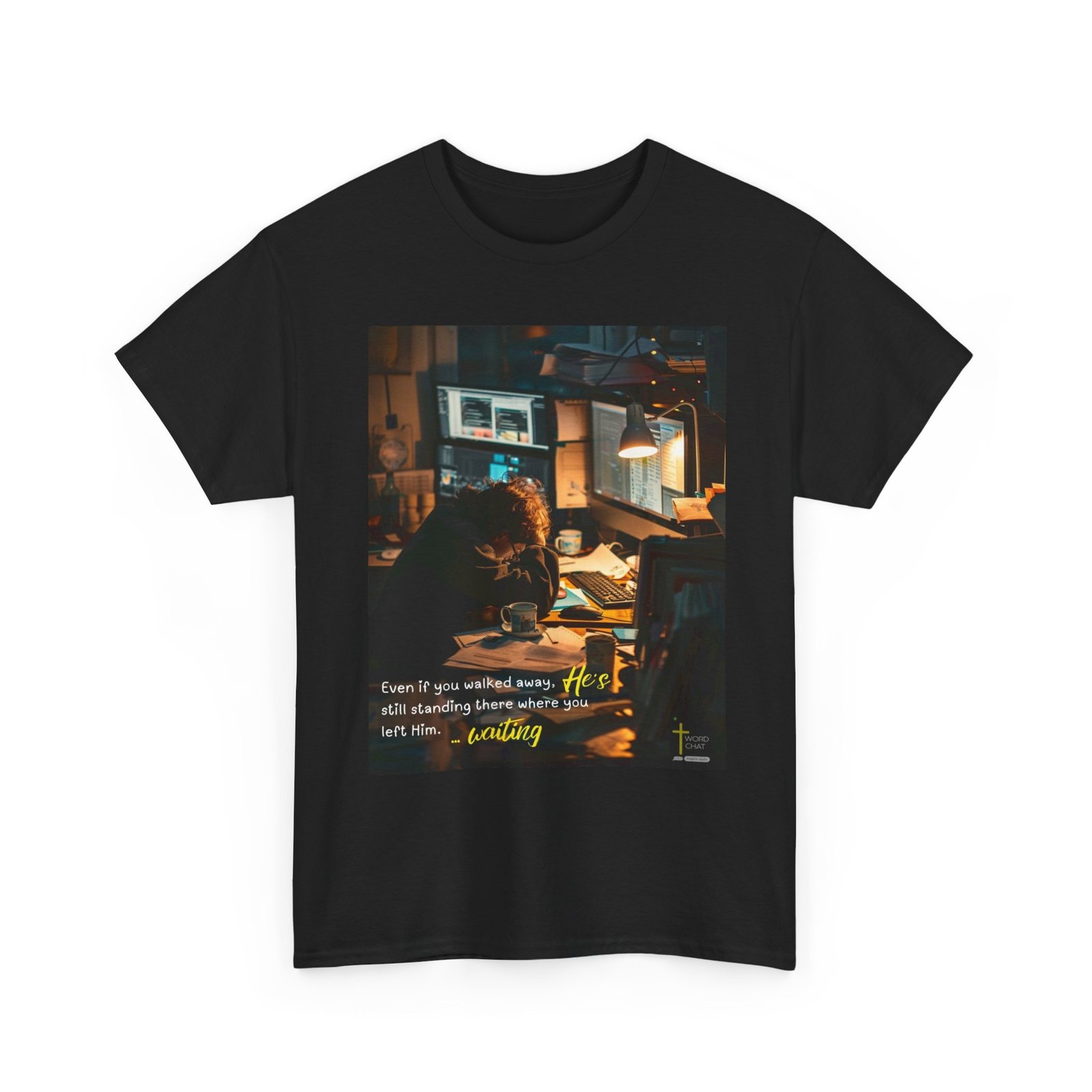 This evocative photograph captures a person working late at night in a dimly lit office or study space, illuminated by warm desk lamp lighting that creates a contemplative atmosphere. The scene depicts a focused individual hunched over their workspace surrounded by multiple computer monitors displaying data, alongside scattered papers, coffee mugs, and various work materials that suggest long hours of dedicated effort. The image employs a cinematic style with dramatic golden-hour lighting and soft focus backgrounds, emphasizing the solitary nature of intensive work during evening hours. A spiritual overlay featuring white and yellow text reads “Even if you walked away, He’s still standing there where you left Him… waiting,” paired with the WordChat logo featuring a cross symbol in the bottom right corner. The composition effectively combines contemporary workplace photography with inspirational messaging, creating a meaningful visual narrative about perseverance, faith, and divine presence during challenging times.