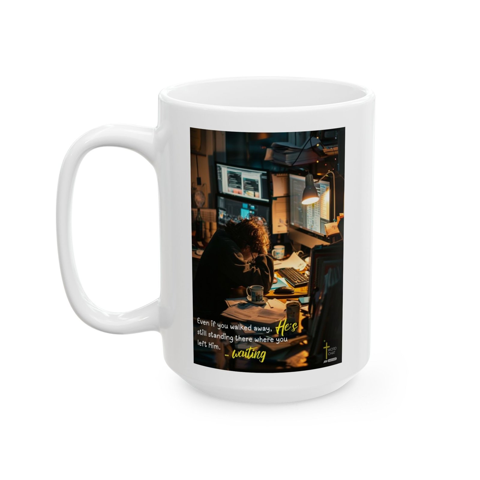 This poignant image captures a person working late at night in a dimly lit office or study space, surrounded by multiple monitors, laptops, and scattered papers illuminated by warm desk lighting. The individual, dressed in dark clothing, sits hunched at their desk with a coffee mug nearby, embodying the exhaustion of prolonged work or study. The atmospheric photograph uses golden and blue tones to create a contemplative mood, with visible stress indicators like the person’s posture and hand gesture. Overlaid text delivers an inspirational spiritual message about divine presence and waiting, accompanied by a cross symbol and “WordChat” branding. The composition effectively merges productivity imagery with emotional depth, creating a meaningful visual metaphor for perseverance and faith during difficult times.
