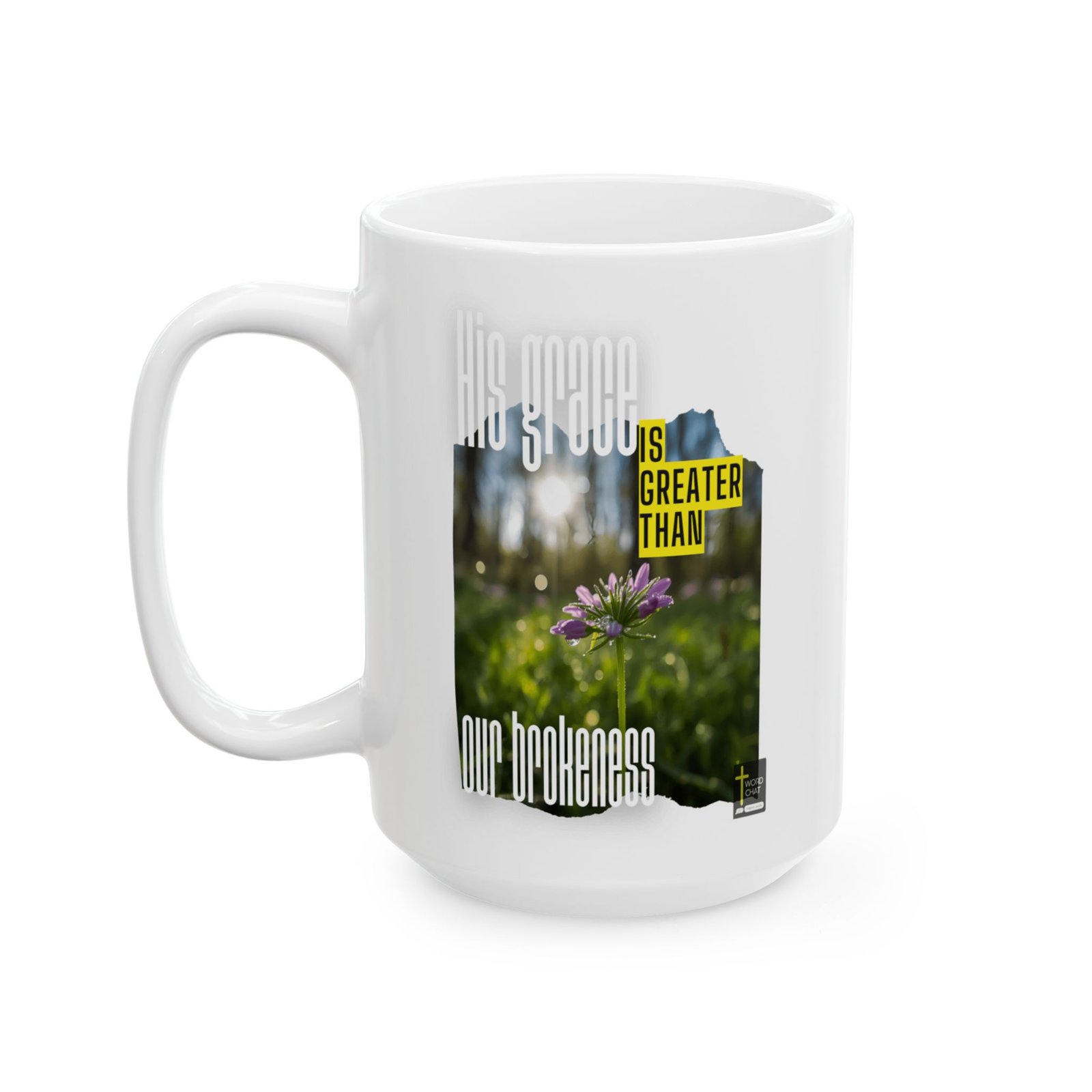 This inspirational image features a delicate purple flower with water droplets glistening on its petals, set against a softly blurred natural garden background. The composition includes decorative bokeh circles and overlaid text stating “His yoke is greater than our burdens,” combining motivational messaging with nature photography. The image displays a modern design style with bold typography contrasting against the serene floral subject matter. A WordChat logo with a cross symbol appears in the lower right corner. The overall aesthetic combines outdoor nature photography with digital graphic design elements to create an uplifting, faith-based visual message.