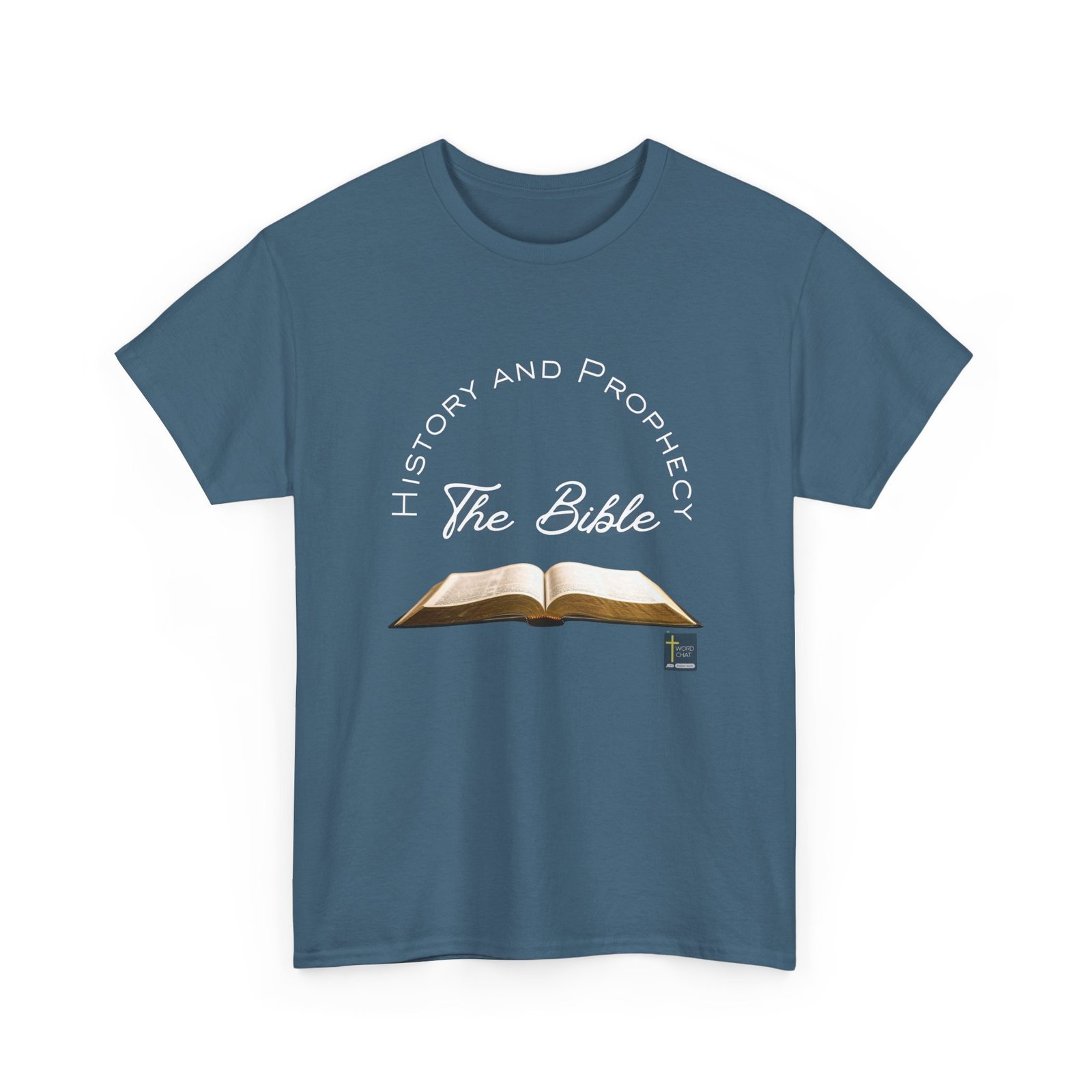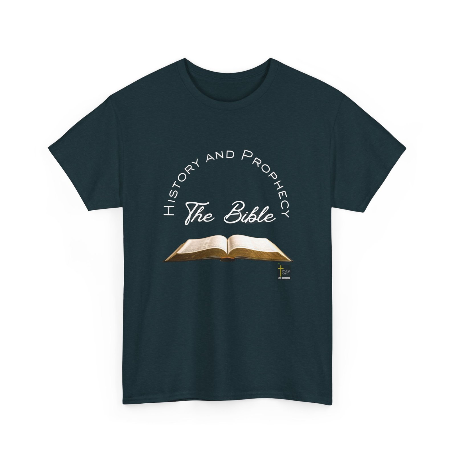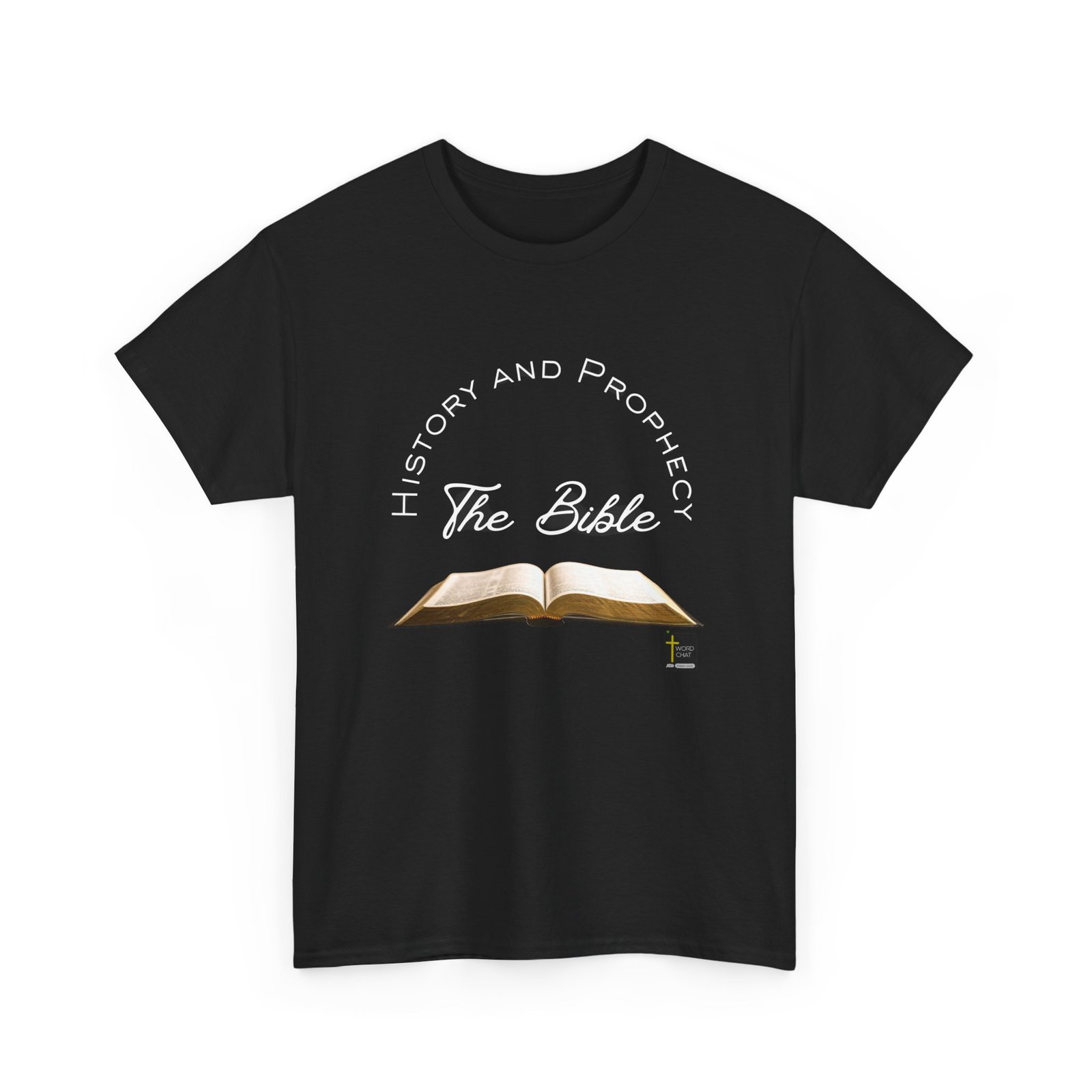 This image features an open Bible as the central focal point, displayed with pages illuminated and text visible on both spreads. The text “The Bible” appears in stylized script lettering in the middle section of the design, accompanied by “History and Prophecy” arranged in a circular arc around the upper portion. The WordChat logo and ‘inspire souls’ tagline sit in the bottom right corner, showing a place find soul stirring messages to share, as well as join a Christian social networking platform.