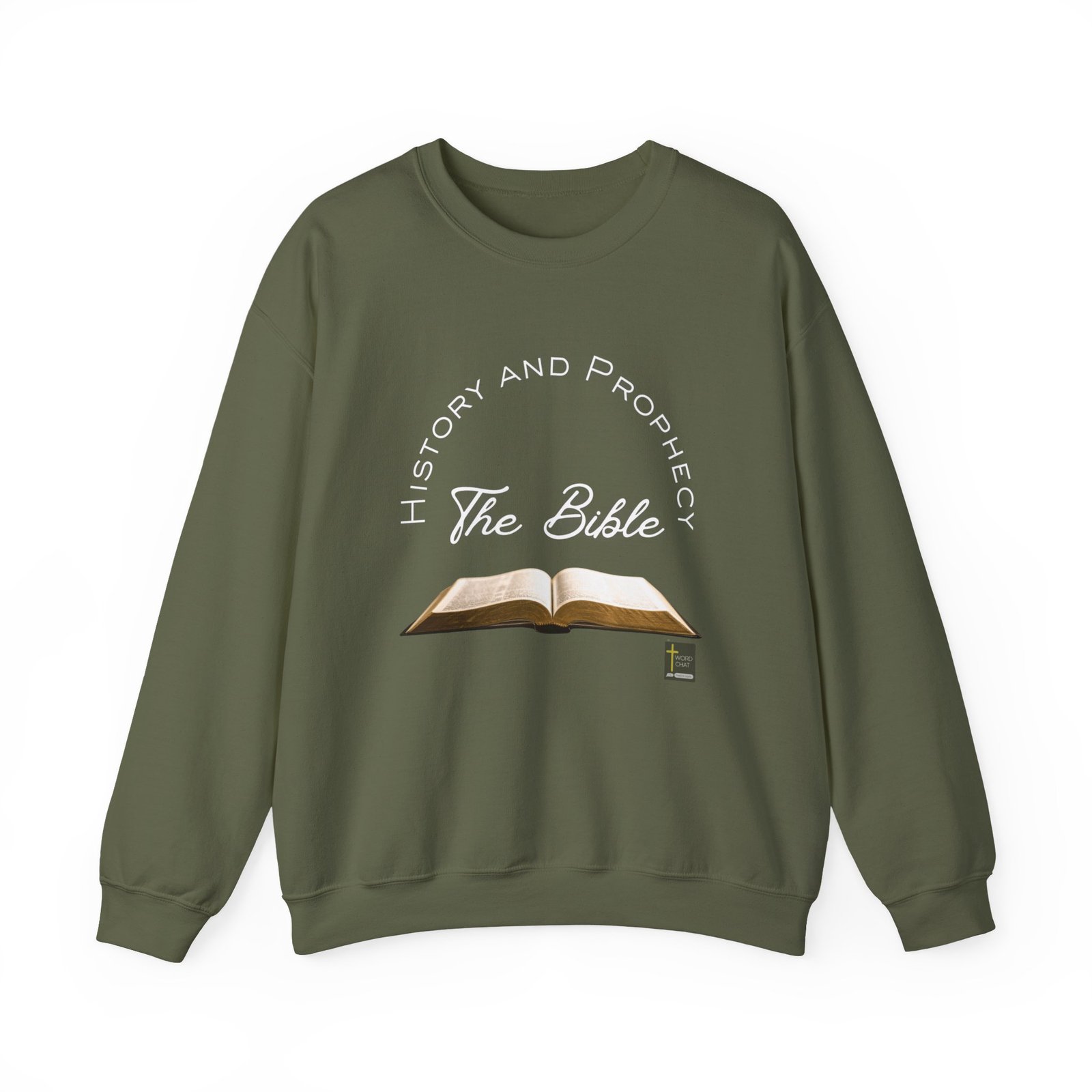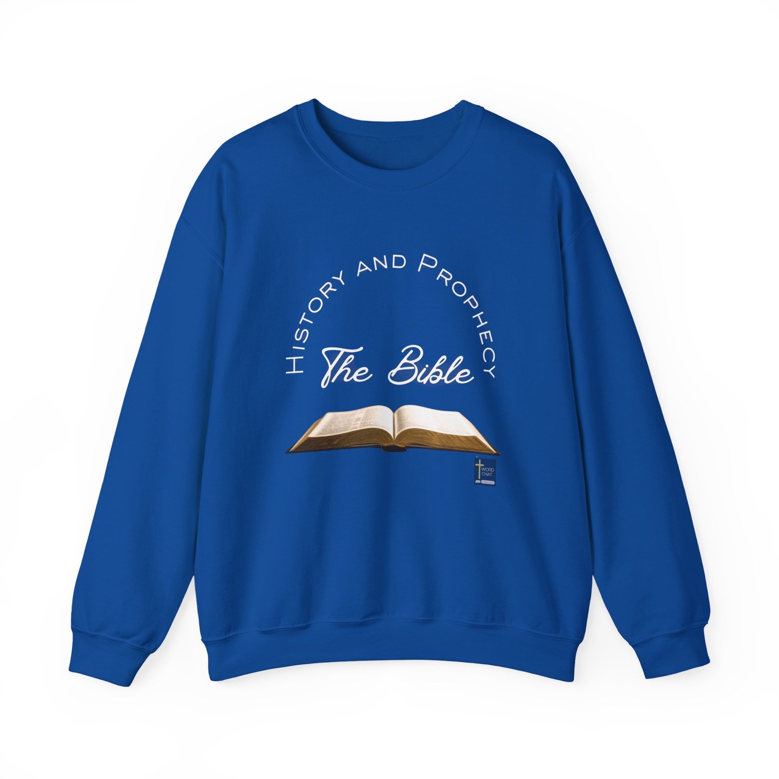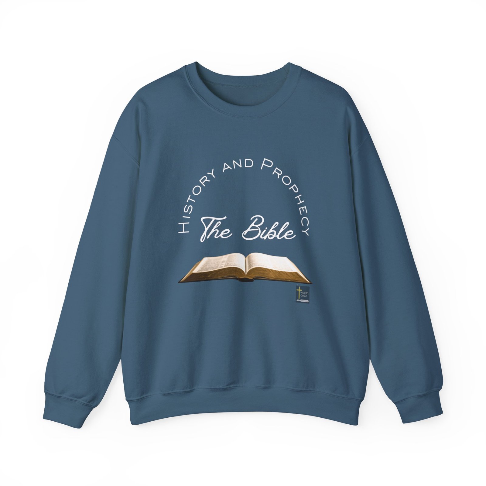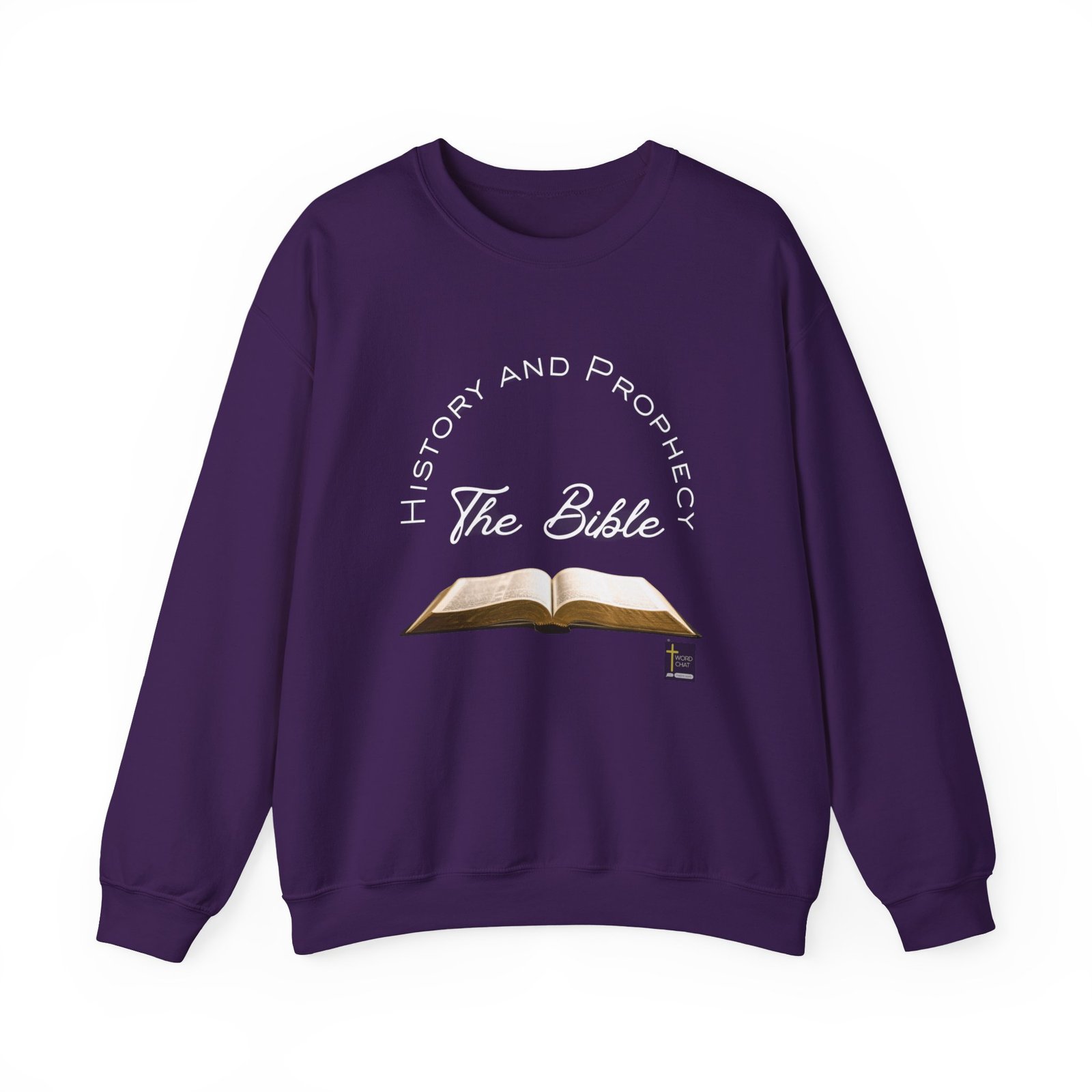 This image features an open Bible displayed centrally with visible text pages, accompanied by vibrant neon-style typography arranged in a circular pattern around it. The text reads “History and Prophecy” at the top and “The Bible” in the center, creating a cohesive design focused on biblical study and prophetic content. A small WordChat logo with a cross symbol appears in the bottom right corner. The overall composition combines traditional religious imagery with modern digital design elements. This visual effectively communicates themes of biblical exploration, religious education, and Christian faith-based content.
