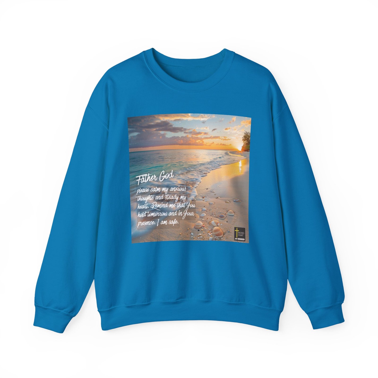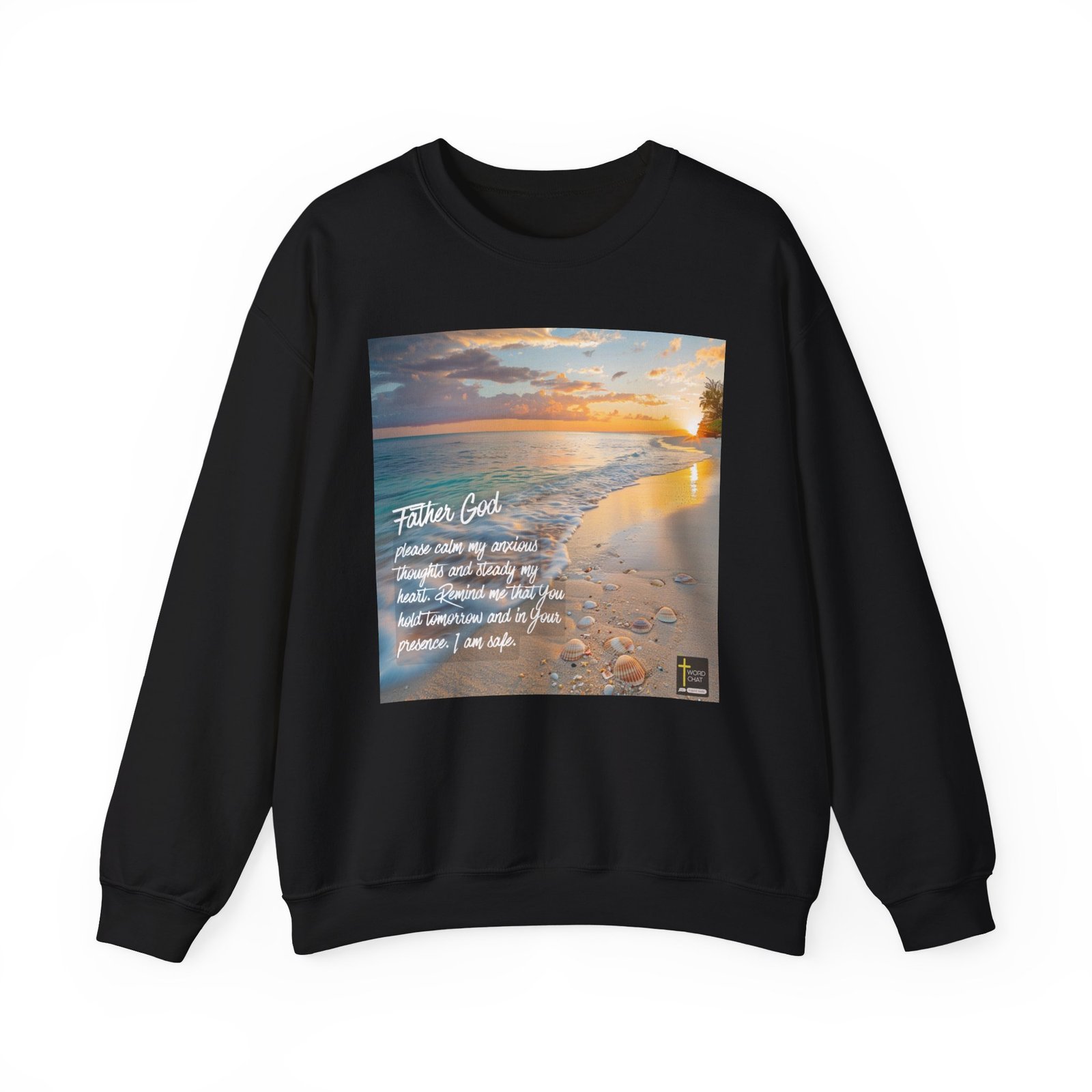 This spiritually inspiring image features a tranquil tropical beach scene at golden hour, showcasing gentle waves lapping against pristine sandy shores lined with scattered seashells. The composition captures a breathtaking sunset with warm golden and orange hues illuminating the sky, complemented by soft turquoise ocean waters and a palm tree visible on the right horizon. Overlaid in elegant white script is a meaningful prayer reading “Father God please calm my anxious thoughts and steady my heart. Remind me that You hold tomorrow and in Your presence, I am safe,” creating a powerful spiritual affirmation. The image style combines motivational Christian messaging with peaceful nature photography, perfect for religious devotionals, faith-based social media content, and inspirational wellness graphics. The WordChat logo appears in the bottom right corner, identifying this as inspirational content designed for spiritual reflection and meditation.