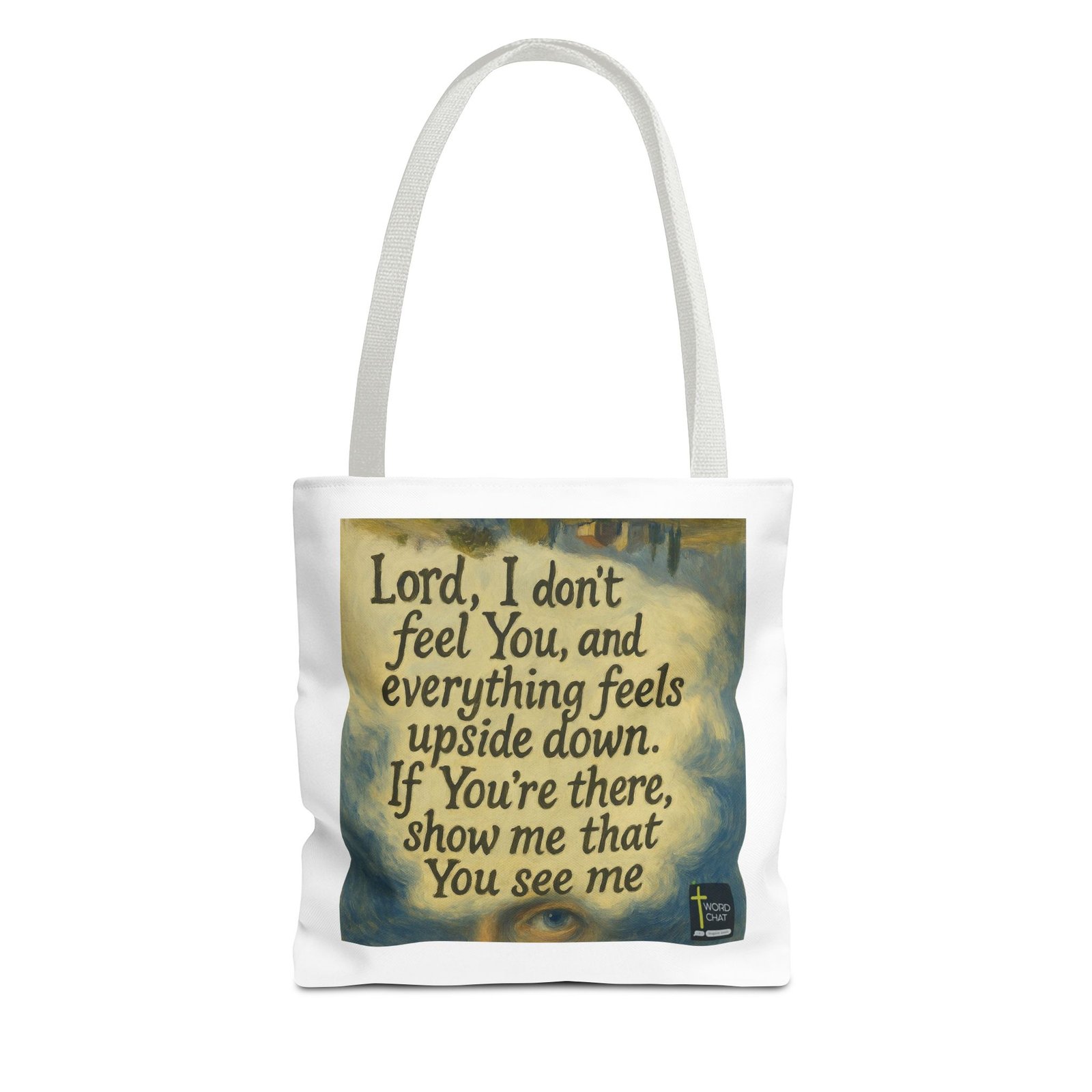 This inspirational religious artwork features a heartfelt prayer message displayed over an impressionistic painted background in soft earth tones, golds, and blues. The text reads “Lord, I don’t feel You, and everything feels upside down. If You’re there, show me that You see me,” expressing vulnerable faith and spiritual questioning. The image employs a classical artistic style reminiscent of Renaissance painting, with the human eye visible in the lower portion as a focal point symbolizing divine sight and awareness. The WordChat logo and ‘inspire souls’ tagline sit in the bottom right corner, showing the brand of this platform for finding and sharing soul stirring messages. This motivational graphic is ideal for Christians seeking encouragement during difficult times or spiritual doubt, combining art, scripture, and emotional honesty in a shareable format.
