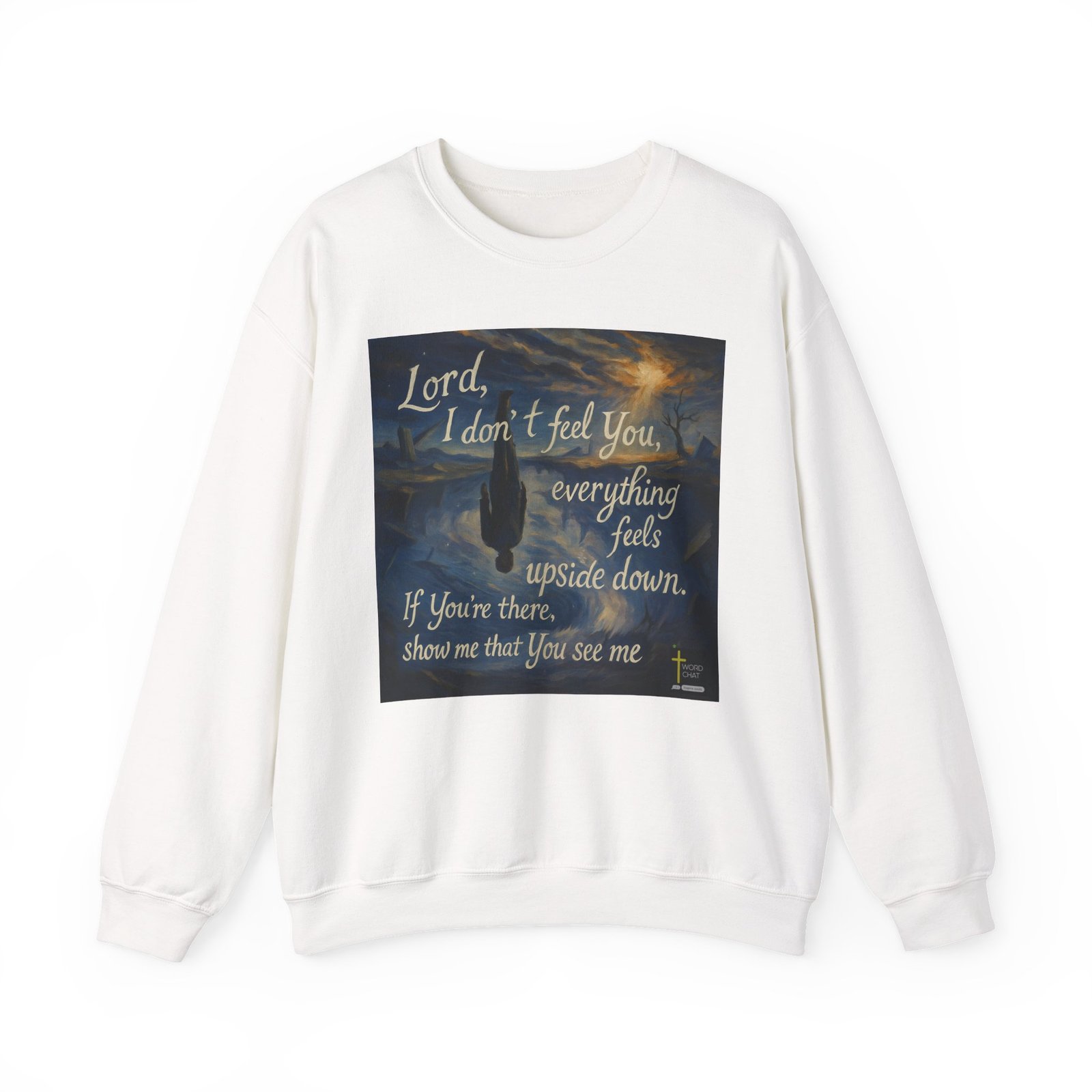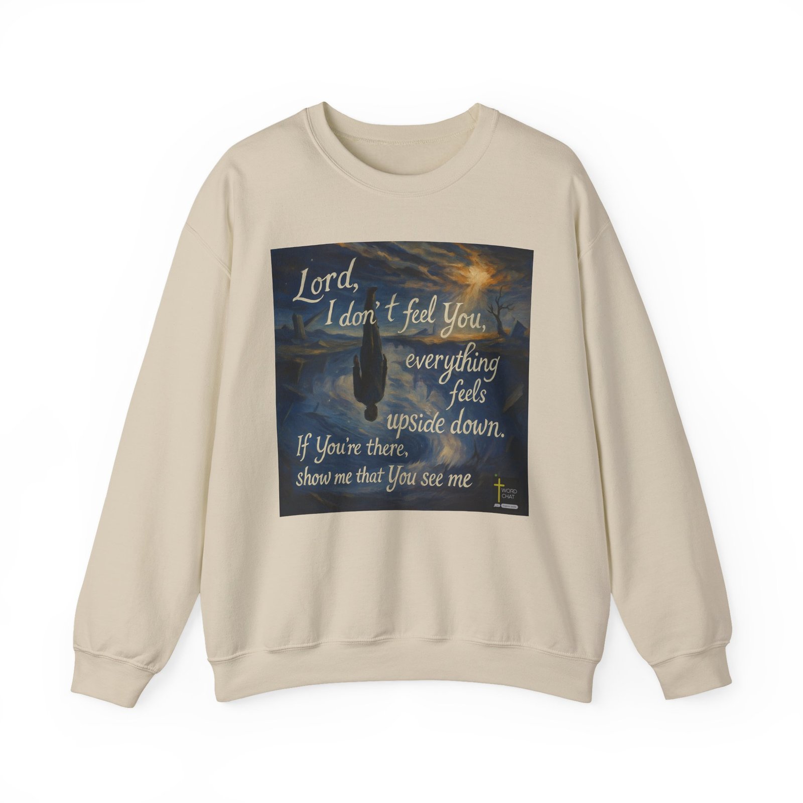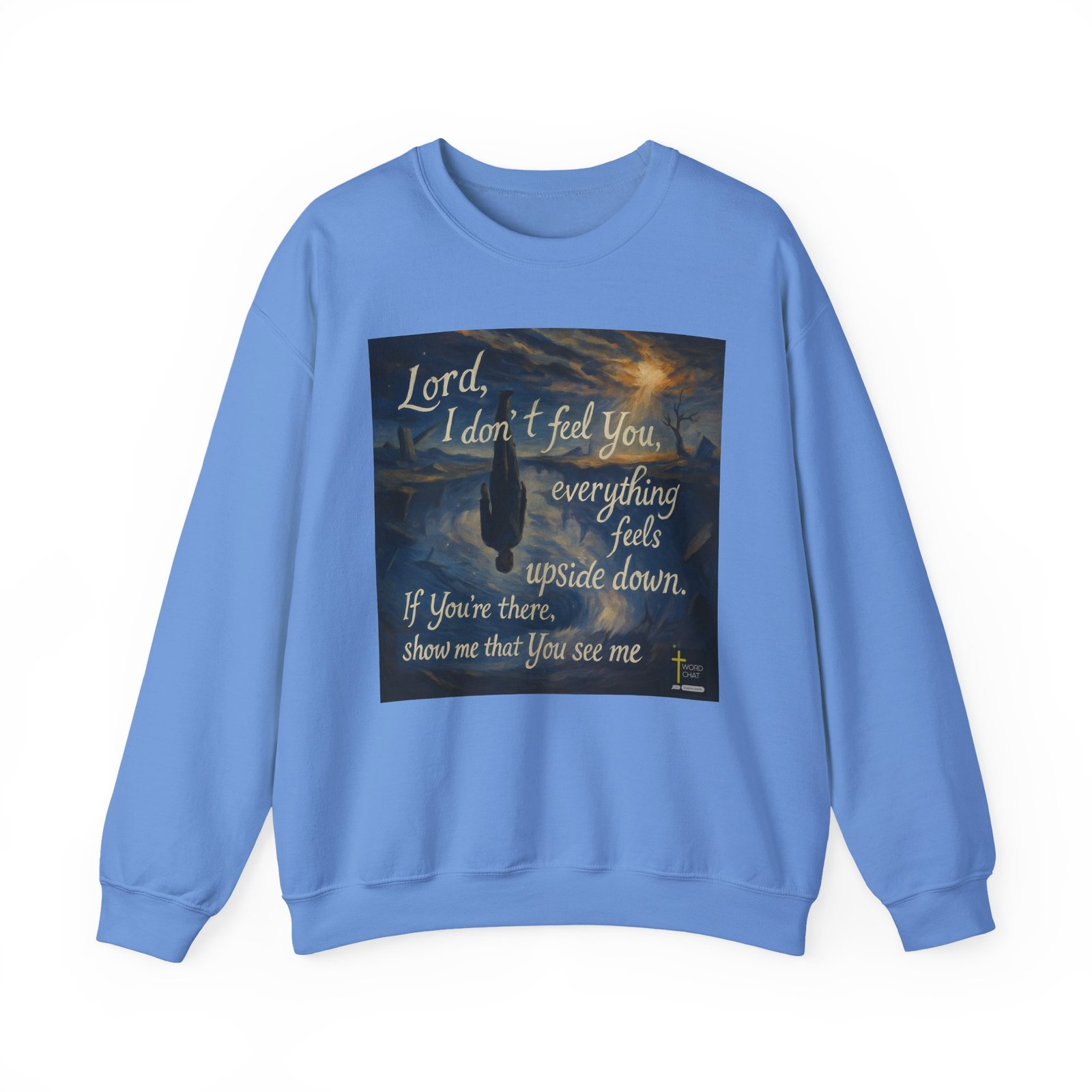 This poignant religious artwork features a solitary figure in dark robes standing in a desolate, dream-like landscape rendered in deep blues and golden tones. The composition overlays inspirational text reading “Lord, I don’t feel You, everything feels upside down. If You’re there, show me that You see me,” expressing profound spiritual vulnerability and longing for divine connection. The painting style evokes classical religious art with expressive brushstrokes creating an ethereal sky with rays of light breaking through dark clouds above. A luminous cross symbol with “WORD CHAT” branding appears in the lower right corner, identifying this as inspirational content from a faith-based digital platform. The overall aesthetic combines melancholic realism with spiritual symbolism, resonating with audiences seeking encouragement during times of doubt and emotional struggle.