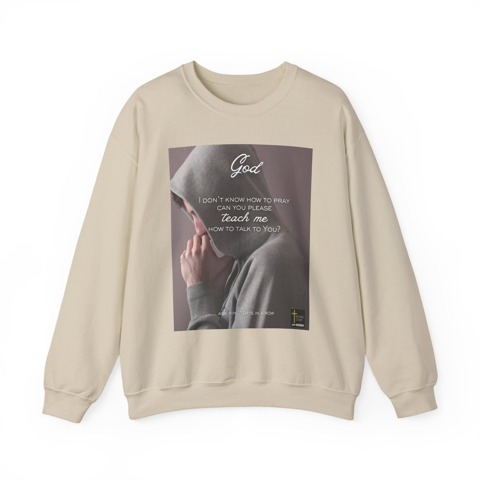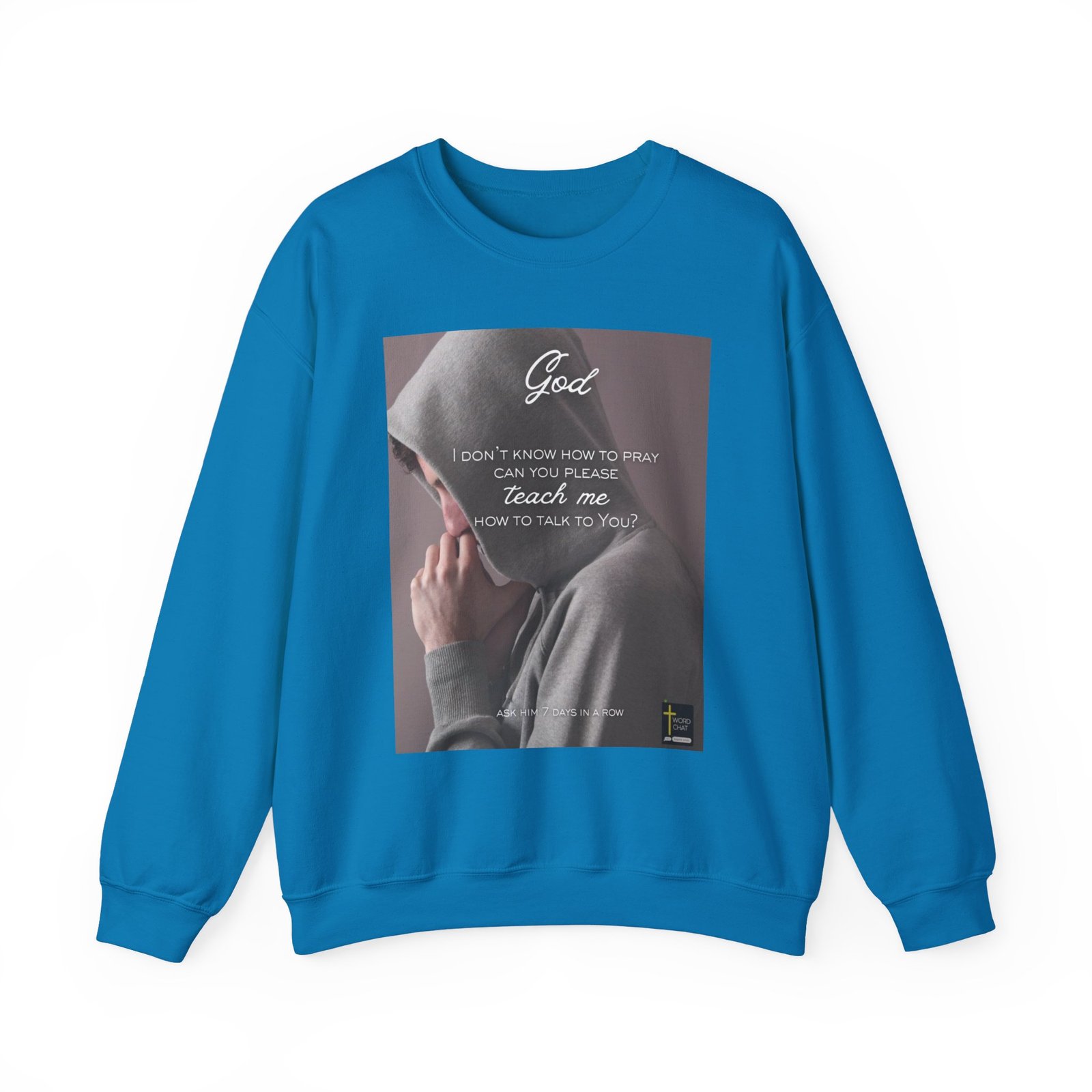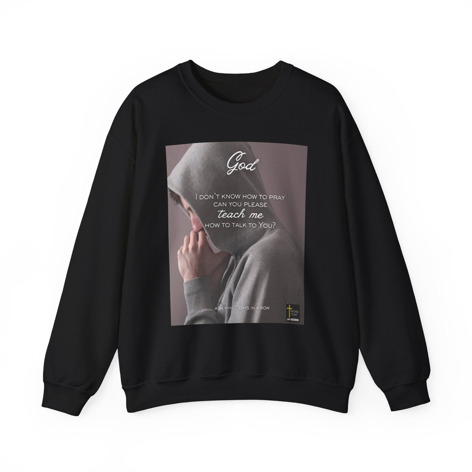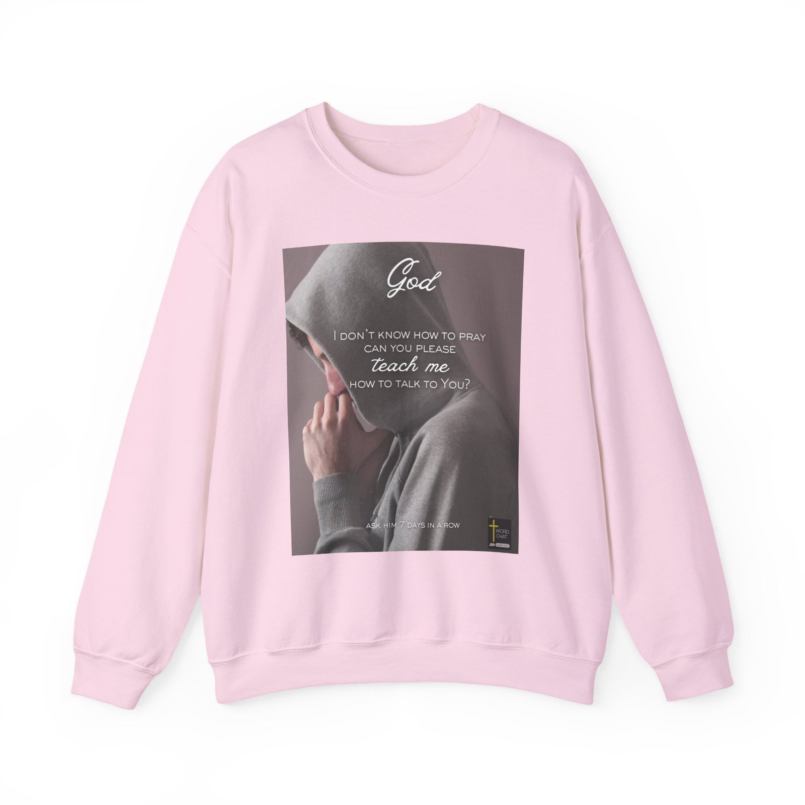 This inspirational religious image features a person in a gray hoodie with their hand clasped in prayer position against their chest. The text overlay reads “God, I don’t know how to pray can you please teach me how to talk to You?” followed by “ASK HIM 7 DAYS IN A ROW” at the bottom. The composition uses a soft, muted color palette with a purple-gray background that creates an intimate and contemplative mood. The WordChat logo and ‘inspire souls’ tagline sit in the bottom right corner, showing the brand of this platform for finding and sharing soul stirring messages. The overall design combines photographic imagery with typography to convey a message of spiritual guidance and encouragement for those seeking to deepen their prayer practice.