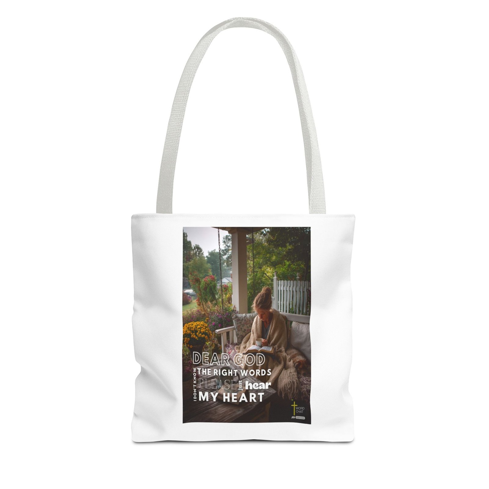This inspirational religious image captures a woman sitting on a porch swing, reading from an open book while holding a warm beverage in a tranquil garden setting. The scene features a cozy autumn atmosphere with vibrant yellow and purple flowers surrounding the covered patio, along with lush green foliage and a white picket fence visible in the background. A small dog rests beside the woman, adding to the peaceful and intimate mood of personal prayer or spiritual reflection. Overlaid text reads “DEAR GOD, I DON’T KNOW THE RIGHT WORDS, PLEASE JUST HEAR MY HEART,” conveying a message of sincere faith and vulnerability in spiritual communication. The WordChat logo and ‘inspire souls’ tagline sit in the bottom right corner, showing the brand of this platform for finding and sharing soul stirring messages.