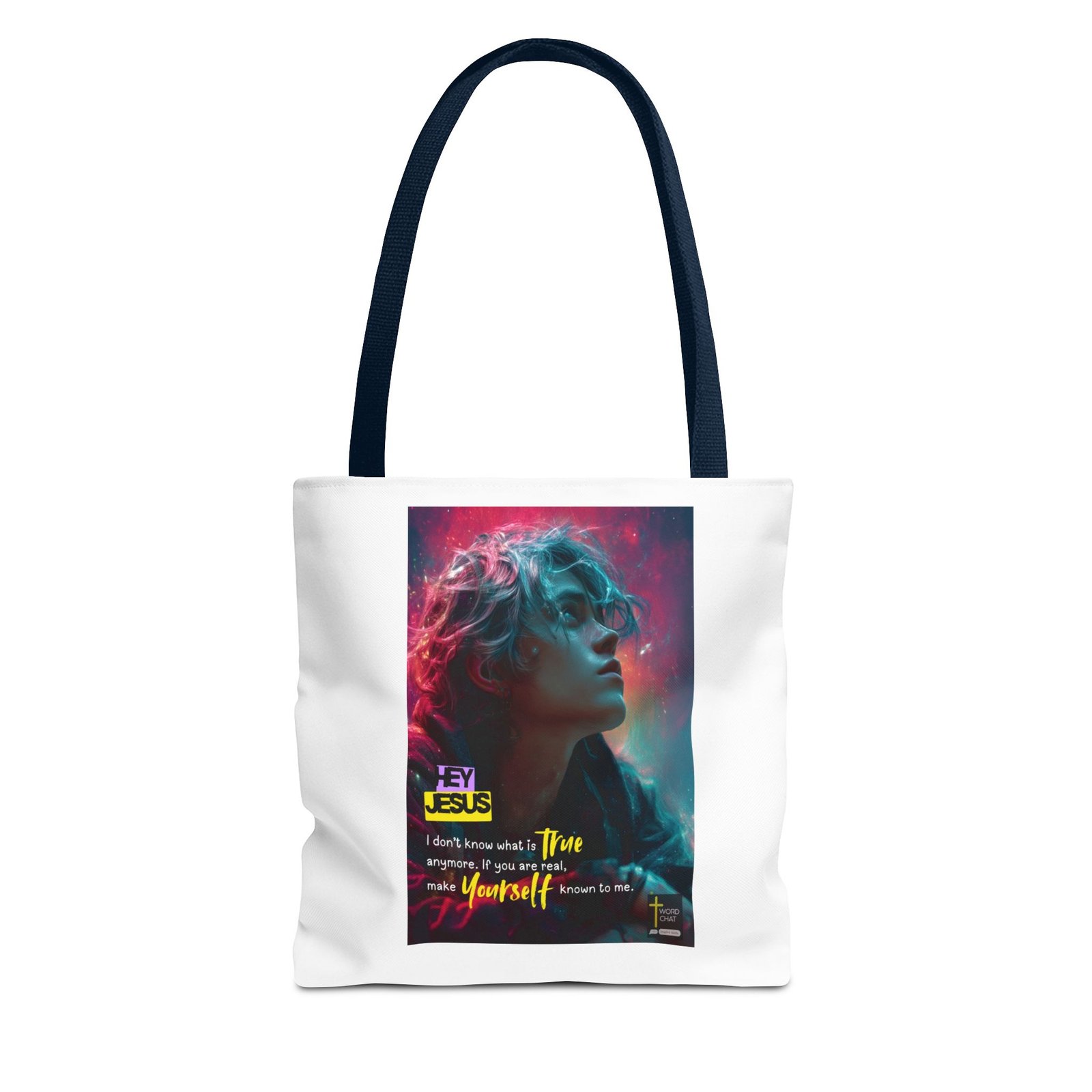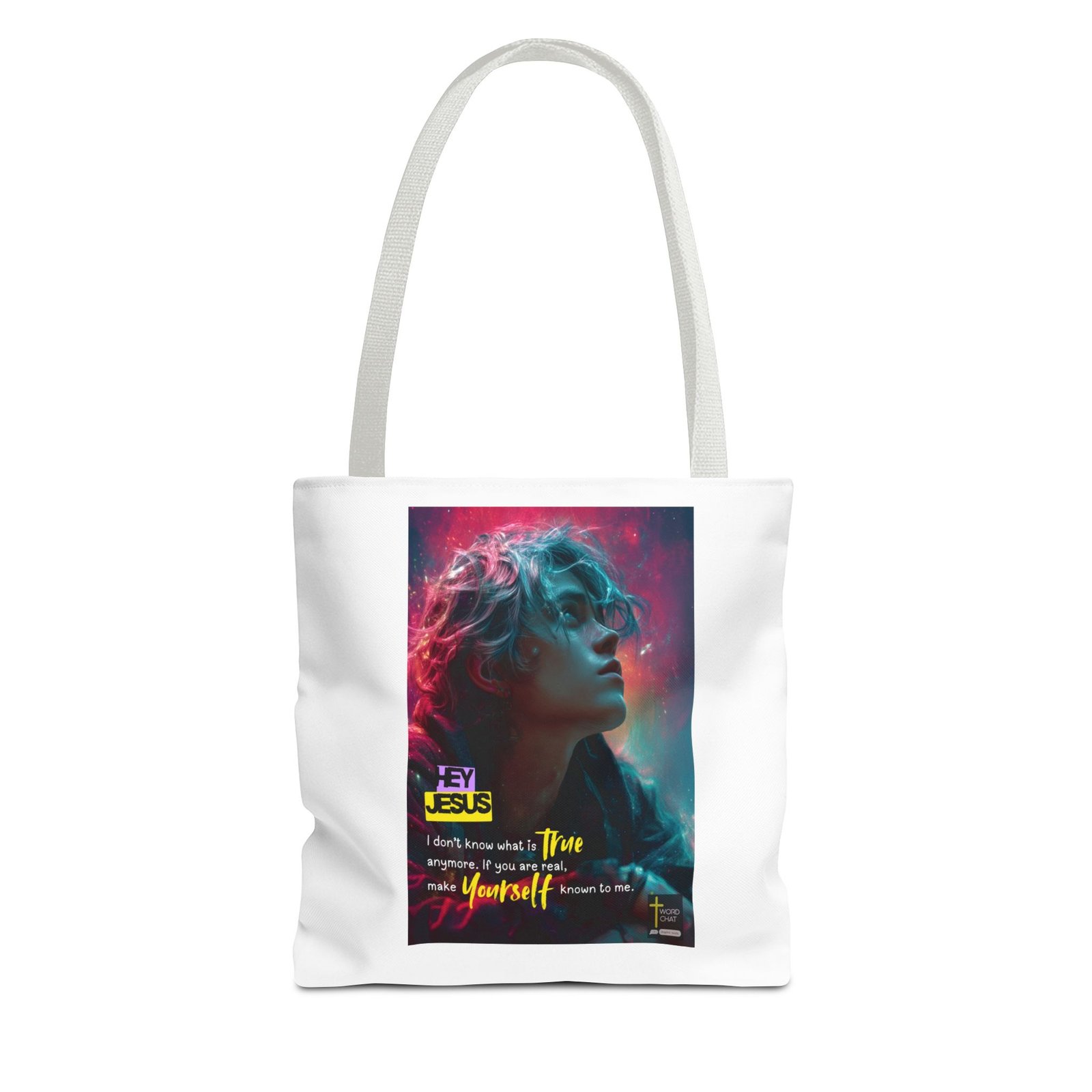 This vibrant digital artwork features a profile portrait of a person with voluminous, wavy hair illuminated by striking neon pink and cyan lighting effects against a cosmic background. The image employs a modern cyberpunk aesthetic with glowing particles and ethereal light trails that create a dreamy, otherworldly atmosphere. The styling combines contemporary digital art with inspirational messaging, featuring high-contrast colors and professional gradient lighting that transitions from magenta to teal. Bold yellow and purple text overlays include the phrases “HEY JESUS,” “I don’t know what is true anymore,” “make Yourself known to me,” and the “WORDCHAT” watermark in the corner. The WordChat platform for finding and sharing soul stirring messages.