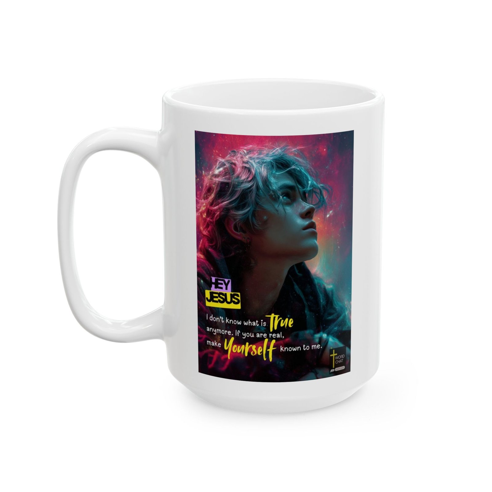 This striking digital artwork features a profile portrait of a person with voluminous, wavy hair illuminated by vibrant neon pink and cyan lighting effects. The composition uses a cosmic background with glowing particles and ethereal energy wisps that create a modern, spiritually-themed aesthetic. Bold yellow and purple text overlays deliver an inspirational message reading “Hey Jesus, I don’t know what is true anymore. If you are real, make yourself known to me,” accompanied by the “Word Chat” branding and “Inspire souls” tagline. The image combines contemporary digital design with religious messaging, utilizing high-contrast neon colors and cinematic lighting to evoke an emotional, thought-provoking tone. This style of motivational graphic is typically shared on social media platforms for spiritual and personal development.