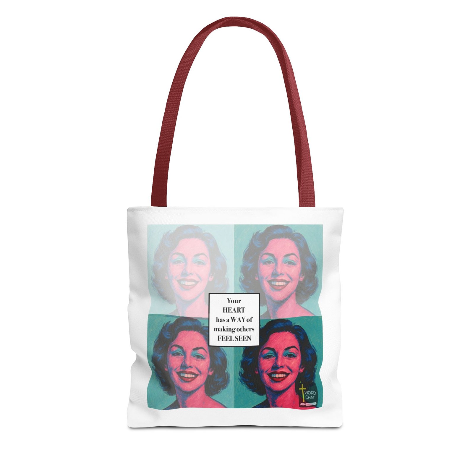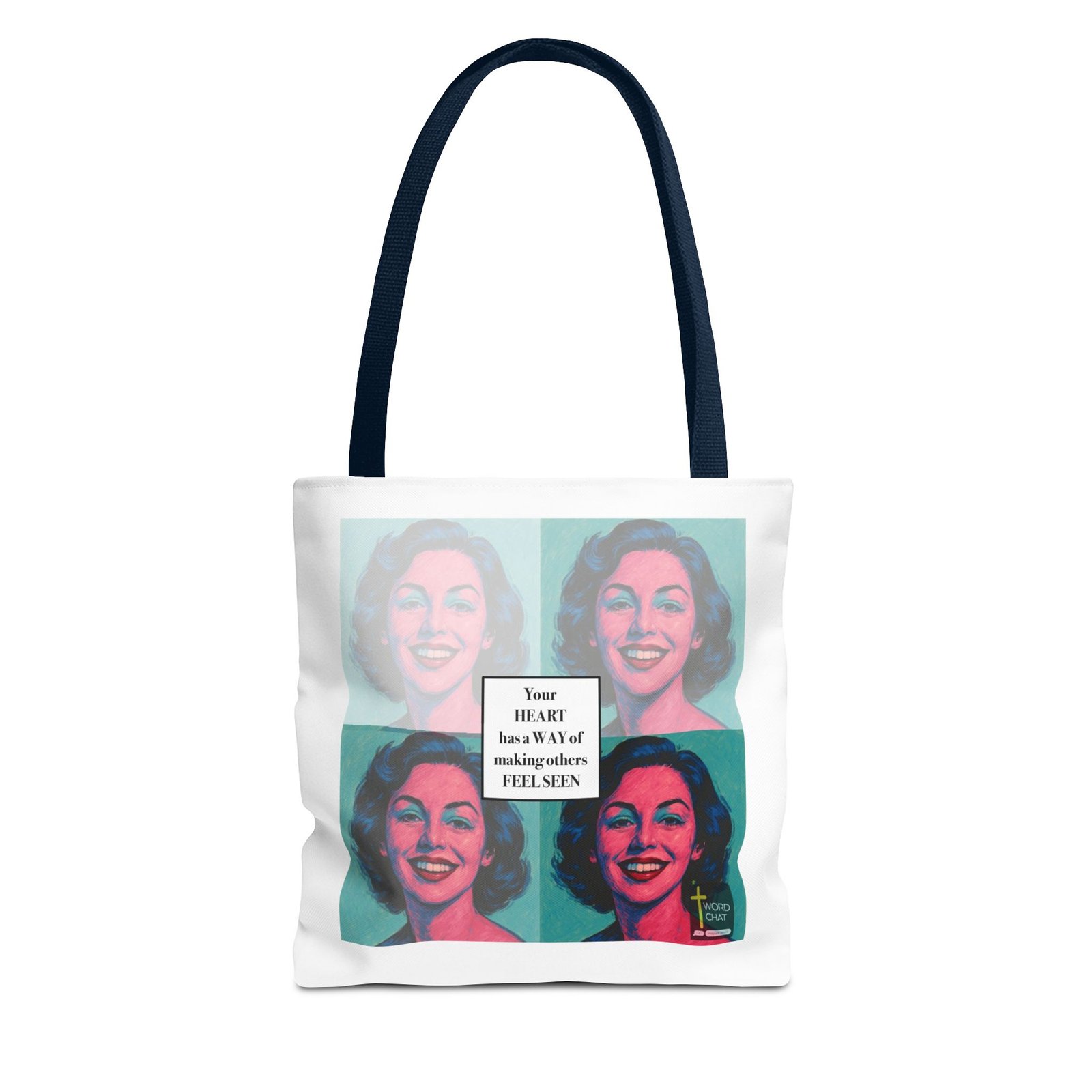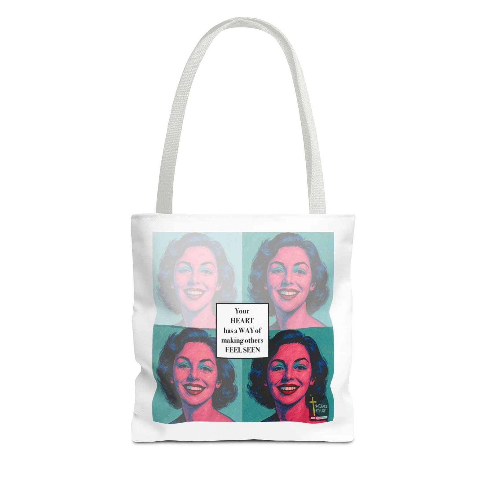 This vibrant pop art image features a four-panel grid layout inspired by Andy Warhol’s iconic style, displaying the same woman’s portrait in different color variations of pink, blue, and teal. Each panel showcases a smiling woman with wavy mid-length dark hair, rendered in bold, contrasting hues typical of 1960s pop art aesthetics. The center of the composition contains an overlaid white text box with the inspirational message “Your HEART has a WAY of making others FEEL SEEN” in black serif typography. The WordChat logo appears in the bottom right corner, identifying this as motivational or spiritual content designed for social media sharing. The artwork combines classical pop art techniques with contemporary inspirational messaging, creating an uplifting visual perfect for wellness, mental health, or faith-based communications.