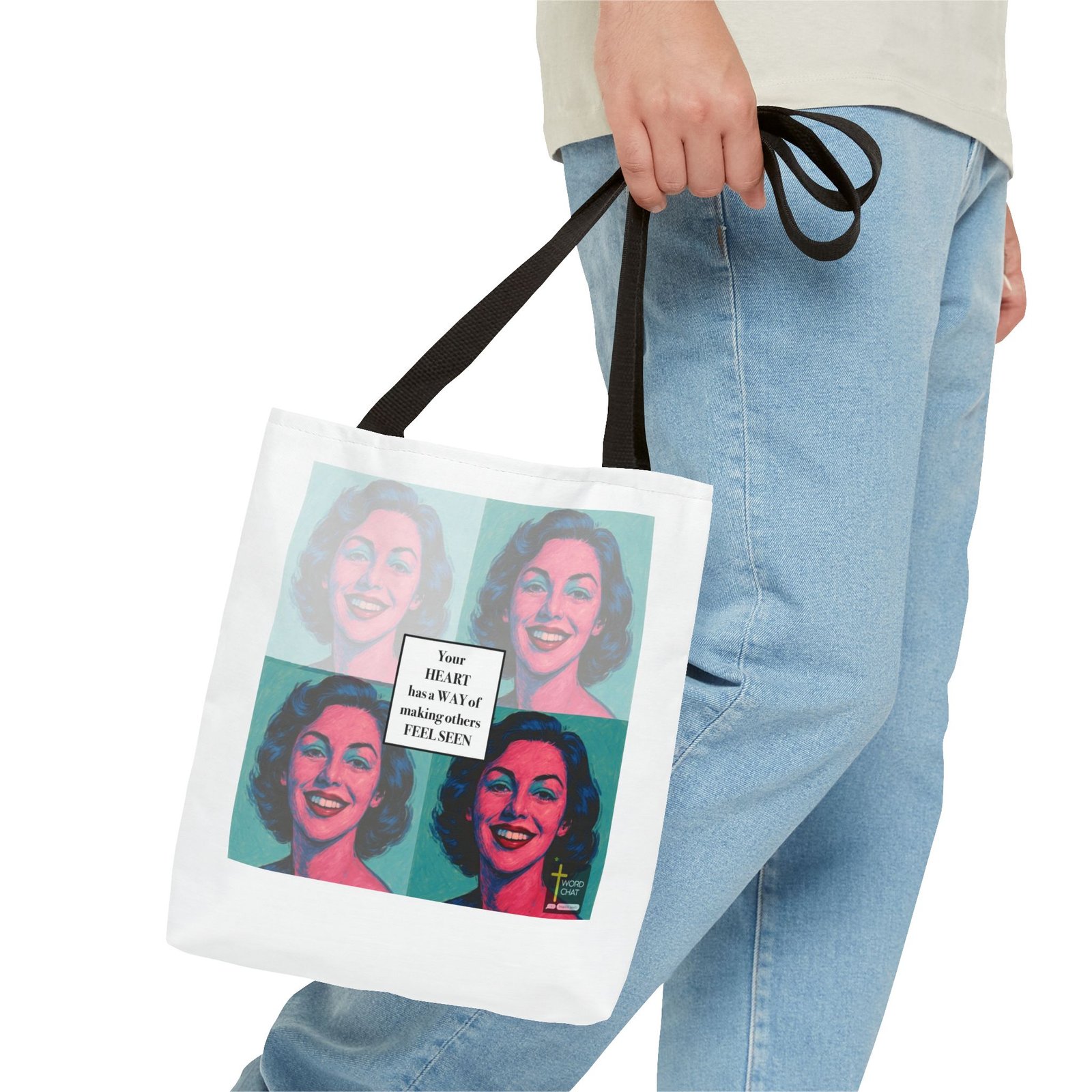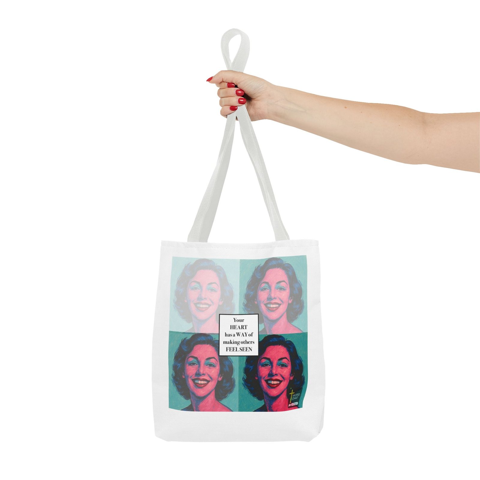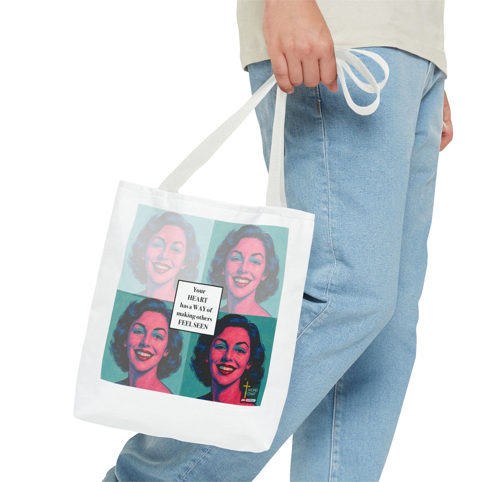 This vibrant pop art image features a four-panel grid layout inspired by Andy Warhol’s iconic style, displaying the same woman’s portrait in different color variations of pink, blue, and teal. Each panel showcases a smiling woman with wavy mid-length dark hair, rendered in bold, contrasting hues typical of 1960s pop art aesthetics. The center of the composition contains an overlaid white text box with the inspirational message “Your HEART has a WAY of making others FEEL SEEN” in black serif typography. The WordChat logo appears in the bottom right corner, identifying this as motivational or spiritual content designed for social media sharing. The artwork combines classical pop art techniques with contemporary inspirational messaging, creating an uplifting visual perfect for wellness, mental health, or faith-based communications.