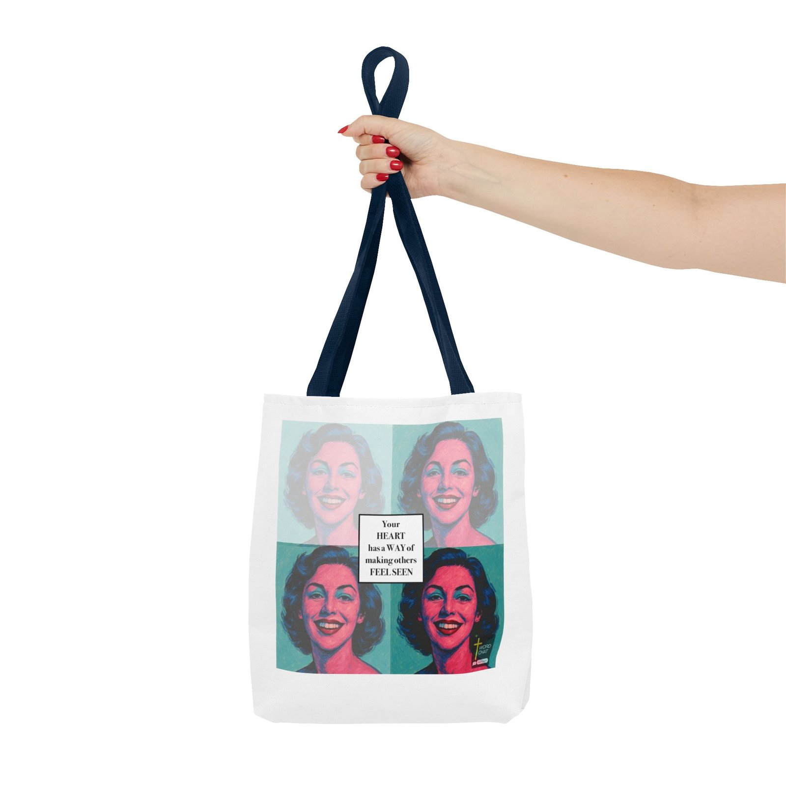 This 13″ x 13″ canvas tote adds both functionality and style. These custom-printed tote bags come with multiple handle color options to match your favorite WordChat image. Made with spun polyester, each bag features double-stitched seams, cotton webbing straps, and a nonwoven laminate lining for high-end durability. The all-over print is created using dye sublimation for vivid, long-lasting visuals.