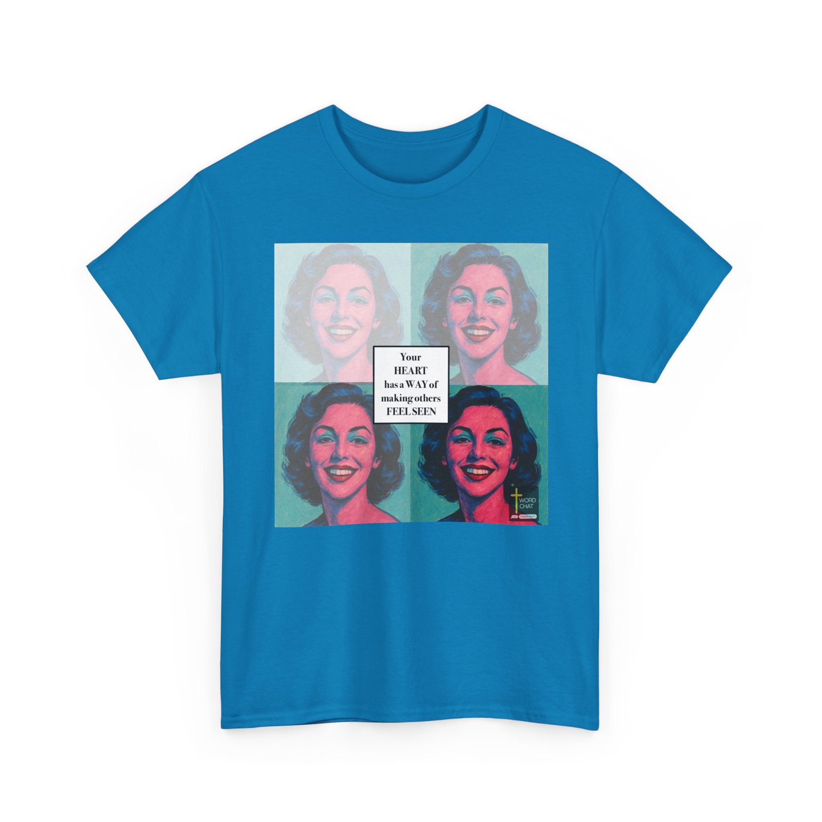 This image features a pop art-style portrait displayed in a four-panel grid layout, reminiscent of Andy Warhol’s iconic silkscreen printing technique. Each panel presents the same woman’s face with varying color combinations of vibrant pinks, teals, blues, and earth tones against different pastel backgrounds. The portrait showcases bold, simplified features with bright pink skin tones, defined facial features, and styled wavy hair characteristic of mid-20th century aesthetics. A centered white text box overlays the composition with the inspirational message “Your HEART has a WAY of making others FEEL SEEN,” promoting emotional connection and empathy. The image includes a WordChat logo with a cross symbol in the bottom right corner, identifying it as motivational content designed to inspire and uplift viewers.