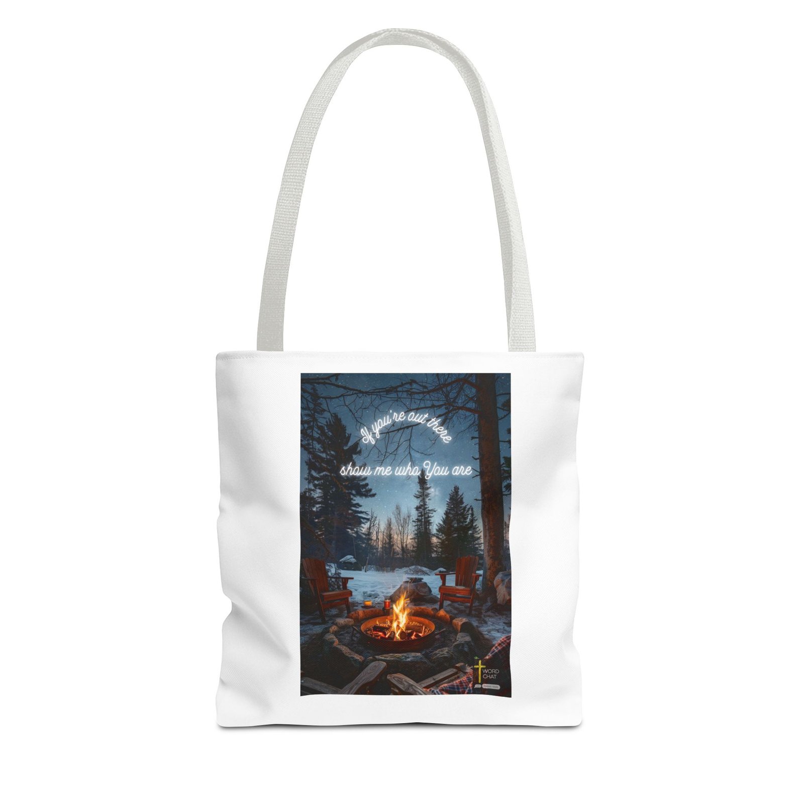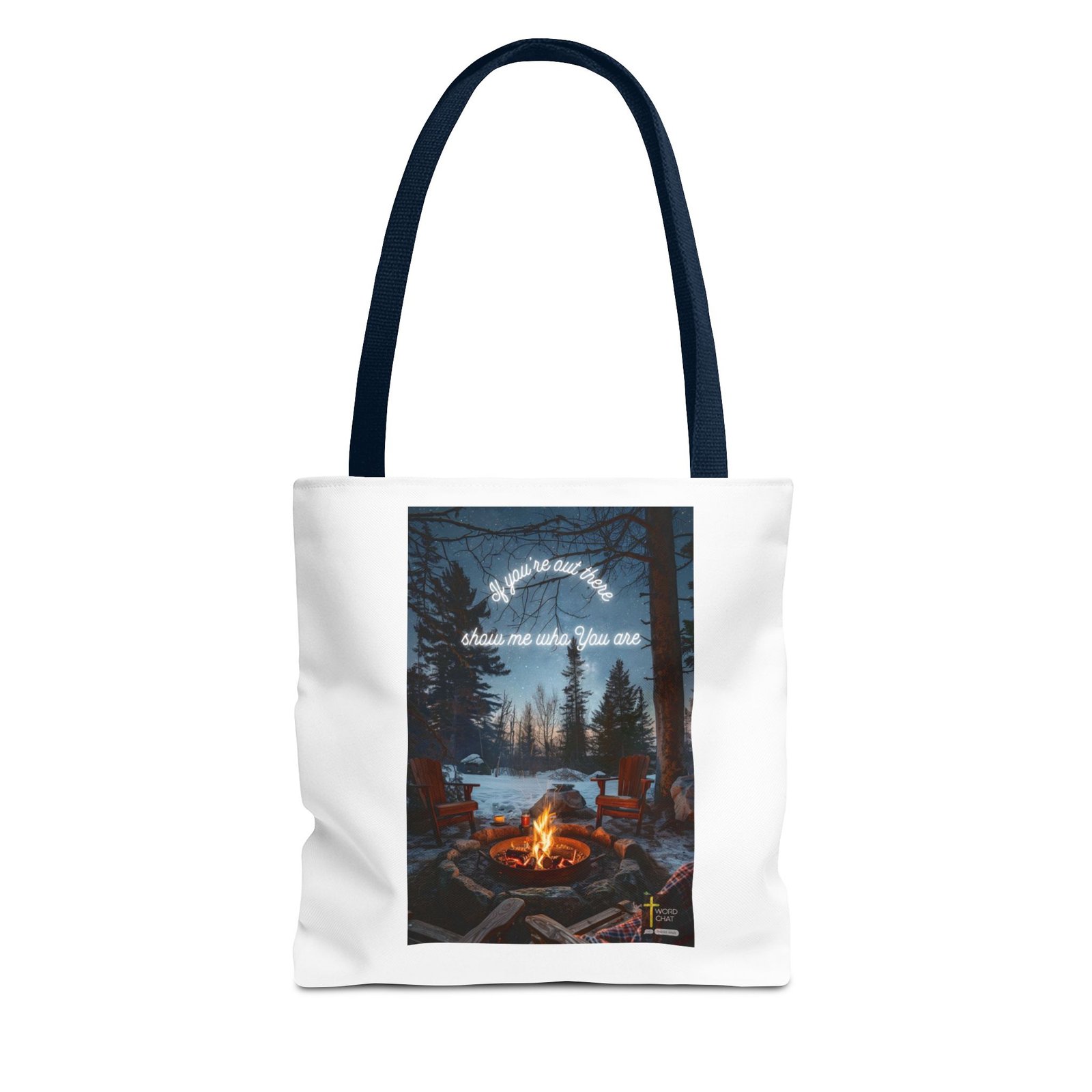 This stunning winter landscape photograph captures a serene outdoor campfire gathering beneath a starlit night sky, featuring two orange Adirondack chairs positioned around a glowing fire pit surrounded by stones. The scene is set in a snow-covered forest with tall pine and evergreen trees, a distant cabin, and twinkling stars overhead, creating a peaceful retreat atmosphere. Glowing neon text overlays the image in elegant white script reading “If you’re out here, show me who You are,” adding an inspirational and motivational element to the composition. The image showcases a blend of natural winter photography with modern digital design, combining warm firelight, cool blue twilight tones, and glowing neon aesthetics. The WordChat logo and ‘inspire souls’ tagline sit in the bottom right corner, showing the brand of this platform for finding and sharing soul stirring messages.