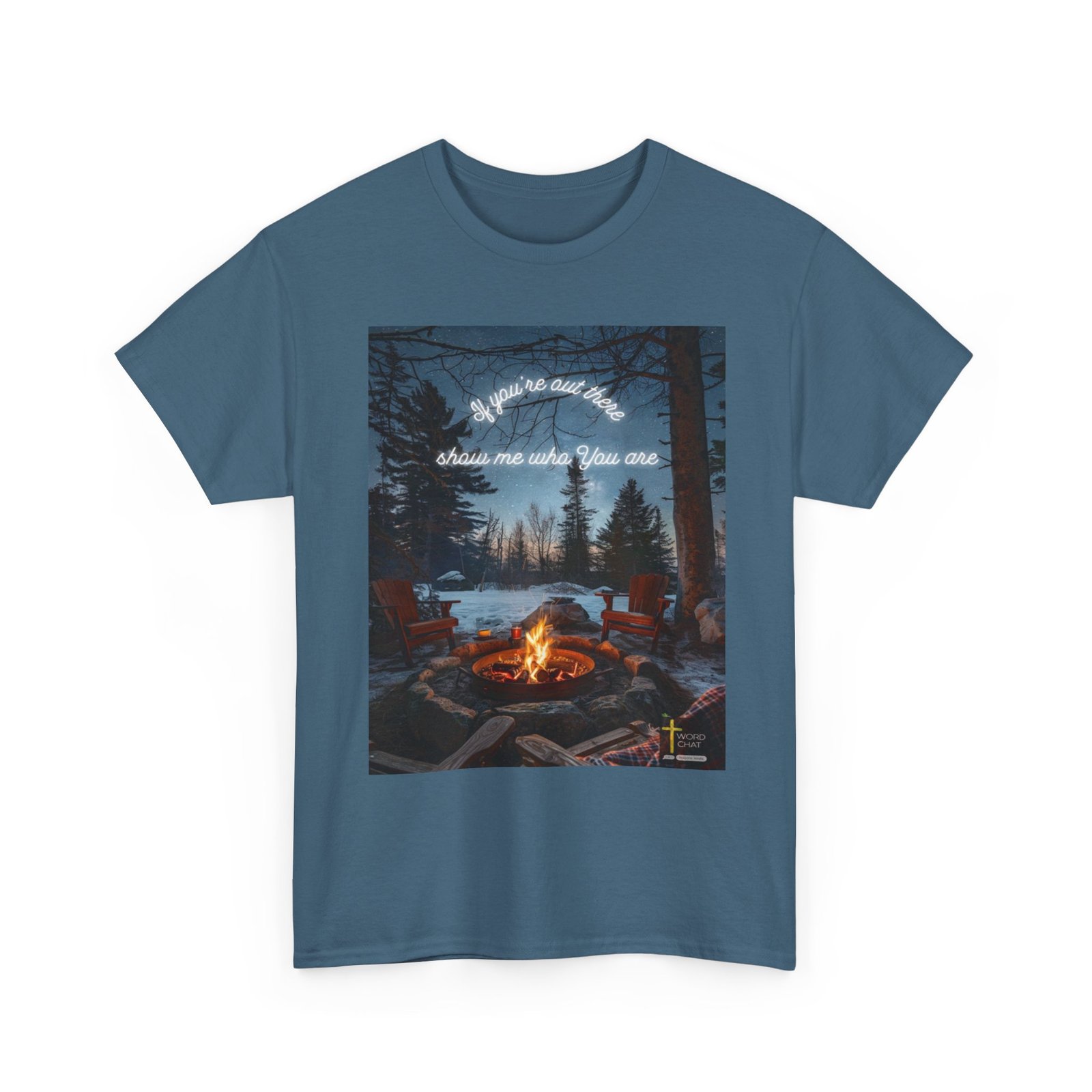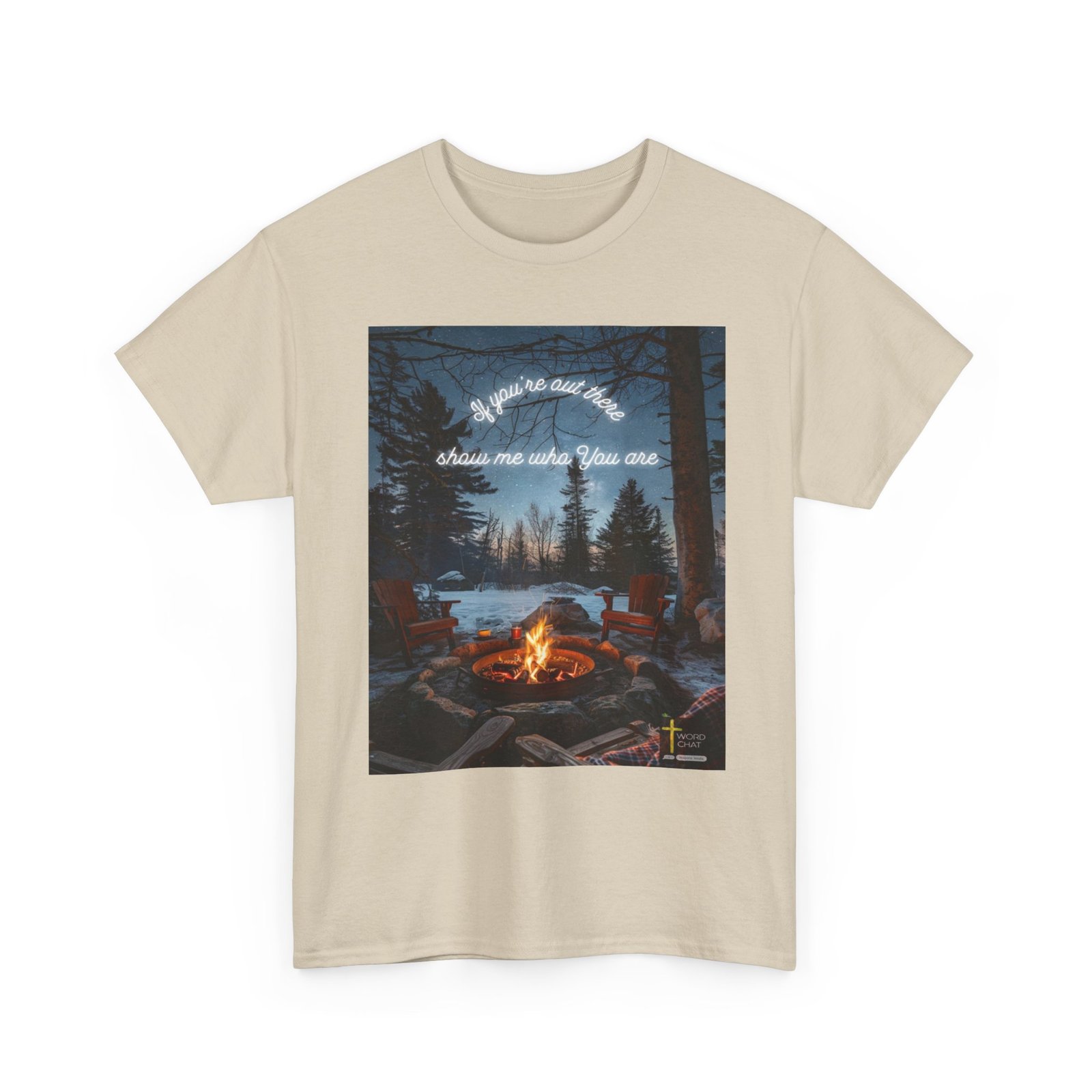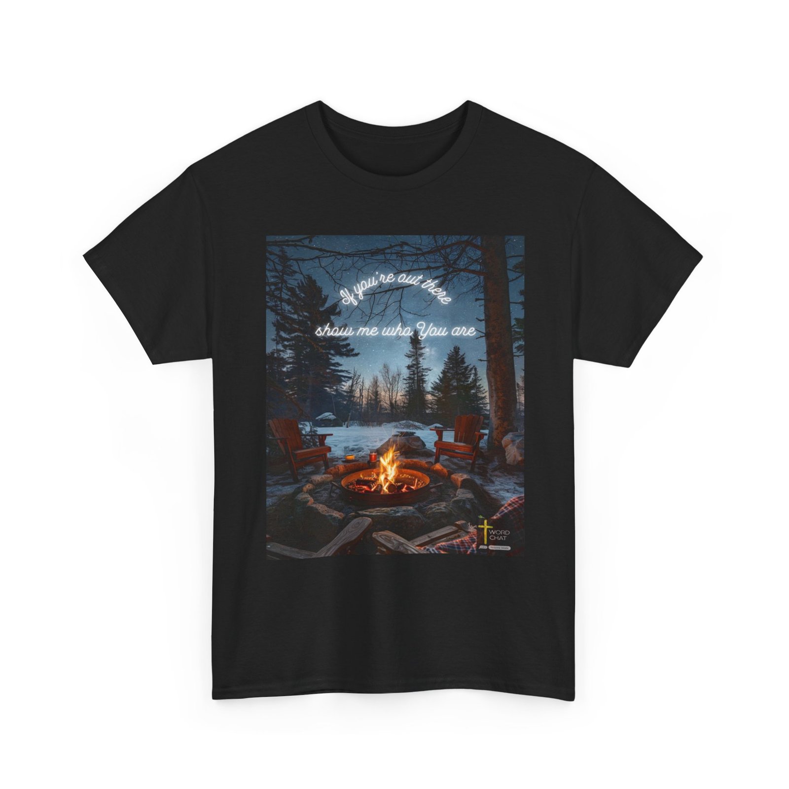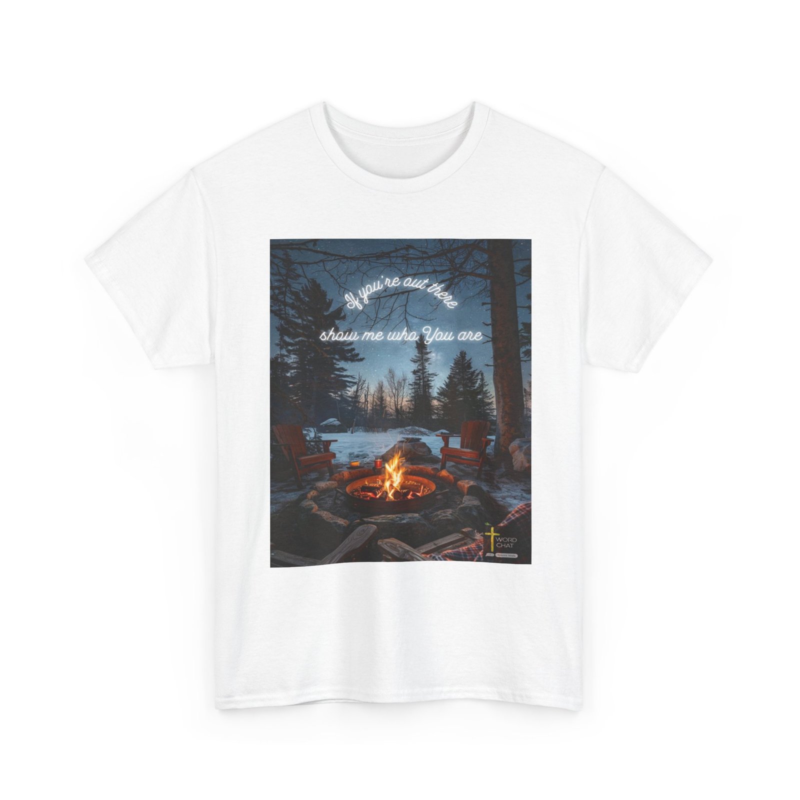 This stunning winter landscape features a glowing campfire surrounded by red Adirondack chairs in a snowy forest setting at night. The scene is enhanced with white neon text reading “If you’re out here, show me who you are” overlaid against a starlit sky filled with countless twinkling stars. Tall evergreen and bare trees frame the composition, while a frozen lake and distant cabin are visible in the background, creating a serene wilderness atmosphere. Illuminated candles and wooden logs border the fire pit, adding warmth and ambiance to this contemplative outdoor scene. The WordChat logo and ‘inspire souls’ tagline sit in the bottom right corner, showing the brand of this platform for finding and sharing soul stirring messages.