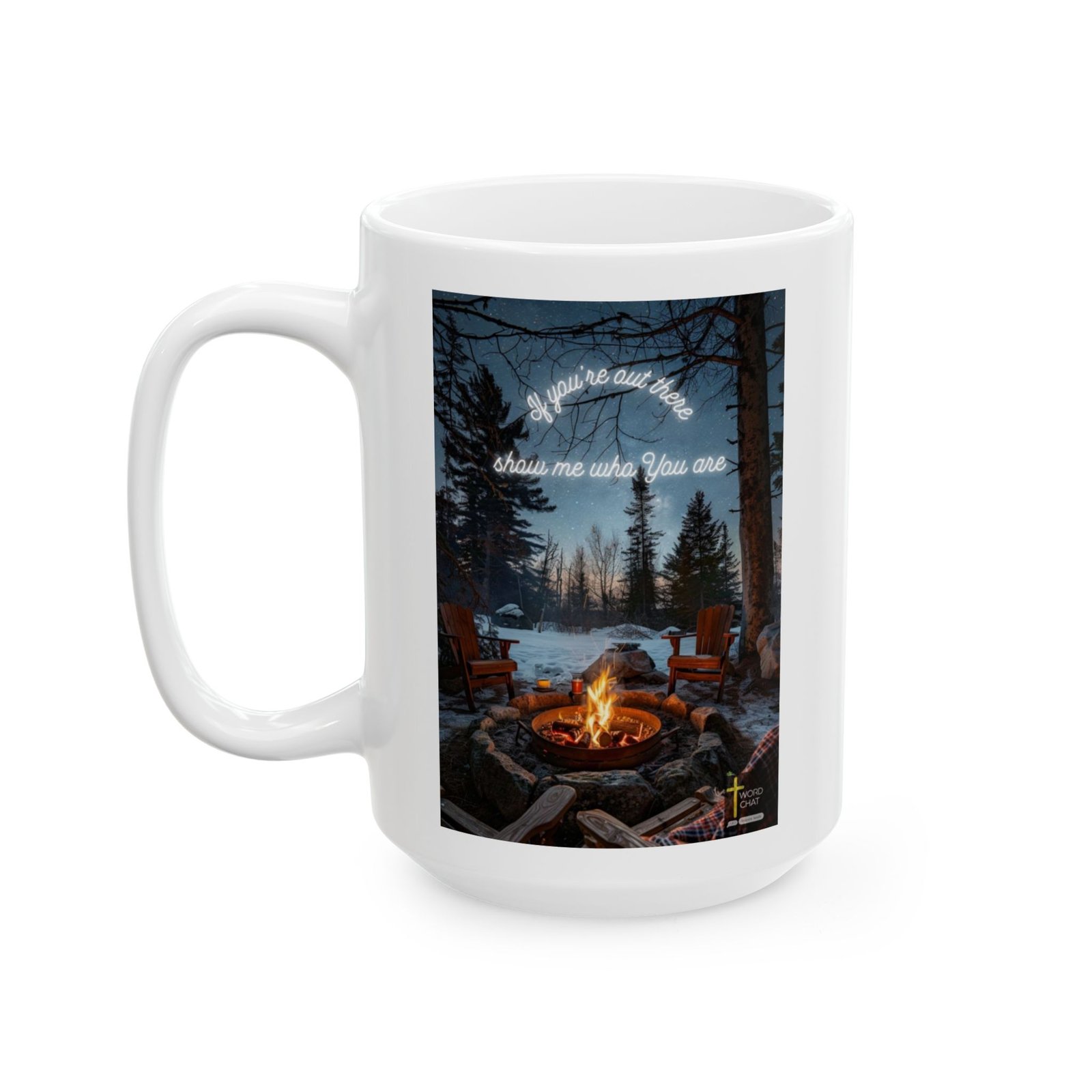 This stunning winter landscape photograph captures a cozy campfire gathering surrounded by tall pine trees and snow-covered terrain under a starlit night sky. The composition features two red wooden Adirondack chairs positioned on either side of a metal fire pit with an active flame, creating a warm focal point against the cold environment. Neon text overlay reading “If you’re out here show me who You are” glows softly above the scene, adding an inspirational and motivational element to the natural wilderness setting. The image combines elements of outdoor adventure, relaxation, and spiritual reflection, with candles and wooden logs visible around the fire pit. The overall aesthetic blends modern digital art with rustic nature photography, appealing to audiences interested in camping, wilderness experiences, and inspirational lifestyle content. The WordChat logo and ‘inspire souls’ tagline sit in the bottom right corner, showing the brand of this platform for finding and sharing soul stirring messages.